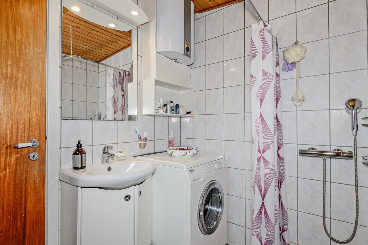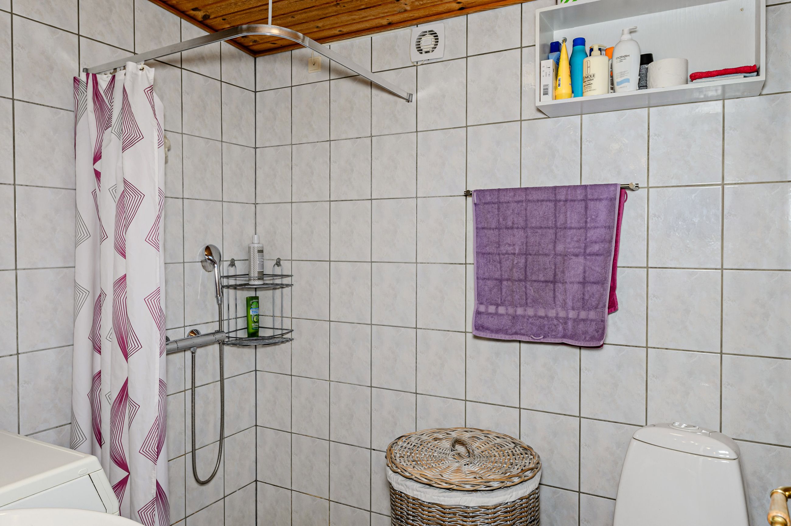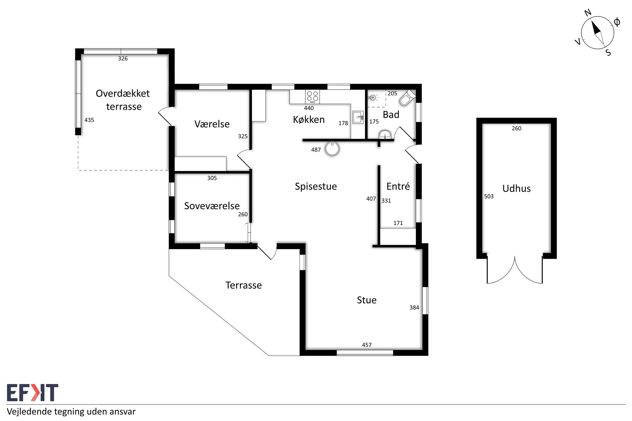 Villaen er opført med facader i træbeklædning, tagpaptag og døre/vinduer med termo-/energiglas. Indretning uden spildplads: Entre med skabe, nydeligt badeværelse med lyse fliser til loftet, bruseniche, gulvvarme og plads til vaskemaskine, velindrettet køkken med lyse elementer pålagt en praktisk bordplade samt afsætningsplads til varme gryder, virkelig hyggelig spisestue med plads til et stort bord, brændeovn og helt ny luft til luft varmepumpe, rigtig hyggelig stue med plads til sofagruppe og stort TV, soveværelse, stort værelse med skabsvæg og udgang til den overdækkede terrasse. Trægulve og trælofter.
