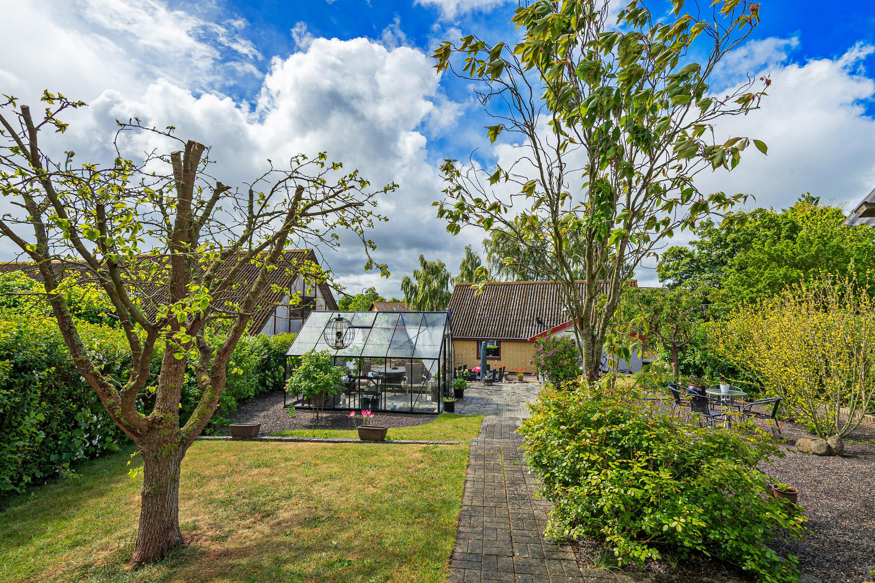 Bag boligen ligger den hyggelig gårdhave med højbed og overdækket areal til aftenhygge. Fra gårdhaven går man videre til den smukke have, som ligger roligt og ugeneret. Her er der mange forskellige blomster og varierende beplantning, et isoleret udhus/værksted og et solrigt "driverhus", hvor sol og udsigt til haven kan nydes det meste af året.