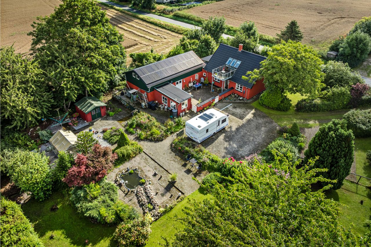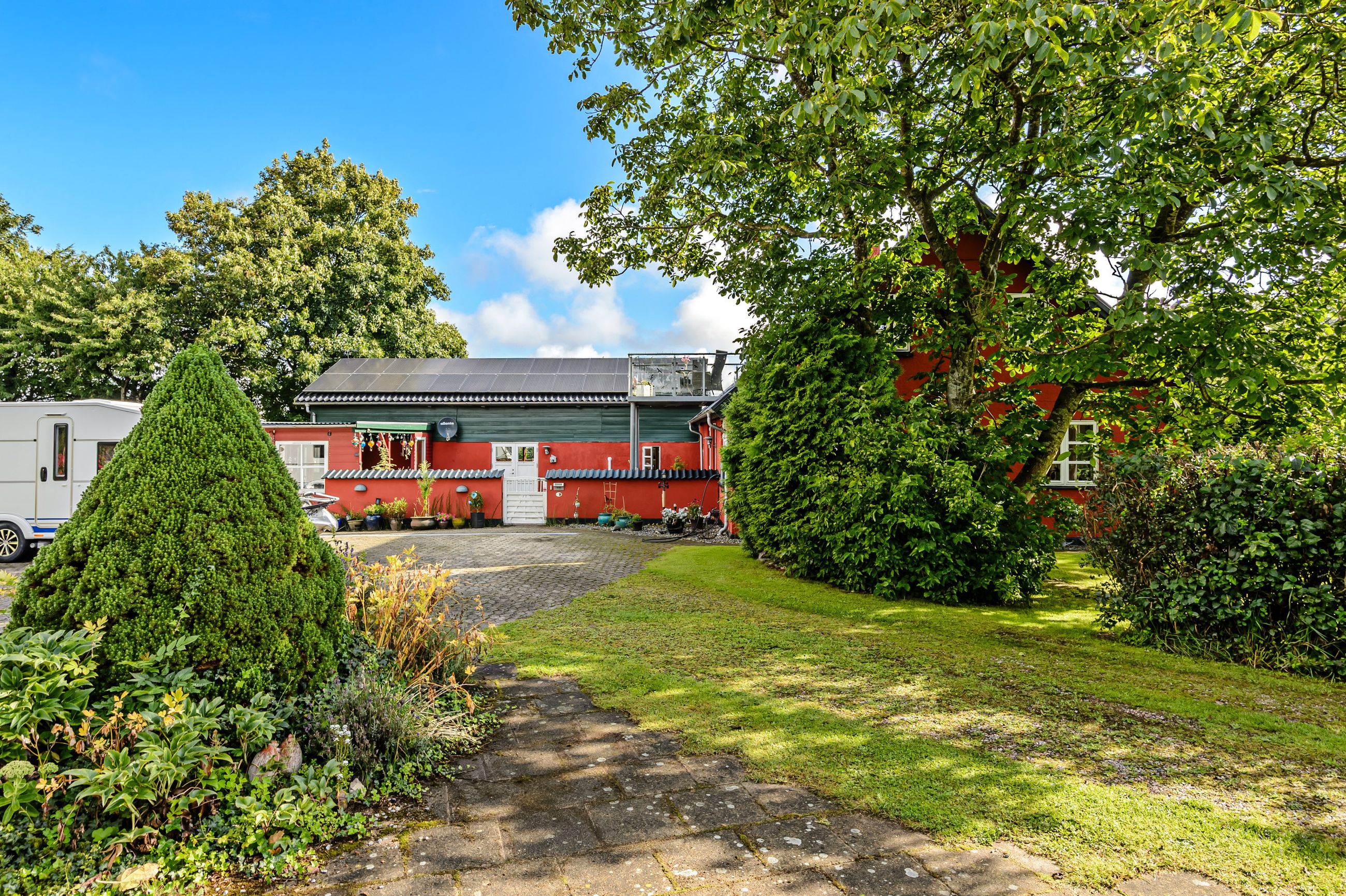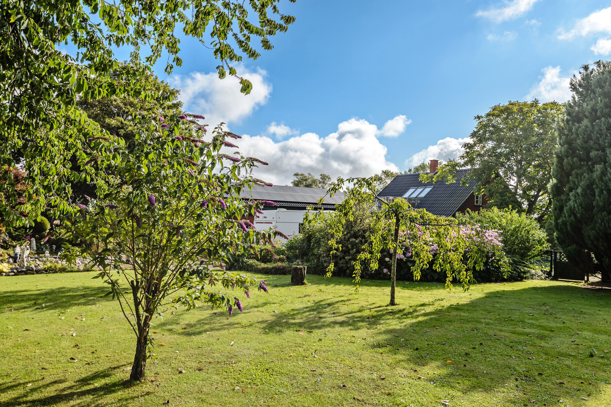 Haven ligger sydvestvendt og direkte op til åbne marker, og selve jendommen ligger tilbagetrukket fra lille vej - helt ugeneret og med kun 1 direkte nabo. Haven er fuld med blomster, buske, træer, bede, frugttræer, fiskebassin, afdeling med vilde blomster, og ved boligen er der anlagt en dejlig, charmerende gårdhave samt en overdækket, læfyldt "havestue". Ved indkørslen ligger en stor p-plads med plads til både biler, campingvogn m.m. Haven er indhegnet og meget velegnet til f.eks. hunde.
