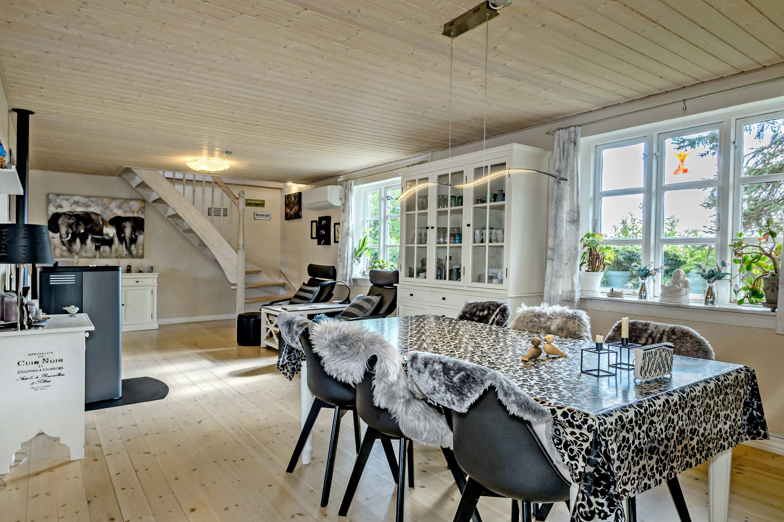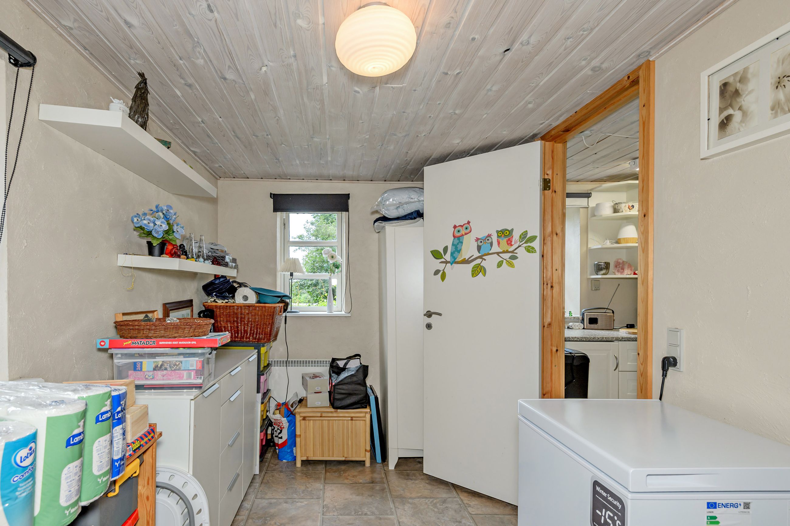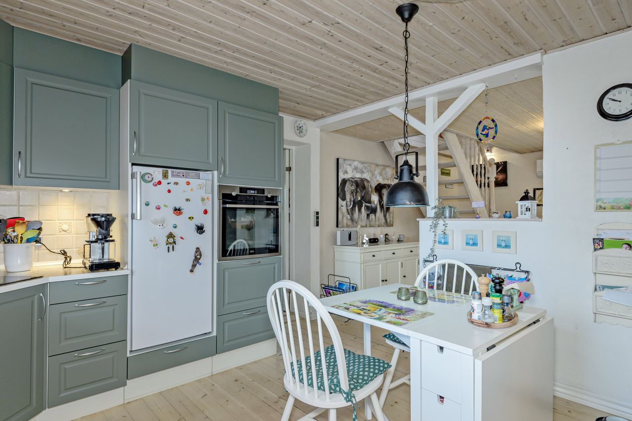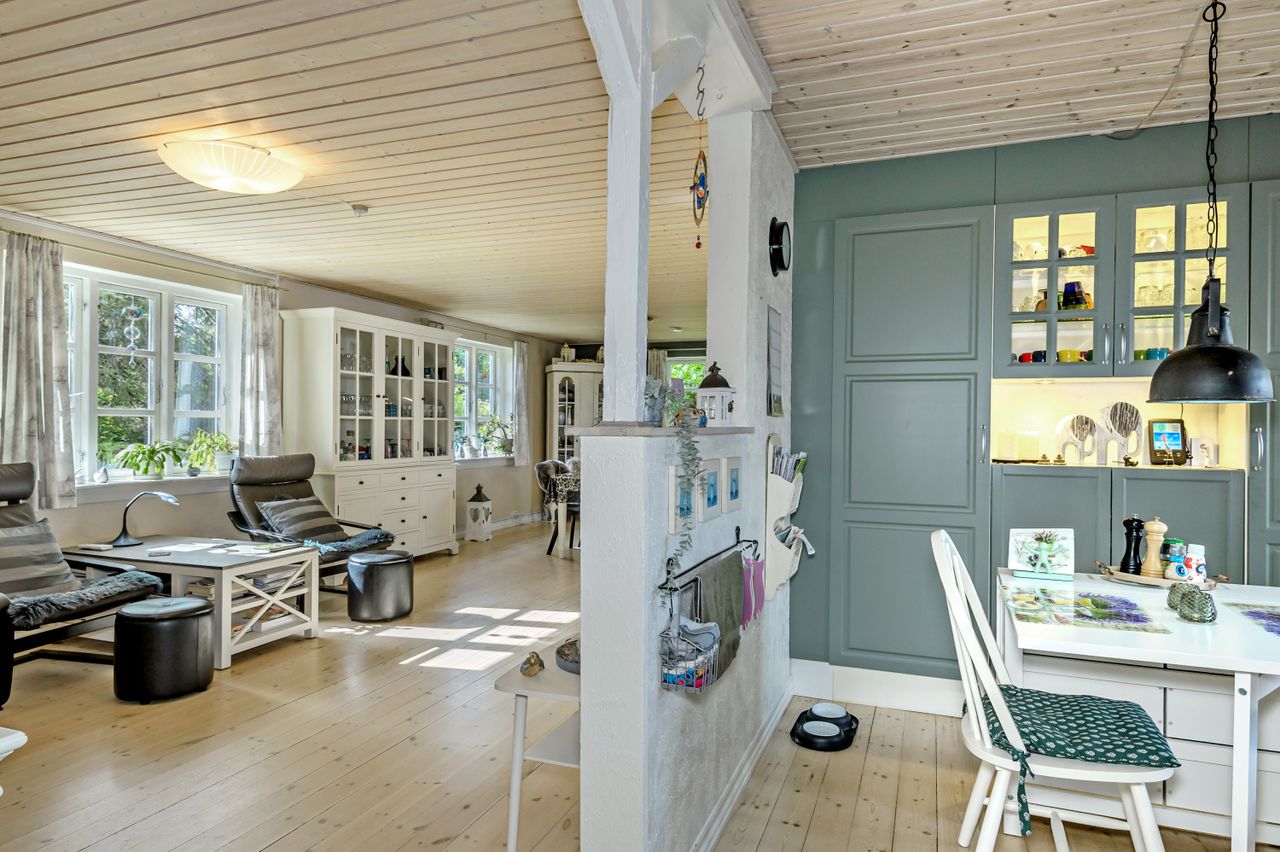 Selve boligen er indrettet med køkken med olivengrønne fyldningslåger, delvist åbent mod stue, stor vinkelstue med trappe til 1.sal, entre, mellemgang/viktualierum, badeværelse med lyse fliser, bruseniche og plads til vaskemaskine/tørretumbler, rummeligt bryggers og kontor/værelse.