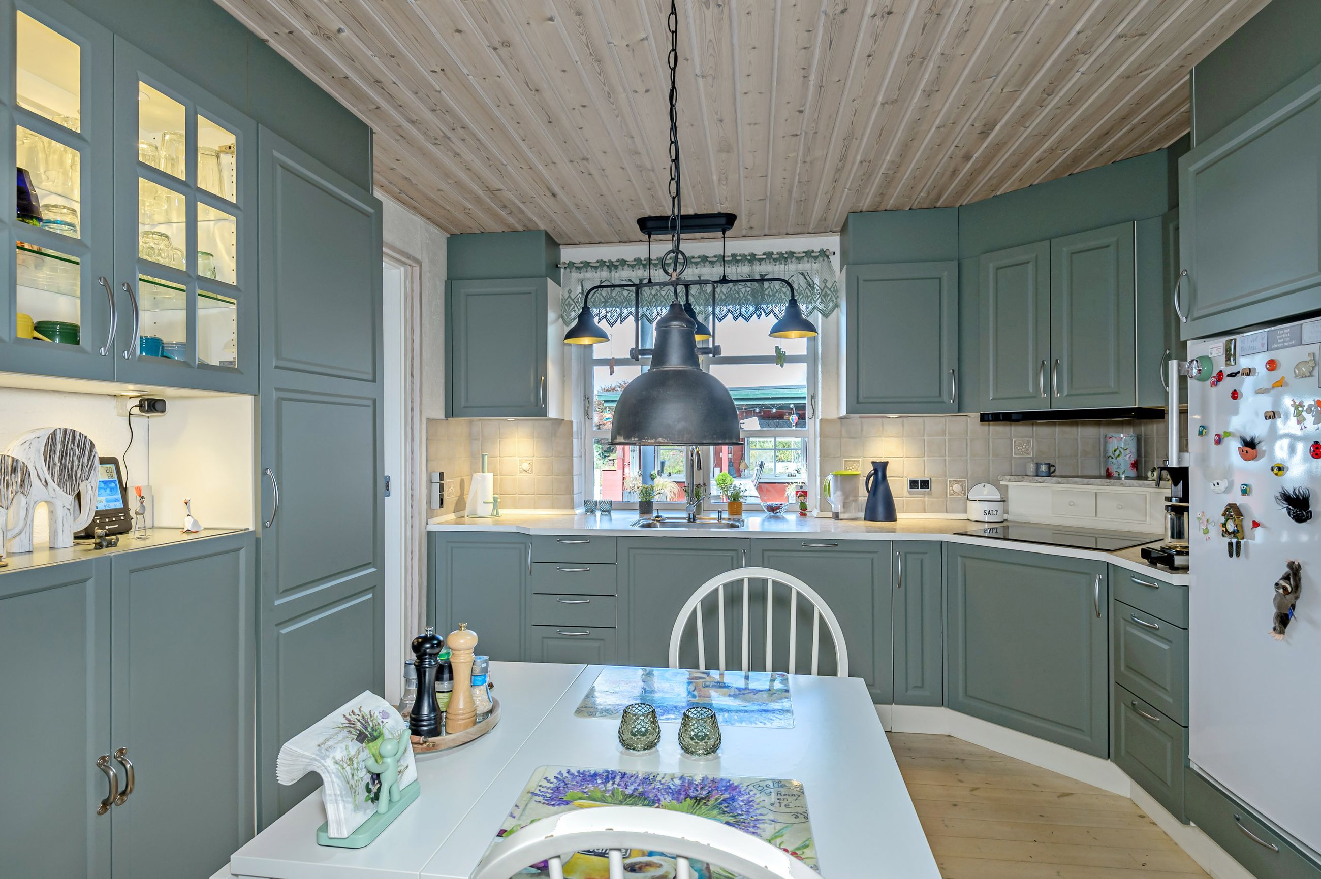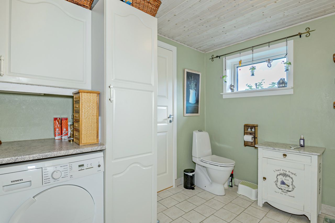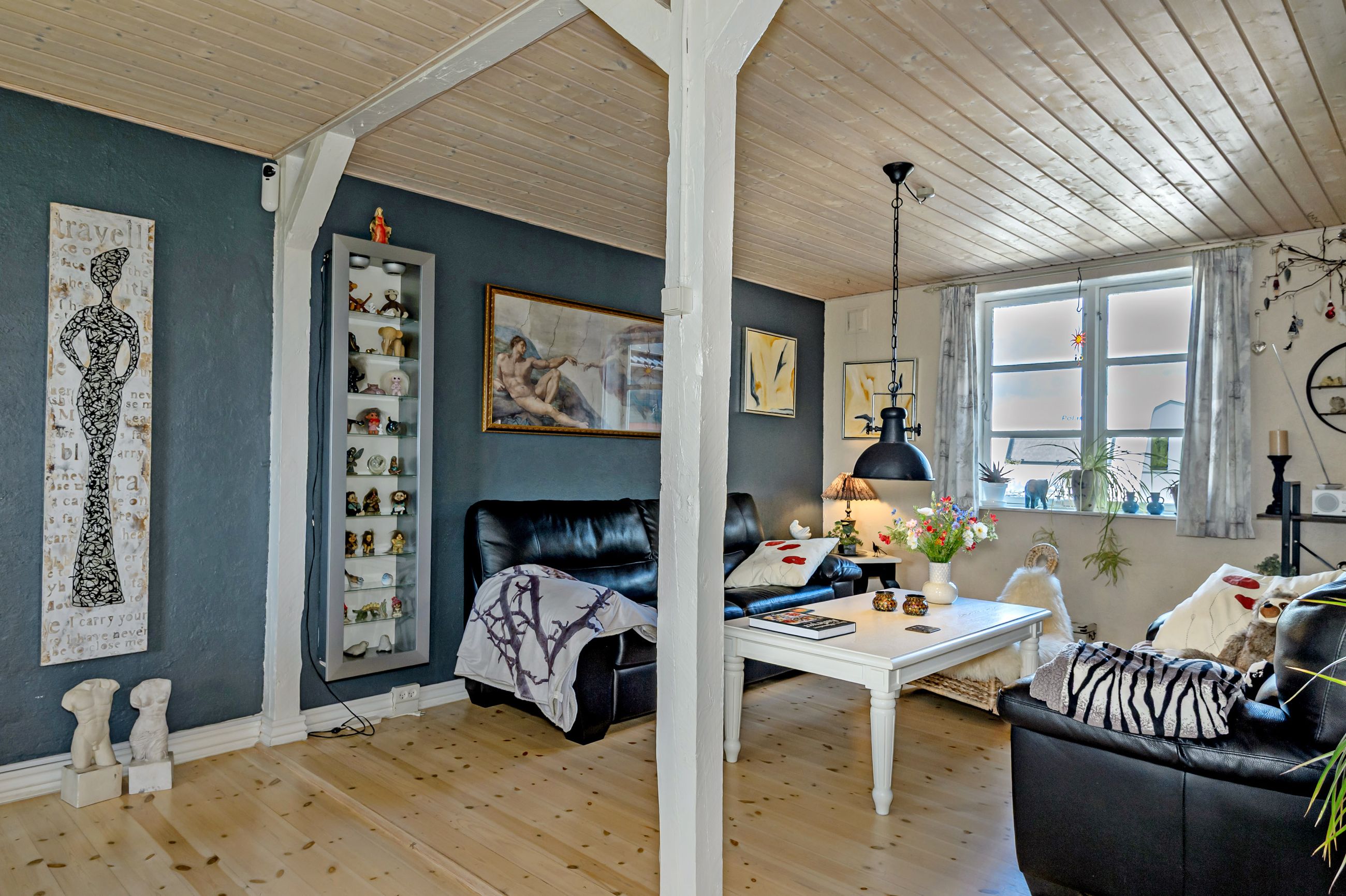 Selve boligen er indrettet med køkken med olivengrønne fyldningslåger, delvist åbent mod stue, stor vinkelstue med trappe til 1.sal, entre, mellemgang/viktualierum, badeværelse med lyse fliser, bruseniche og plads til vaskemaskine/tørretumbler, rummeligt bryggers og kontor/værelse.