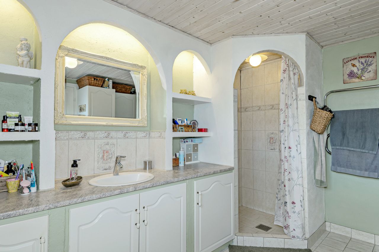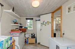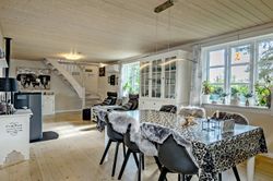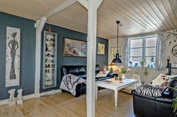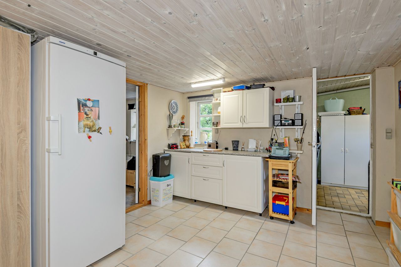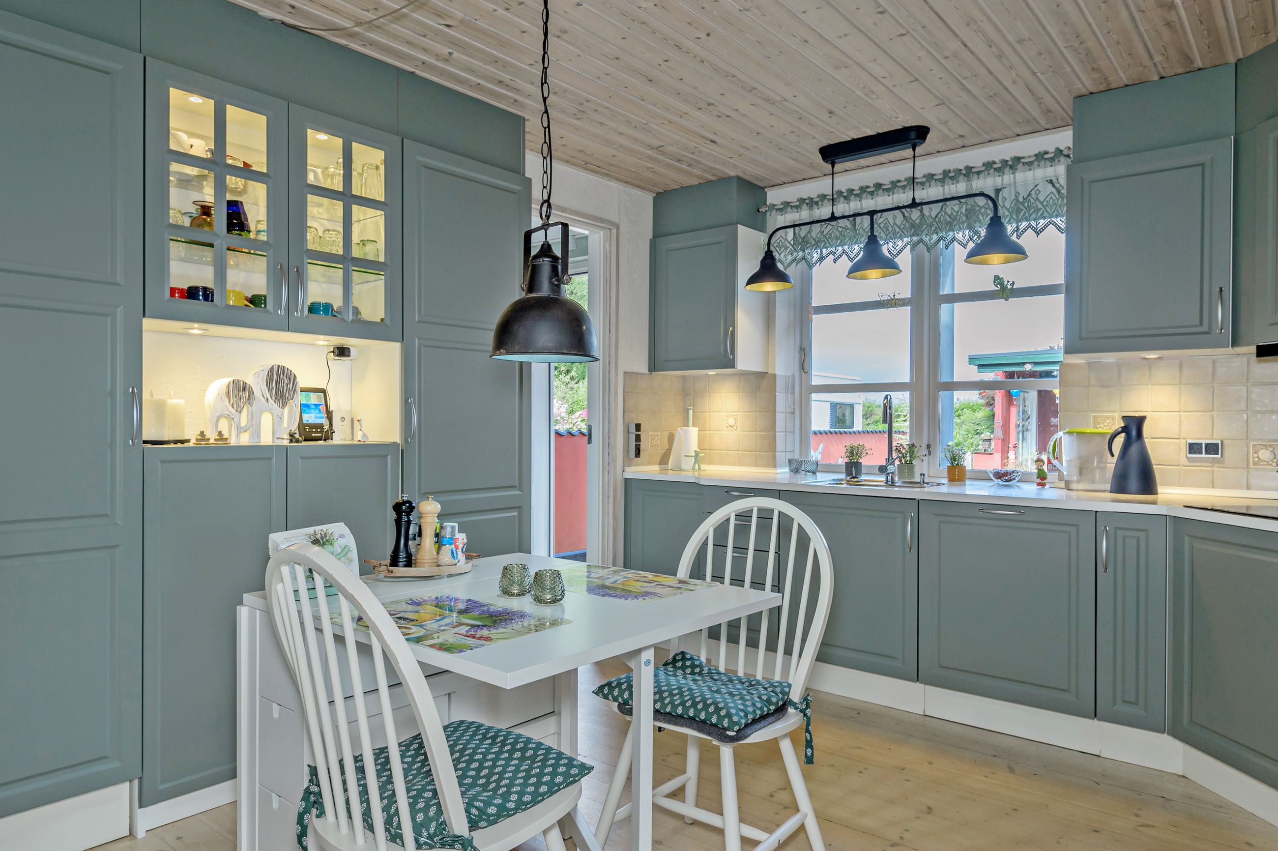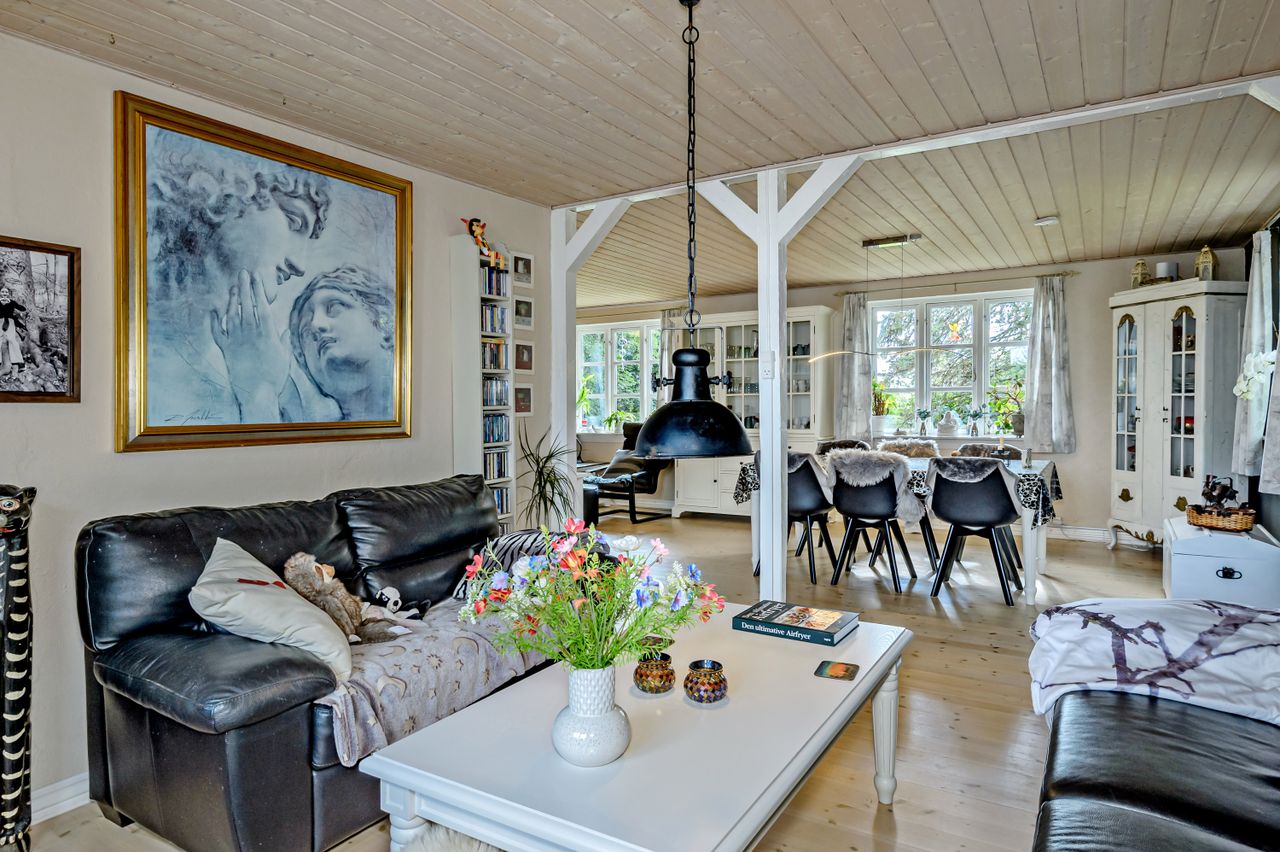 Selve boligen er indrettet med køkken med olivengrønne fyldningslåger, delvist åbent mod stue, stor vinkelstue med trappe til 1.sal, entre, mellemgang/viktualierum, badeværelse med lyse fliser, bruseniche og plads til vaskemaskine/tørretumbler, rummeligt bryggers og kontor/værelse.