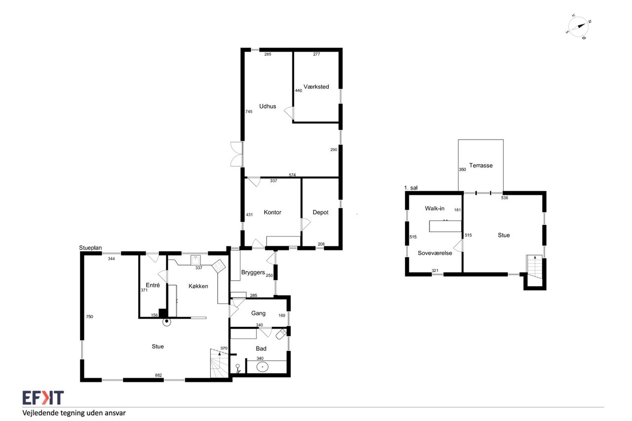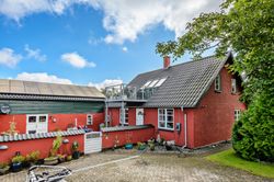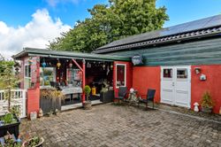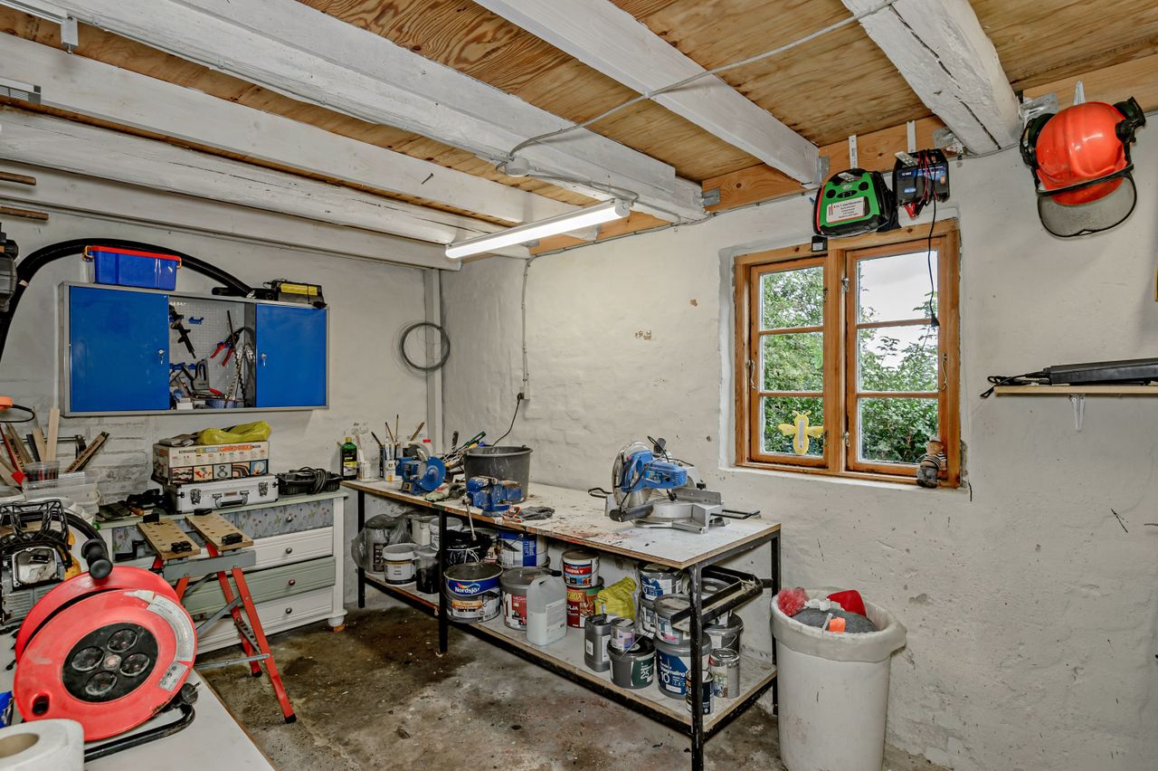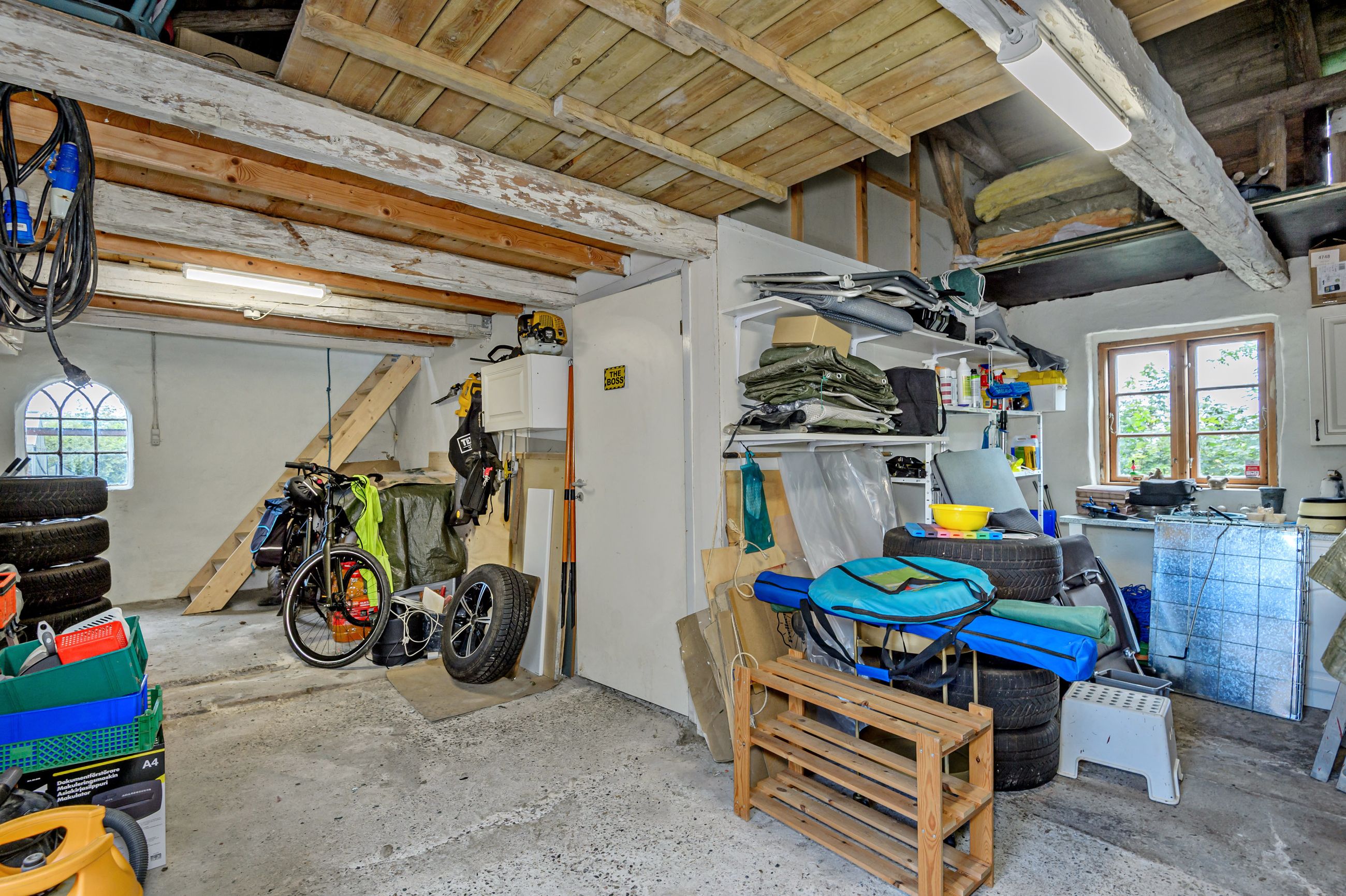 Det store murede udhus er med nyrenoverede trægavle. Her er der både værksted og depotrum. Trappe til 1.sal med lagerplads.