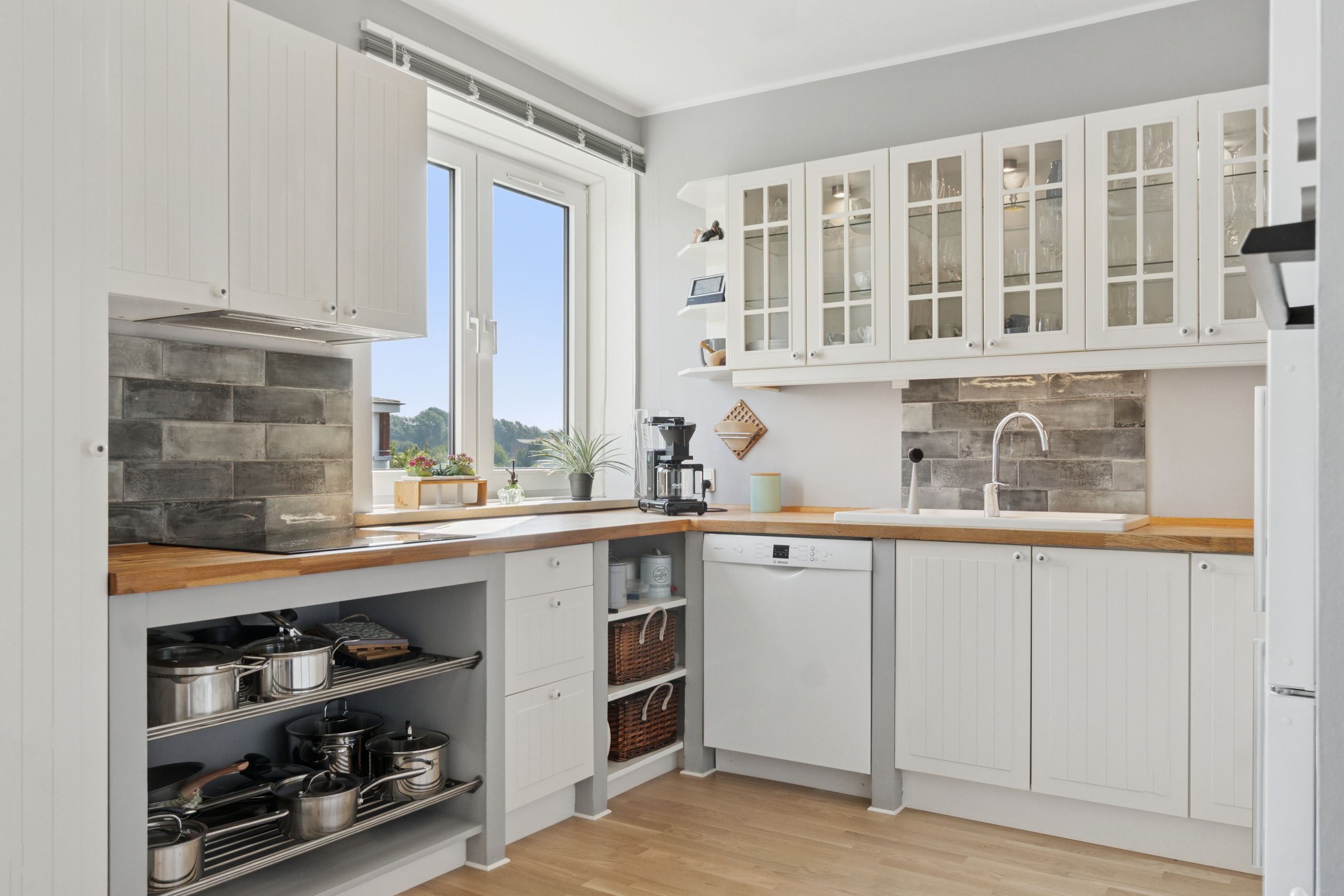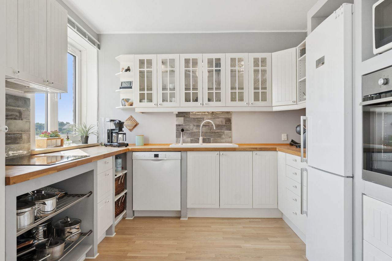 Det flotte køkken er i en landlig stil, og blev opdateret i 2023 med nyt køleskab, emhætte og induktionskogeplade, og det er i forbindelse til alrummet, hvilket giver en dejlig, åben rumfornemmelse.