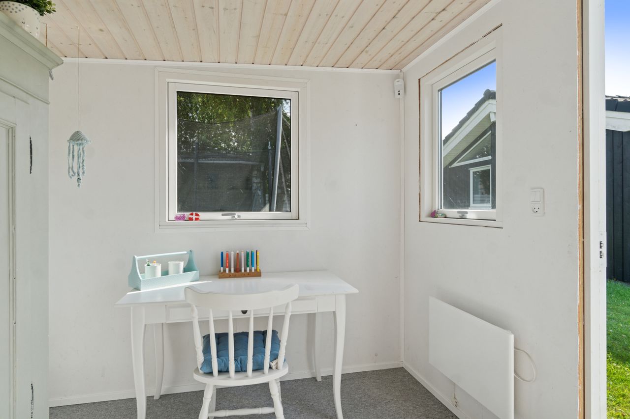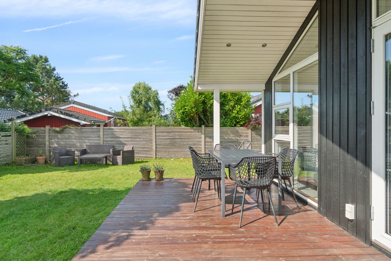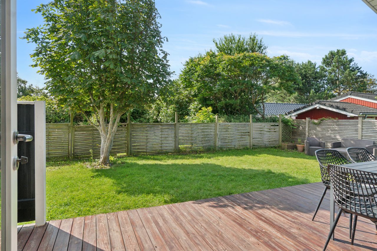 Haven er solrig og privat med en dejlig, delvist overdækket terrasse, hvor du kan nyde sommeren i læ for vinden. Her er også god plads til boldspil og børneleg på græsplænen, mens et hyggeligt anneks kan bruges til mange forskellige formål.