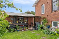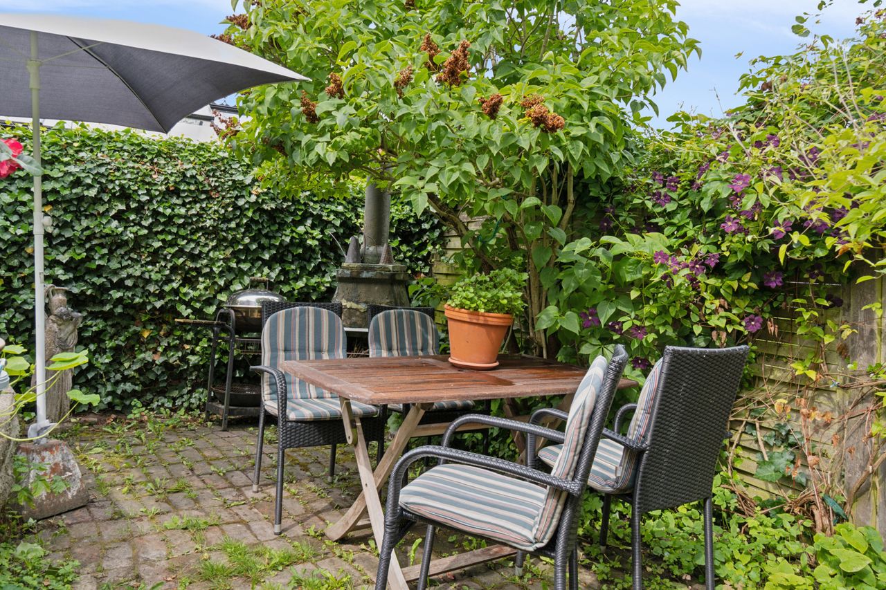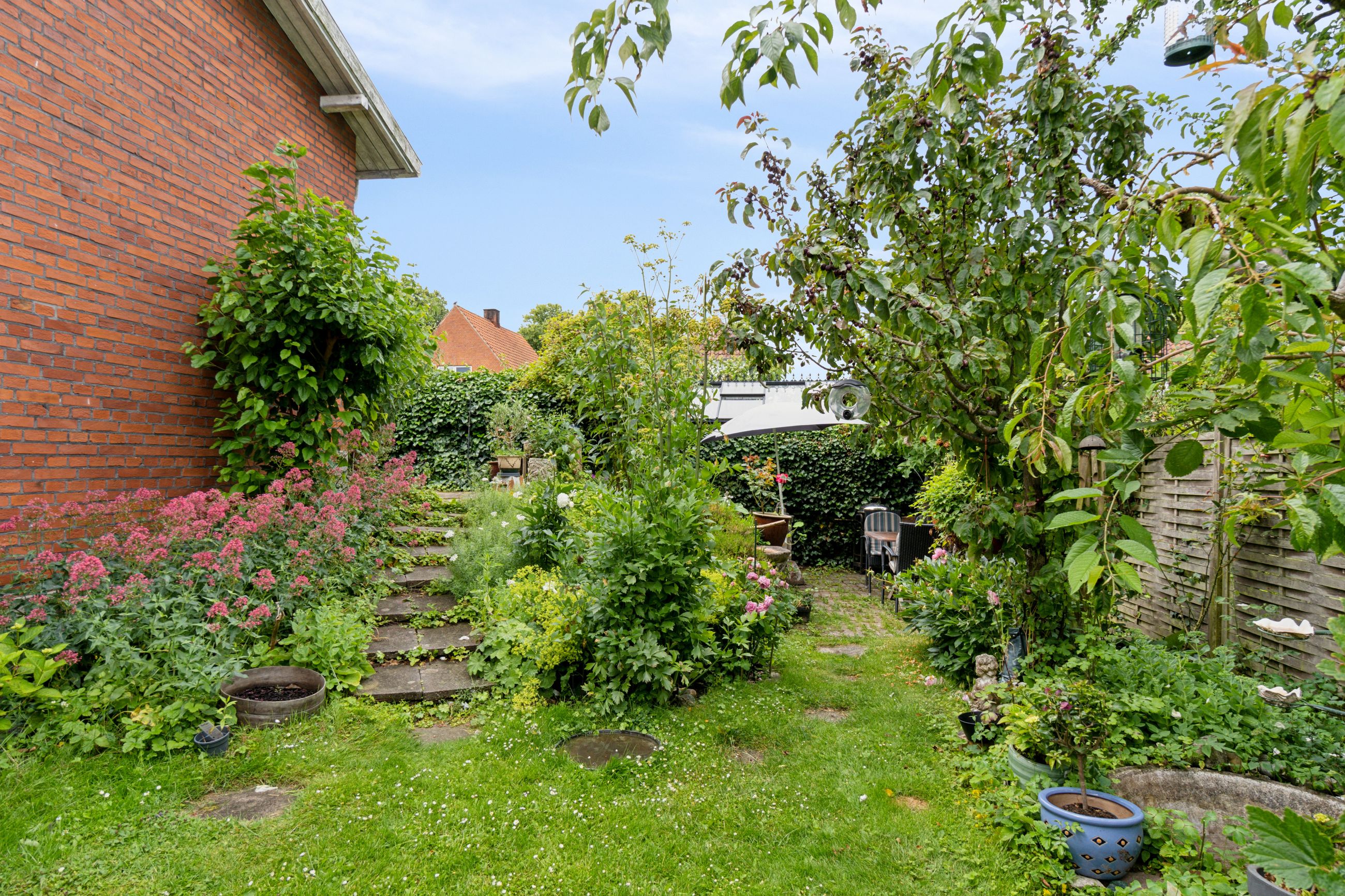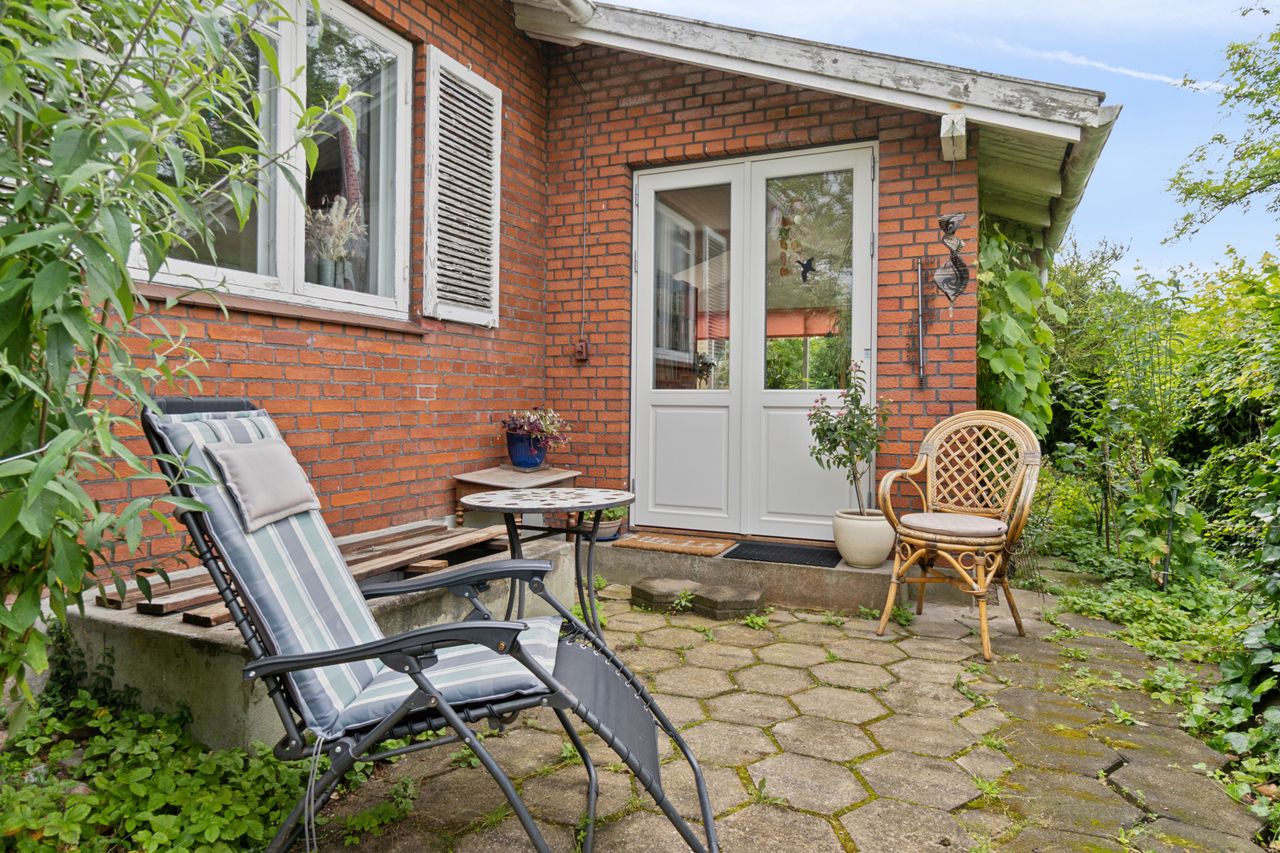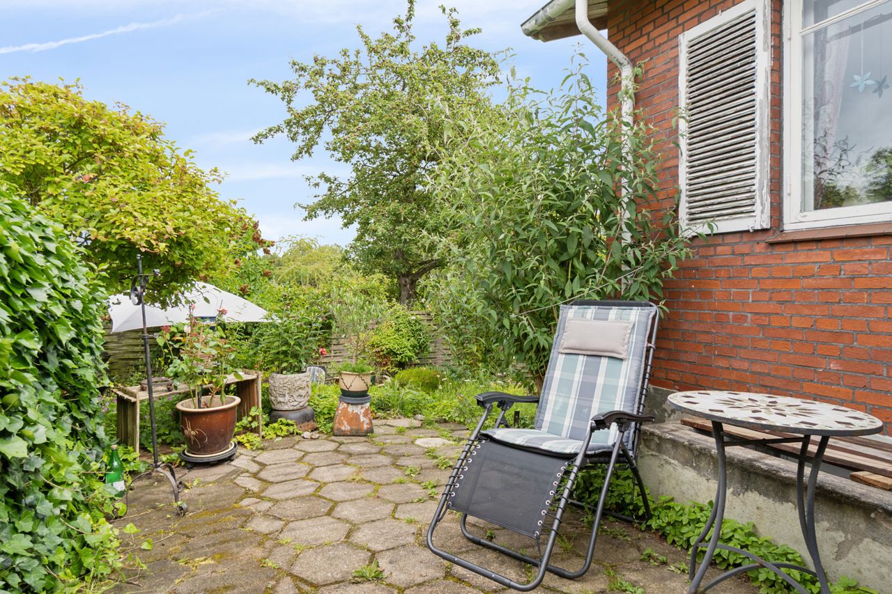 Udenfor venter en spændende og frodig have, der er velanlagt med forskellige træer og beplantninger – blandt andet roser og pæoner i smukke nuancer samt frugtbuske og vinplanter. Der er også ribs, solbær og meget andet, som alt sammen kan nydes fra jeres solrige terrassemiljøer