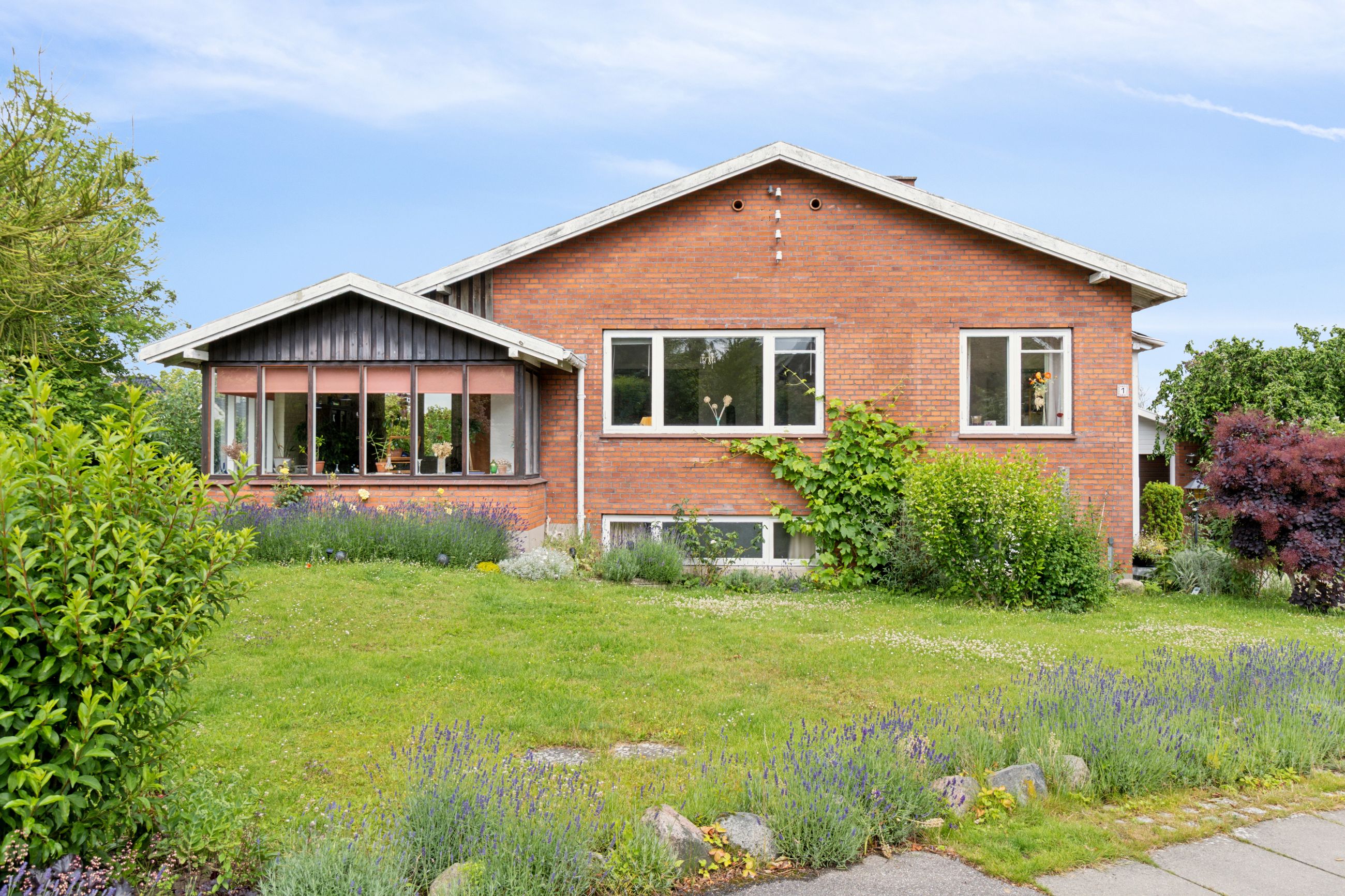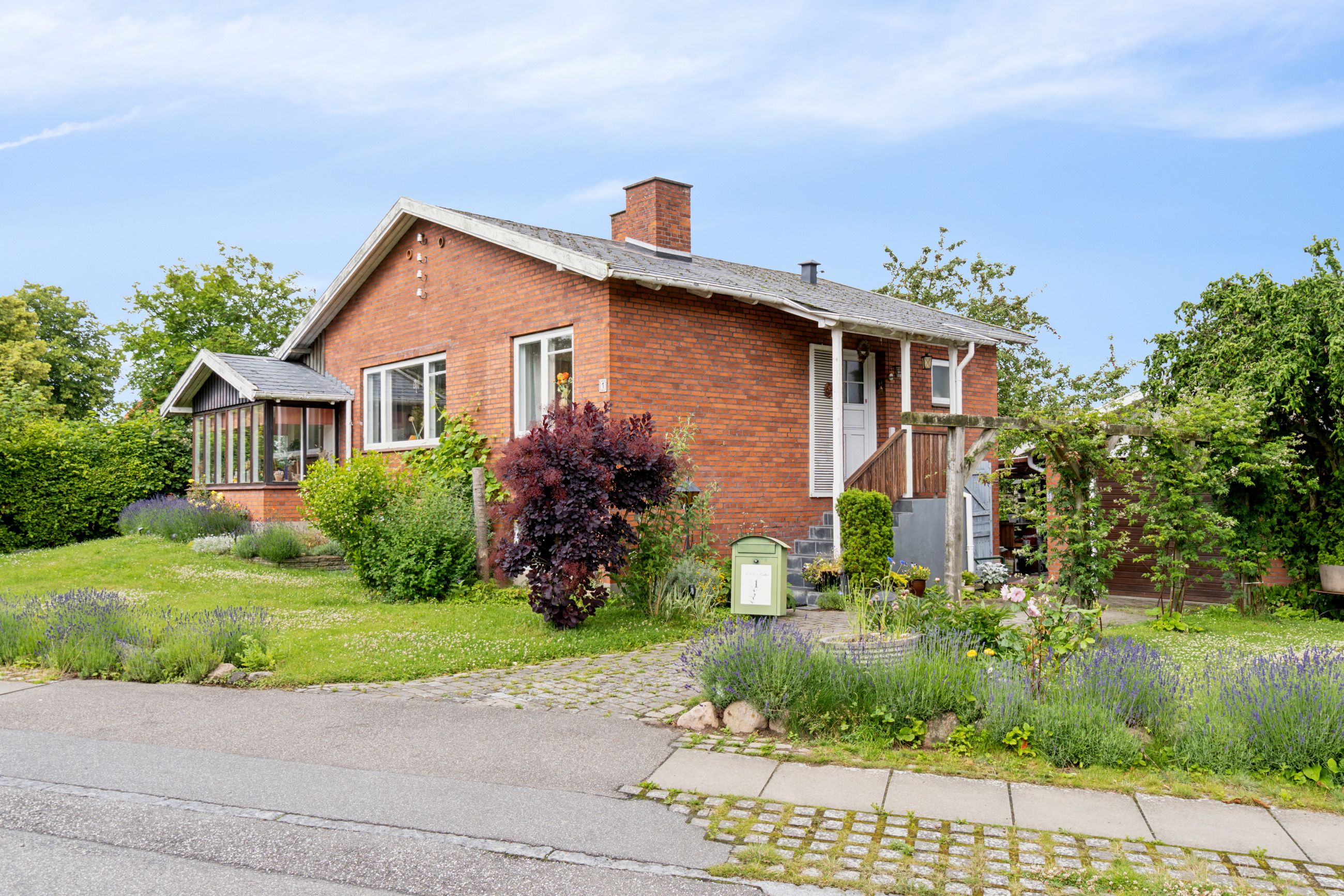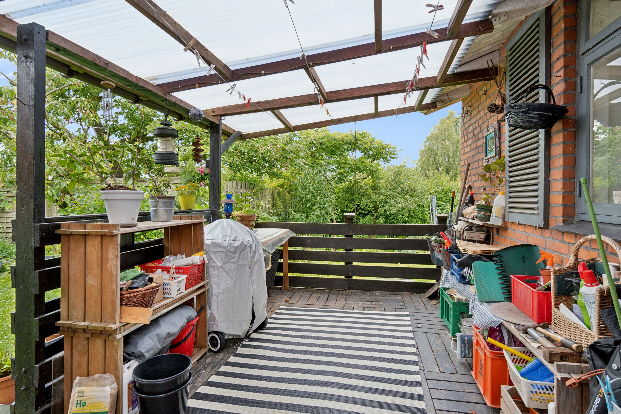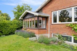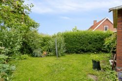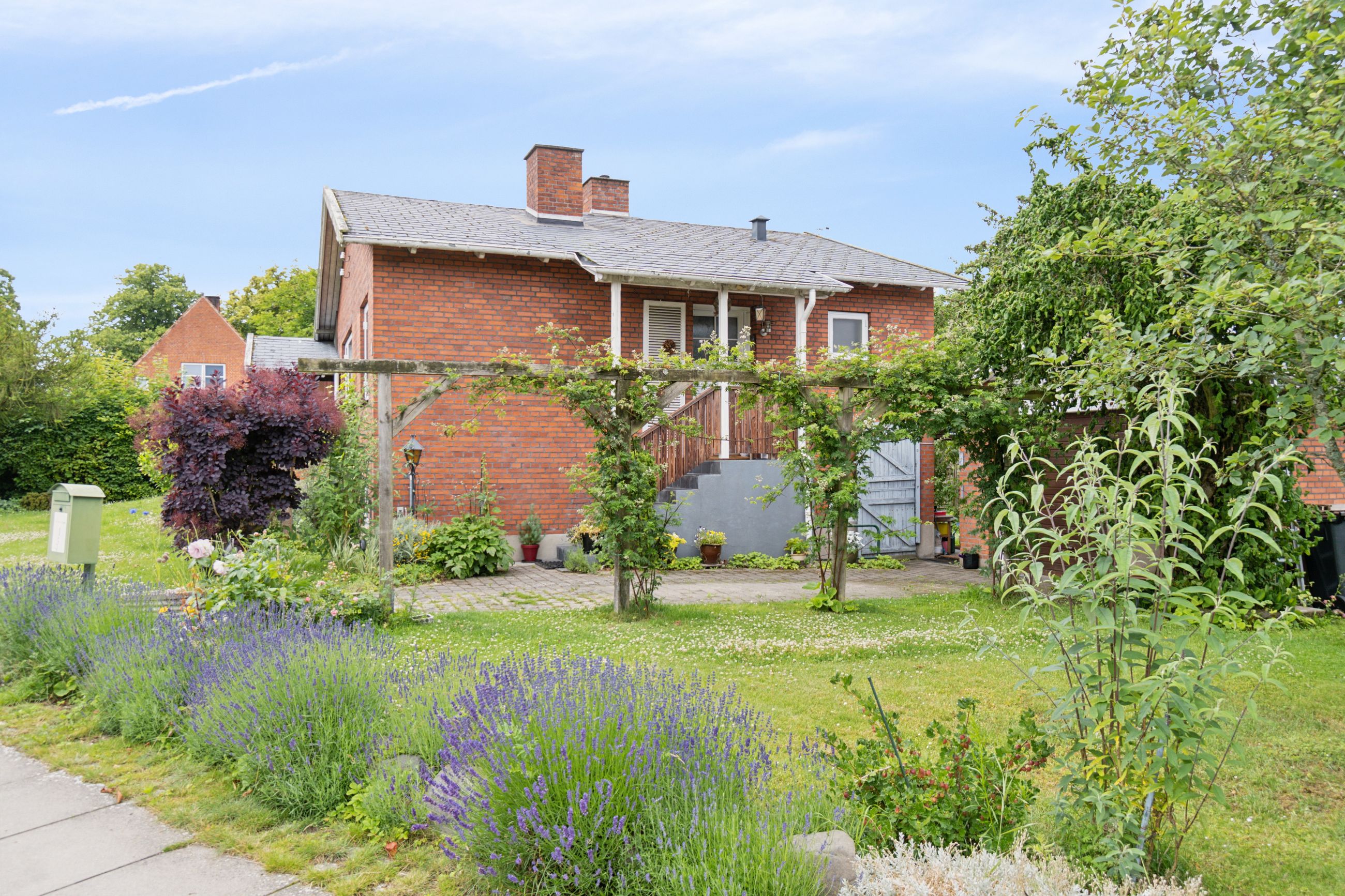 Udenfor venter en spændende og frodig have, der er velanlagt med forskellige træer og beplantninger – blandt andet roser og pæoner i smukke nuancer samt frugtbuske og vinplanter. Der er også ribs, solbær og meget andet, som alt sammen kan nydes fra jeres solrige terrassemiljøer
