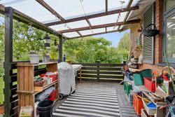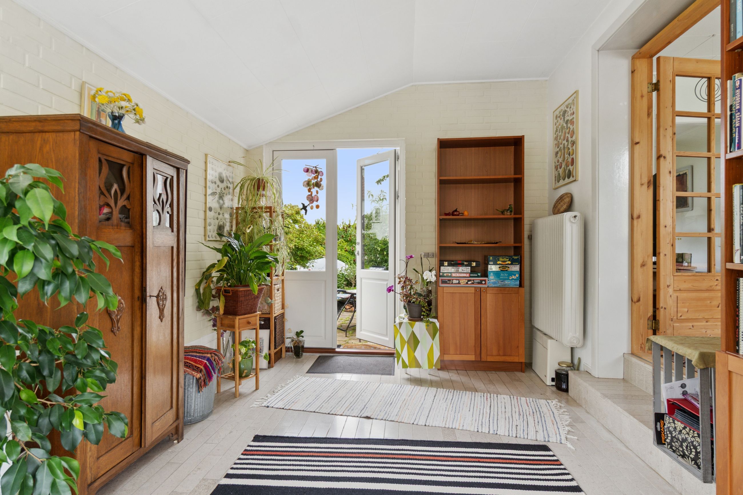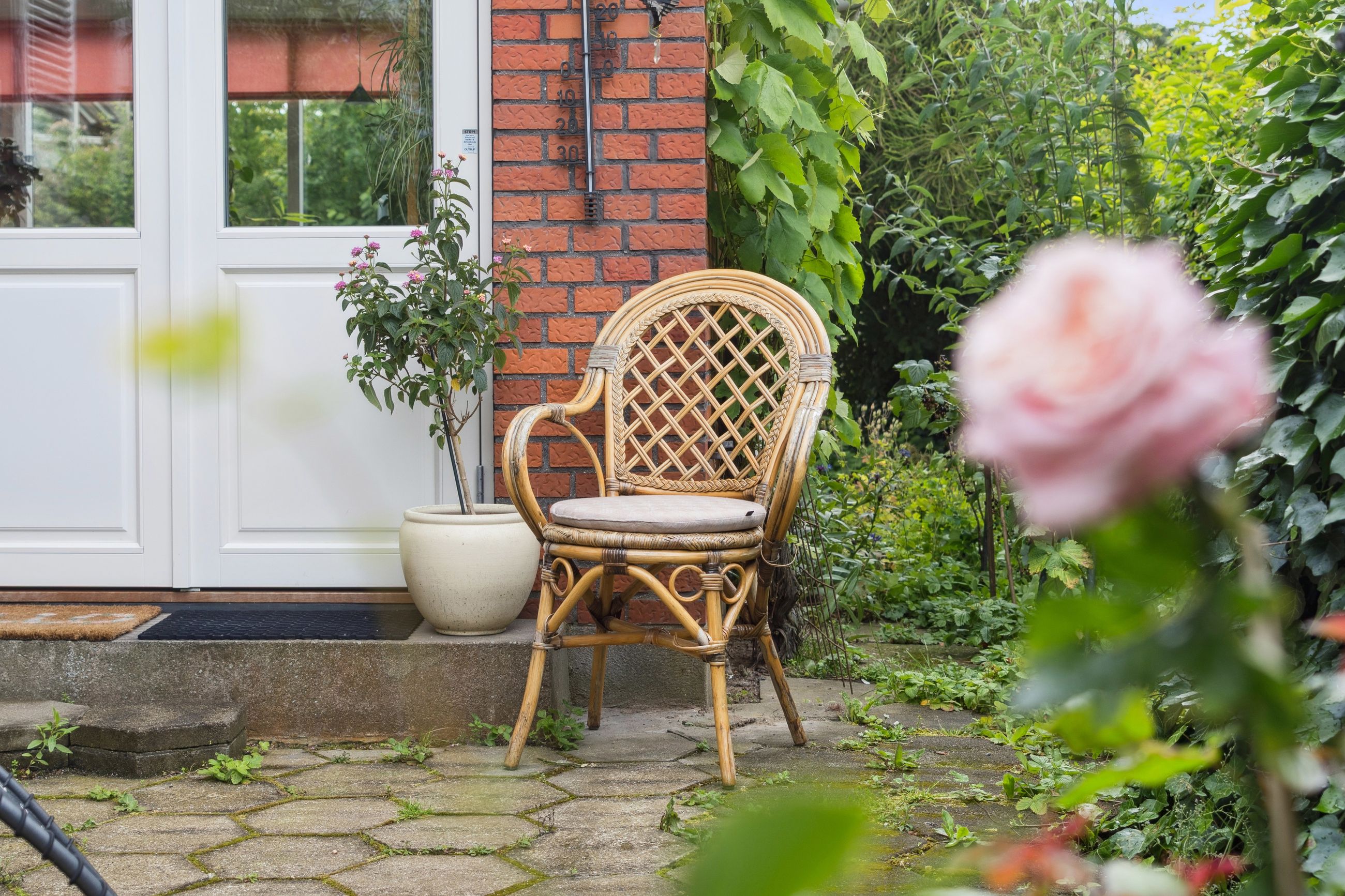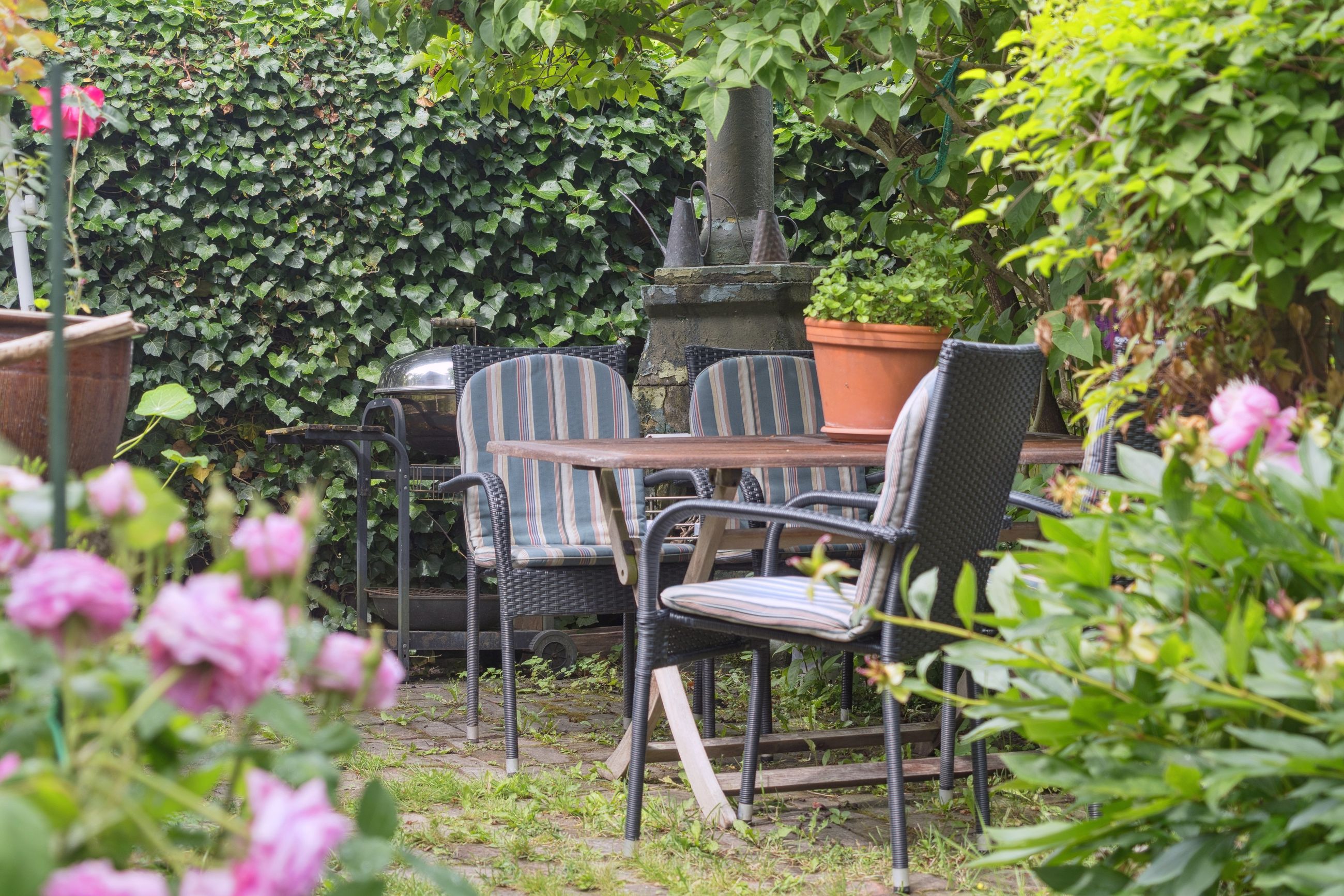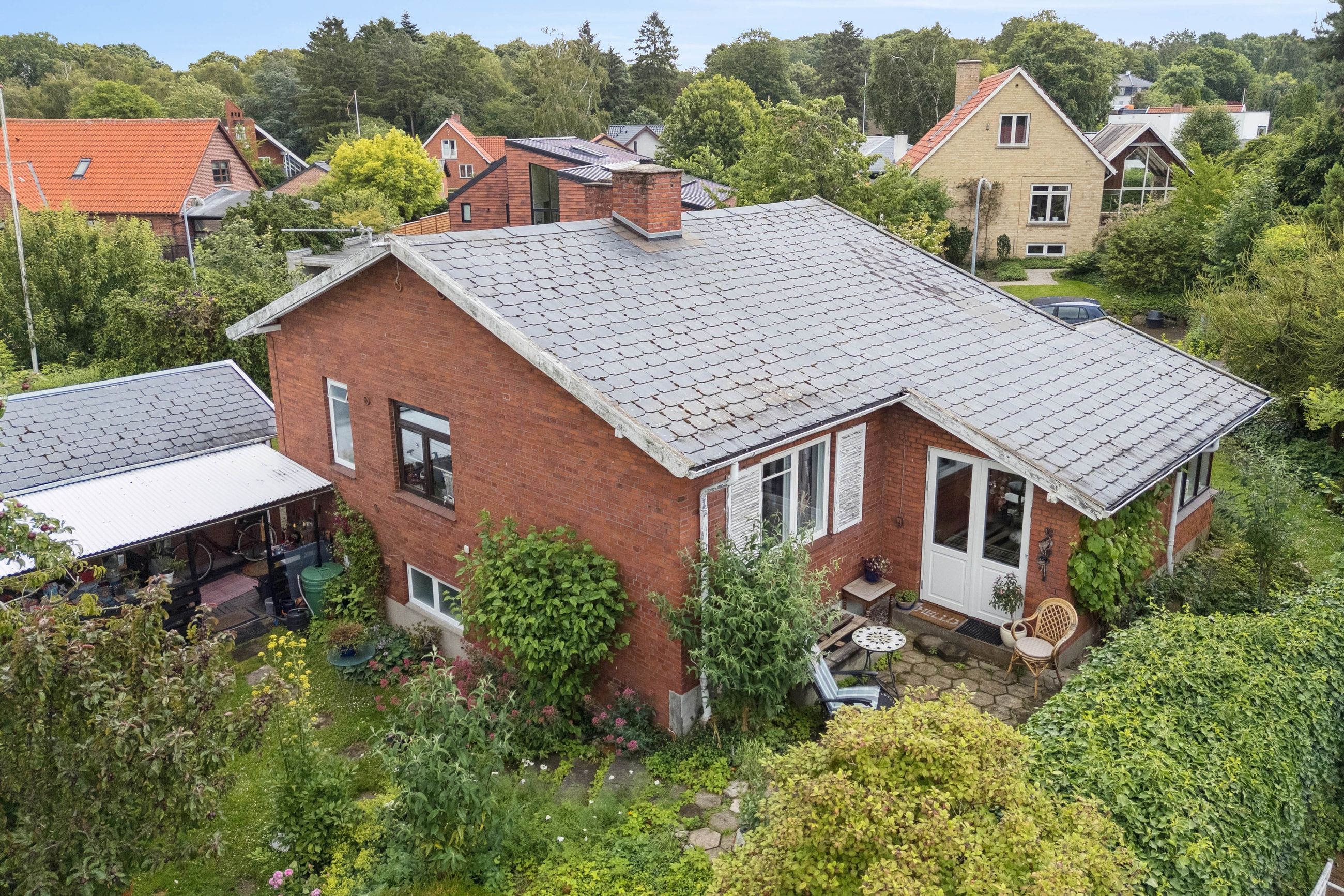 Udenfor venter en spændende og frodig have, der er velanlagt med forskellige træer og beplantninger – blandt andet roser og pæoner i smukke nuancer samt frugtbuske og vinplanter. Der er også ribs, solbær og meget andet, som alt sammen kan nydes fra jeres solrige terrassemiljøer
