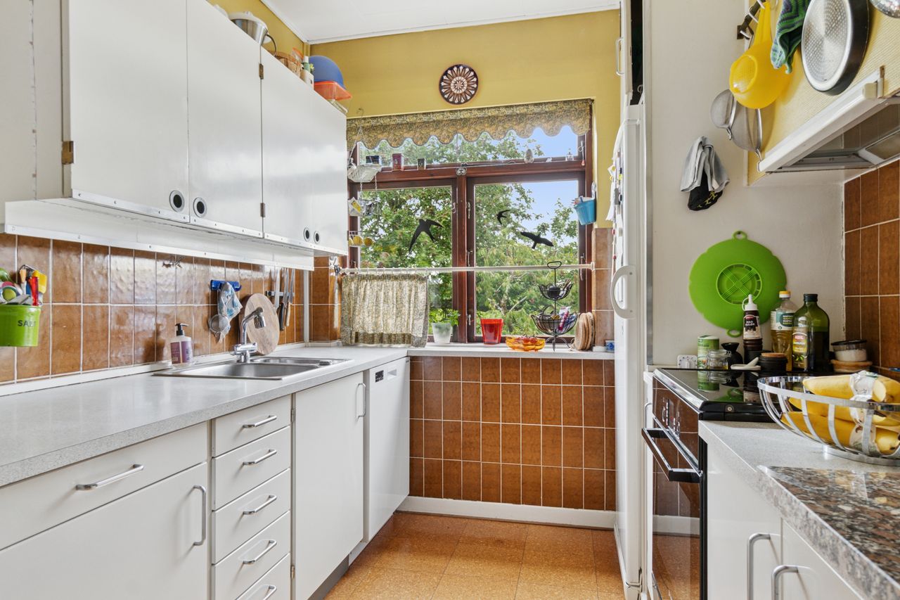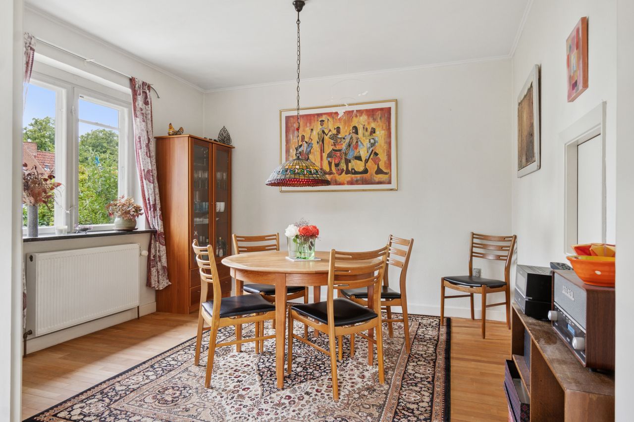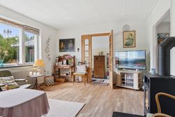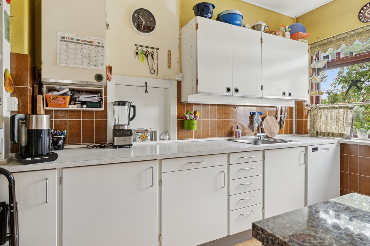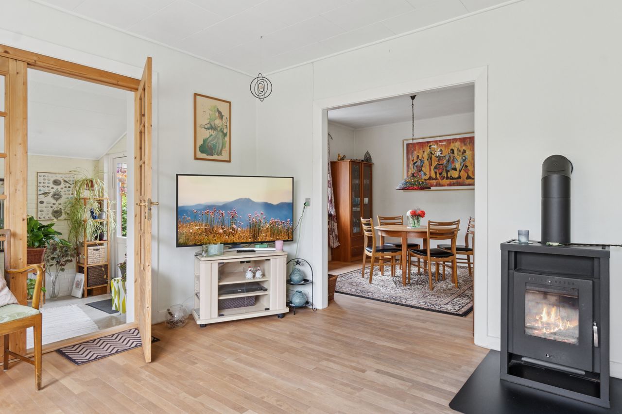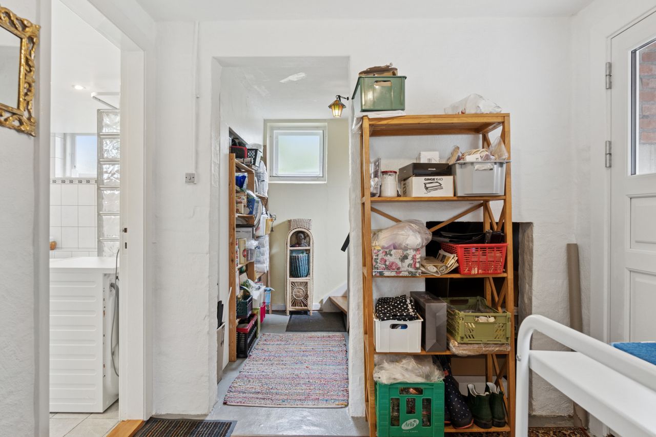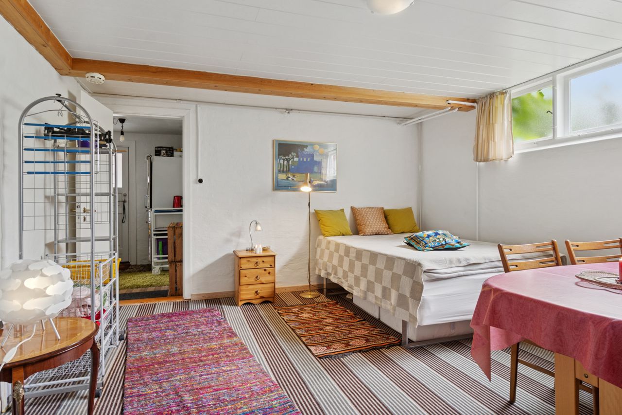 Indenfor leder entréen til køkkenet, som er funktionelt, mens I også kan se frem til to stuer og en spisestue. Den ene stue har desuden en hyggelig og stemningsskabende brændeovn, som I kan tænde op i på de sene aftentimer. Stueplan afrundes af et værelse og et badeværelse med gulvarme, før I kan tage turen ned i den yderst gode kælder. Hernede har I endnu et badeværelse med badekar og gulvarme, mens der også er tre disponible rum, som kan anvendes og indrettes helt efter behov. Alle rum i kælderen har en god lofthøjde og der er desuden udgang til husets udeareal.