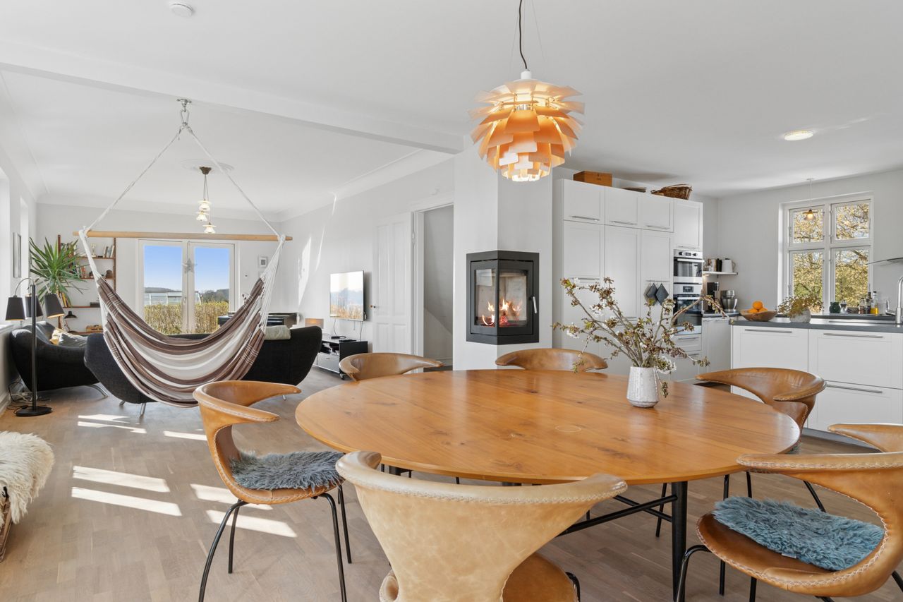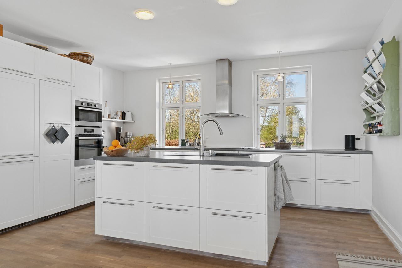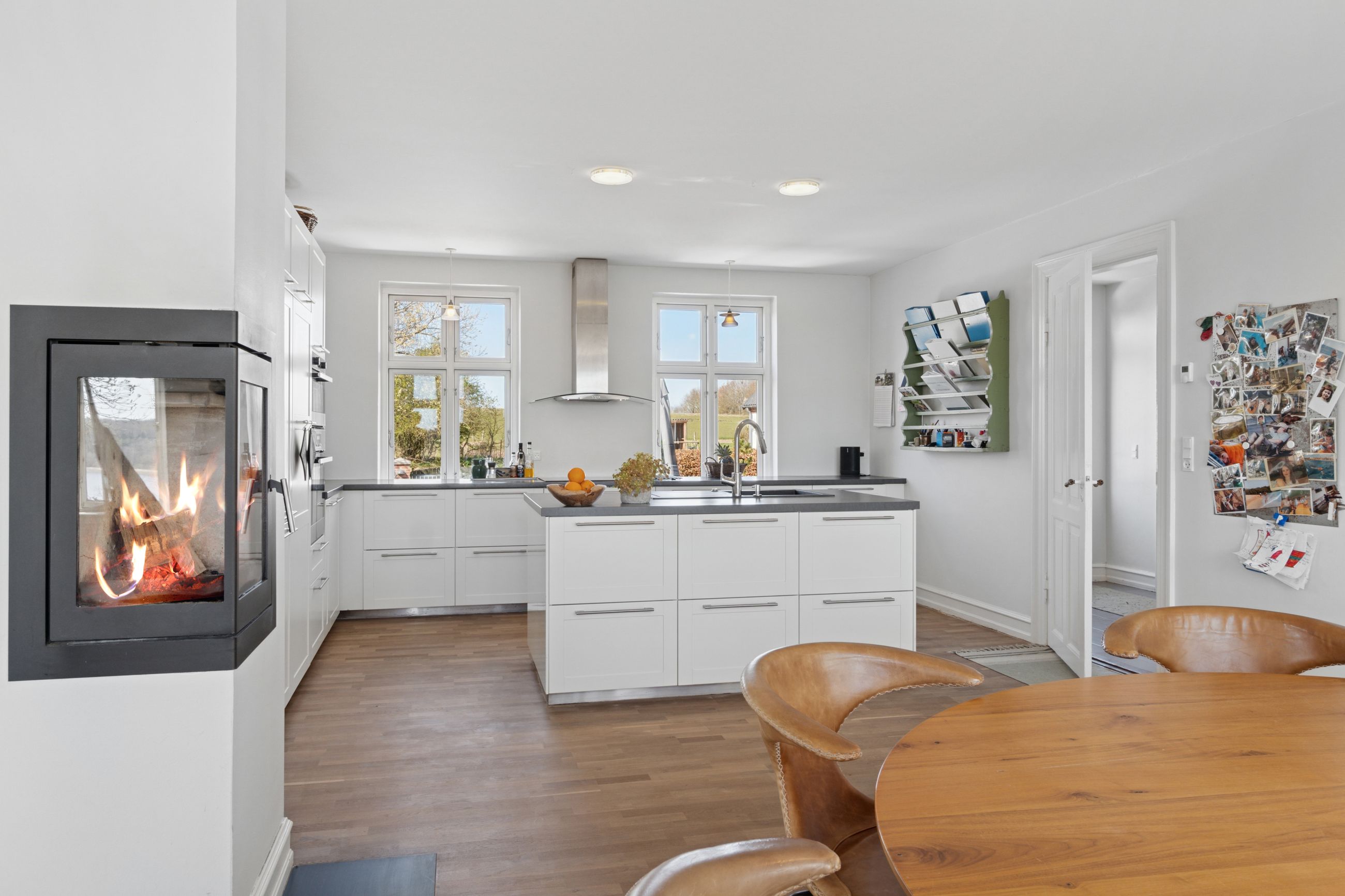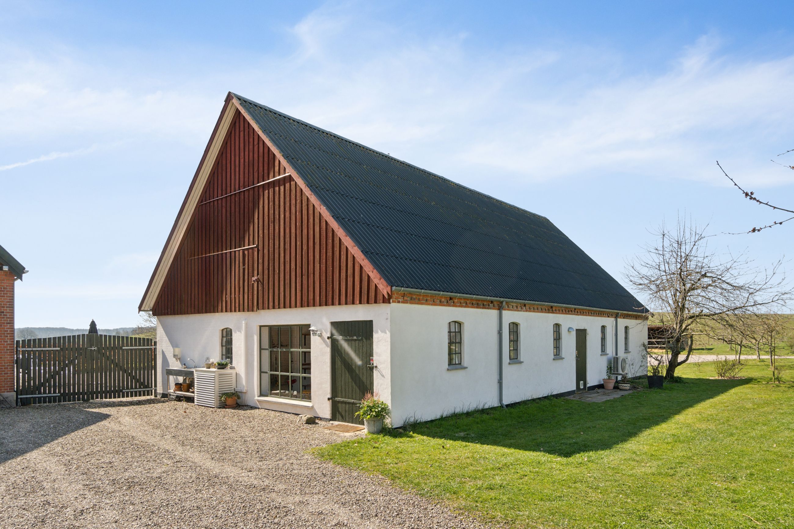 Stuehuset præsenterer sig med et klassisk udtryk. Den røde murstensfacade ledsages af et rødt tegltag og hvide vinduer, og inden døre er det for alvor tydeligt, at huset blev gennemistandsat i 2013/2014. I stueplan er hjemmet centreret omkring det anseelige opholdsrum med stue og køkken i et, mens I også råder over et værelse, et bryggers og et luksuriøst badeværelse. Førstesalen består af en stilren repos med store vinduespartier, tre værelser og et badeværelse. Alt i alt får I 255 kvadratmeter bolig.