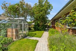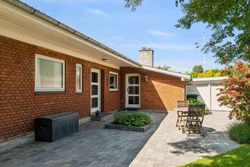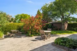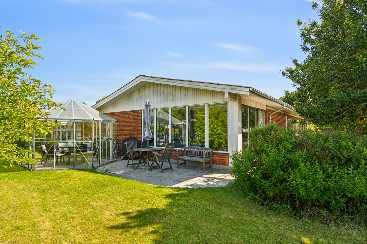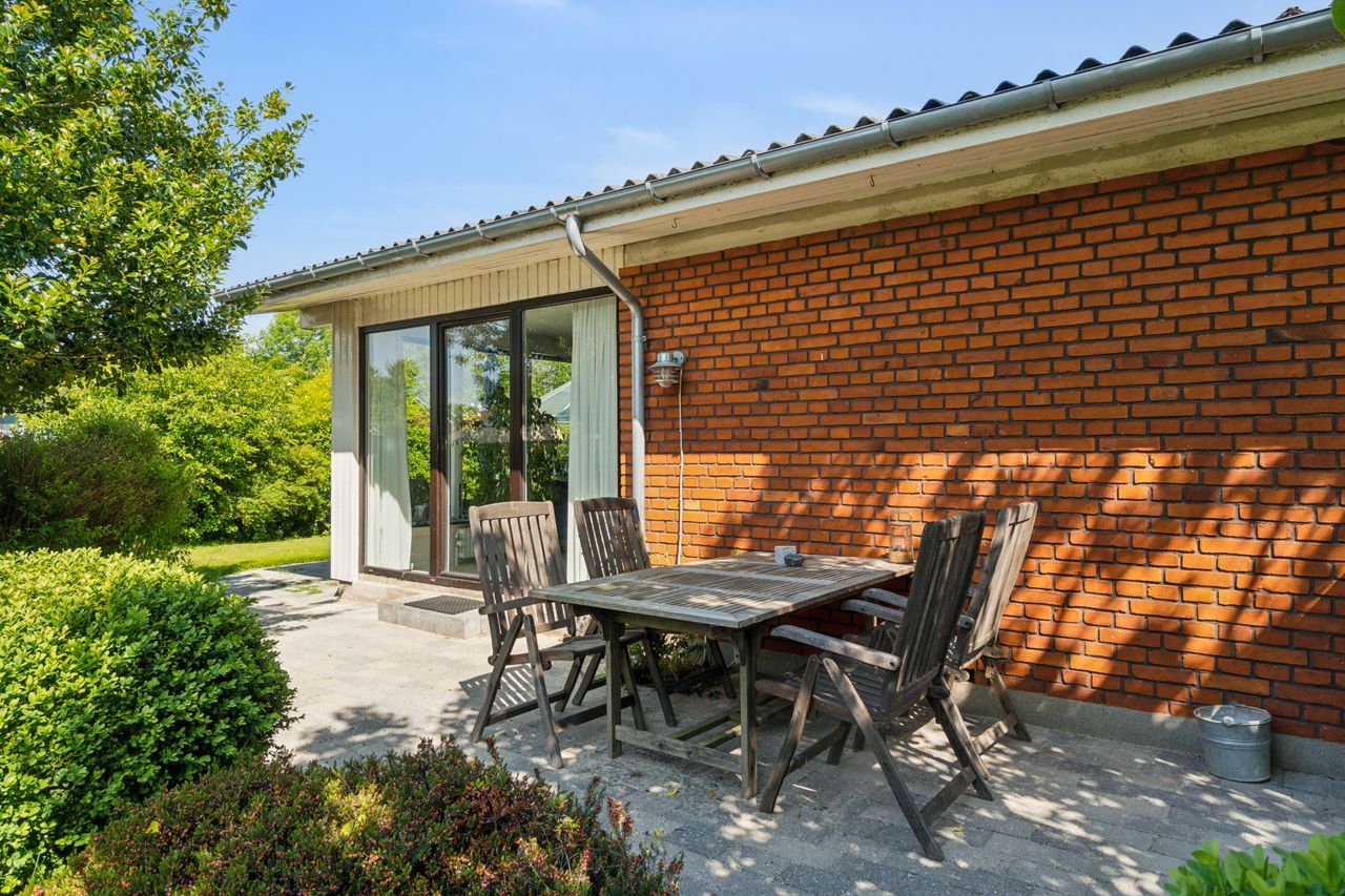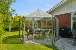 Udenfor beriges I med den skønneste have, hvor I kan nyde solens stråler hele dagen. Terrasserne kan indrettes med havemøbler, mens flisebelagte stier fører jer rundt på matriklen, der er anlagt med græsplæne, blomster, buske og træer. Her venter jer også en hyggelig glaspavillon.