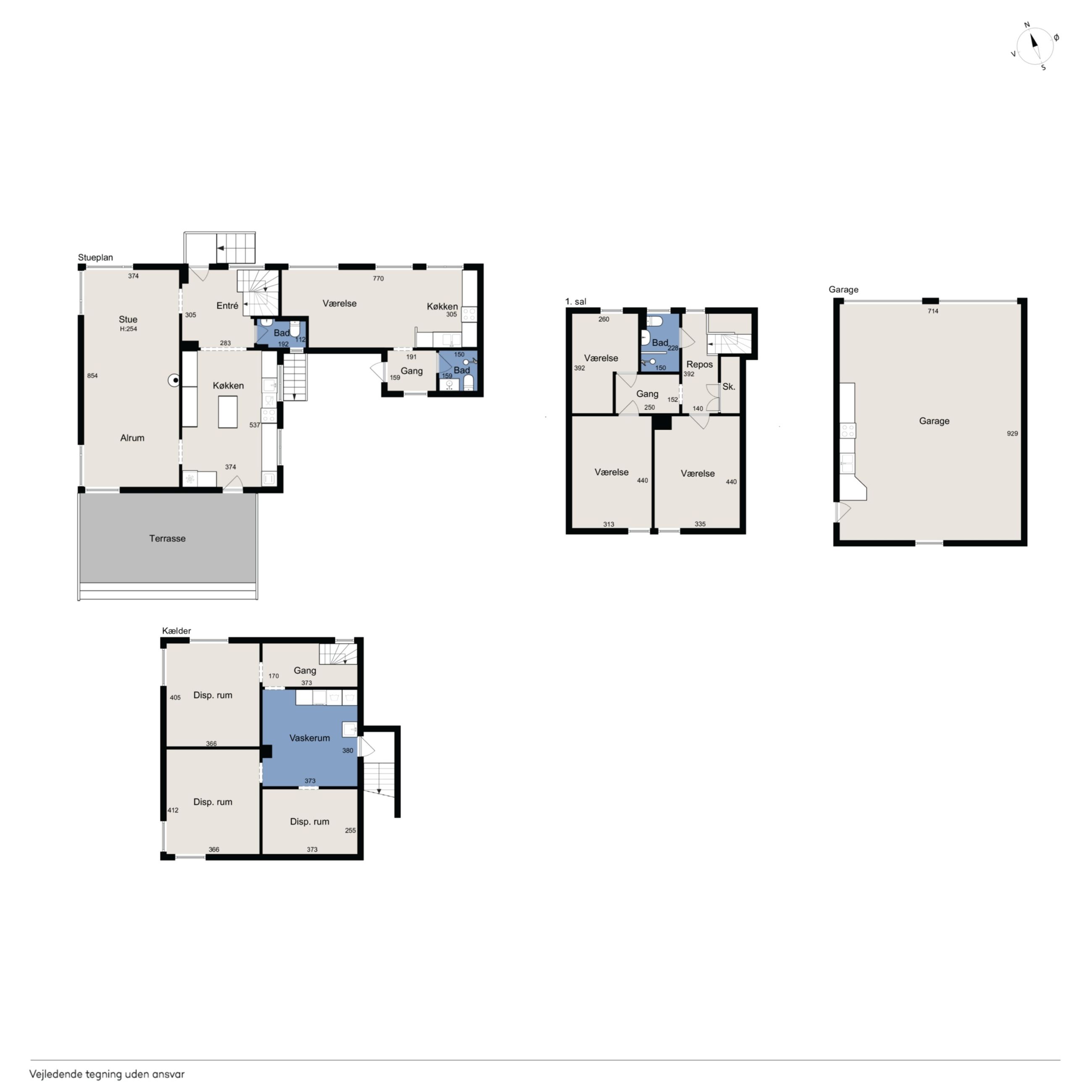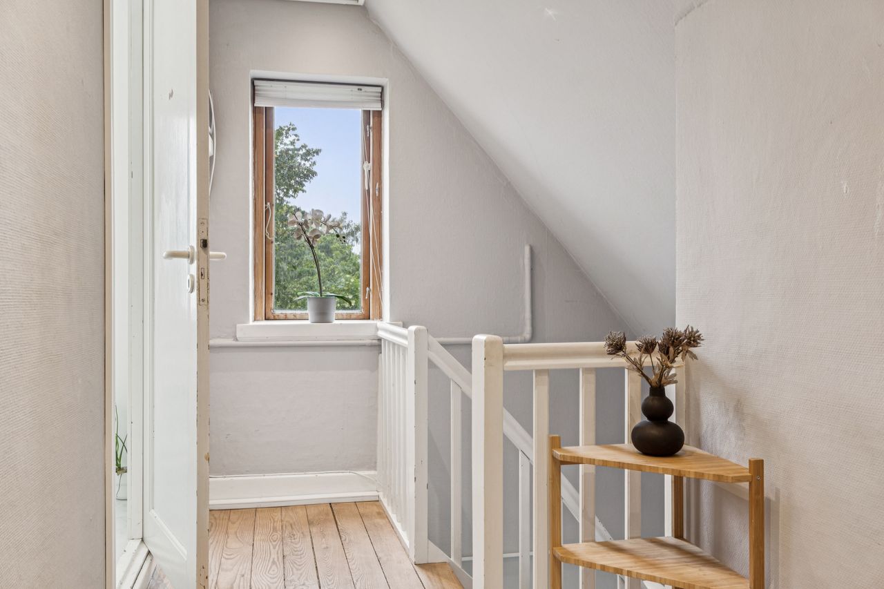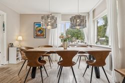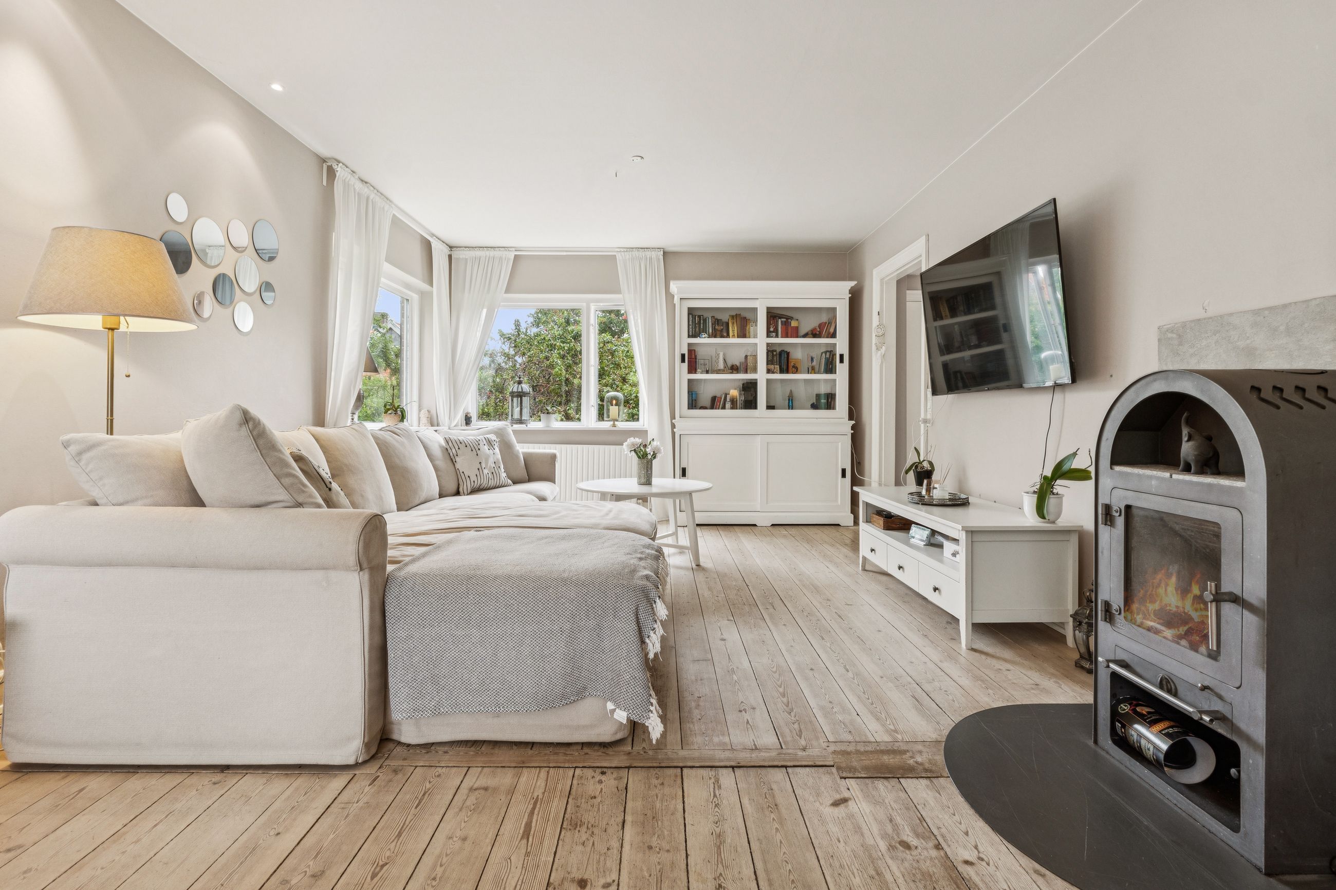I alt 232 etagemeter og 80 kvm garage er indrettet som følger: Indgang enten via hovedtrappe mod vejen, eller fra terrasse til køkken/alrum. Trappe til 1. sal og gæstebadeværelse. Stort køkken/alrum med udgang. Stue i hele huset bredde mod syd/vest, med hjørnevinduer, spiseplads, dagligstueafdeling og brændeovn. 1. sal er indrettet med to store gavlværelser og et mindre værelse, samt nydeligt badeværelse. I kælderen er der forrum, 3 disponible rum og et stort bryggers/vaskerum med trappe op til haven.
