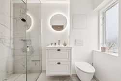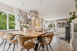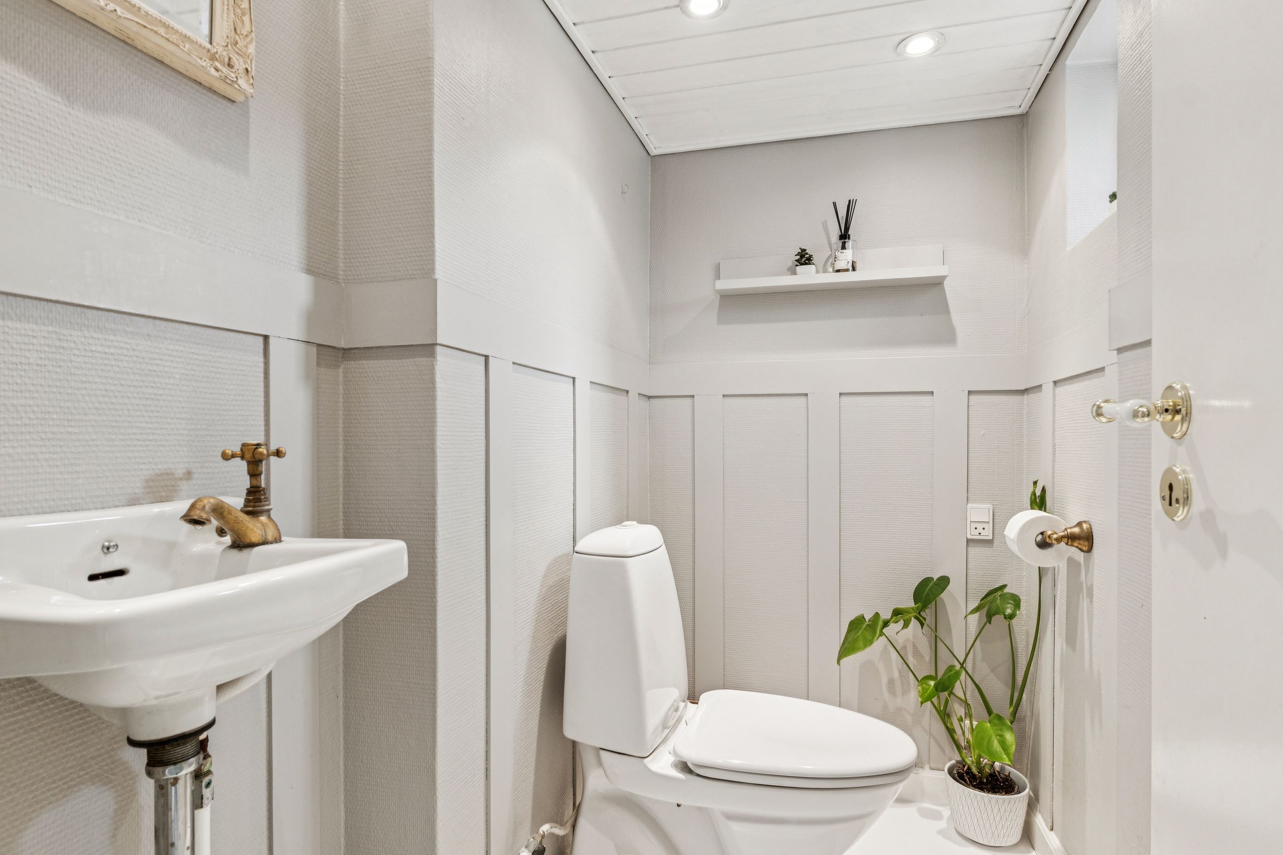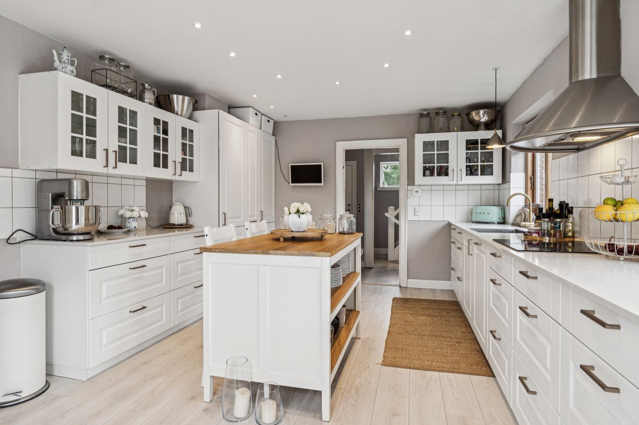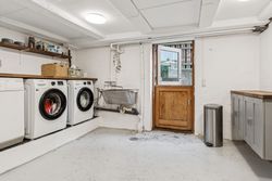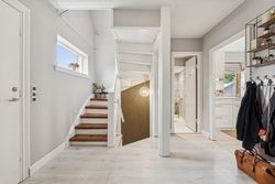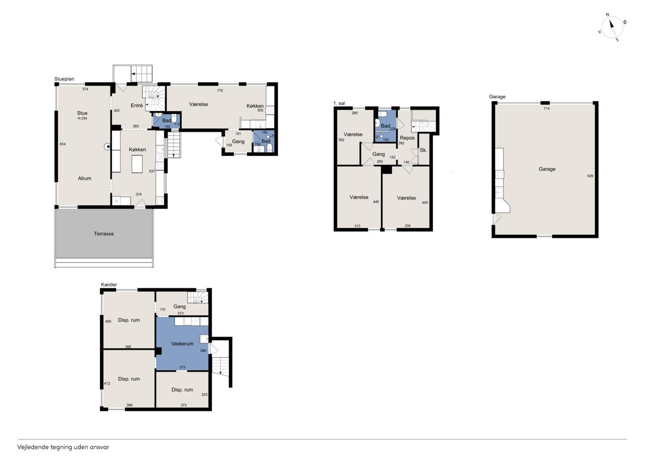 I alt 232 etagemeter og 80 kvm garage er indrettet som følger: Indgang enten via hovedtrappe mod vejen, eller fra terrasse til køkken/alrum. Trappe til 1. sal og gæstebadeværelse. Stort køkken/alrum med udgang. Stue i hele huset bredde mod syd/vest, med hjørnevinduer, spiseplads, dagligstueafdeling og brændeovn. 1. sal er indrettet med to store gavlværelser og et mindre værelse, samt nydeligt badeværelse. I kælderen er der forrum, 3 disponible rum og et stort bryggers/vaskerum med trappe op til haven.