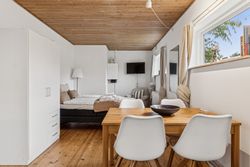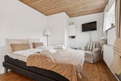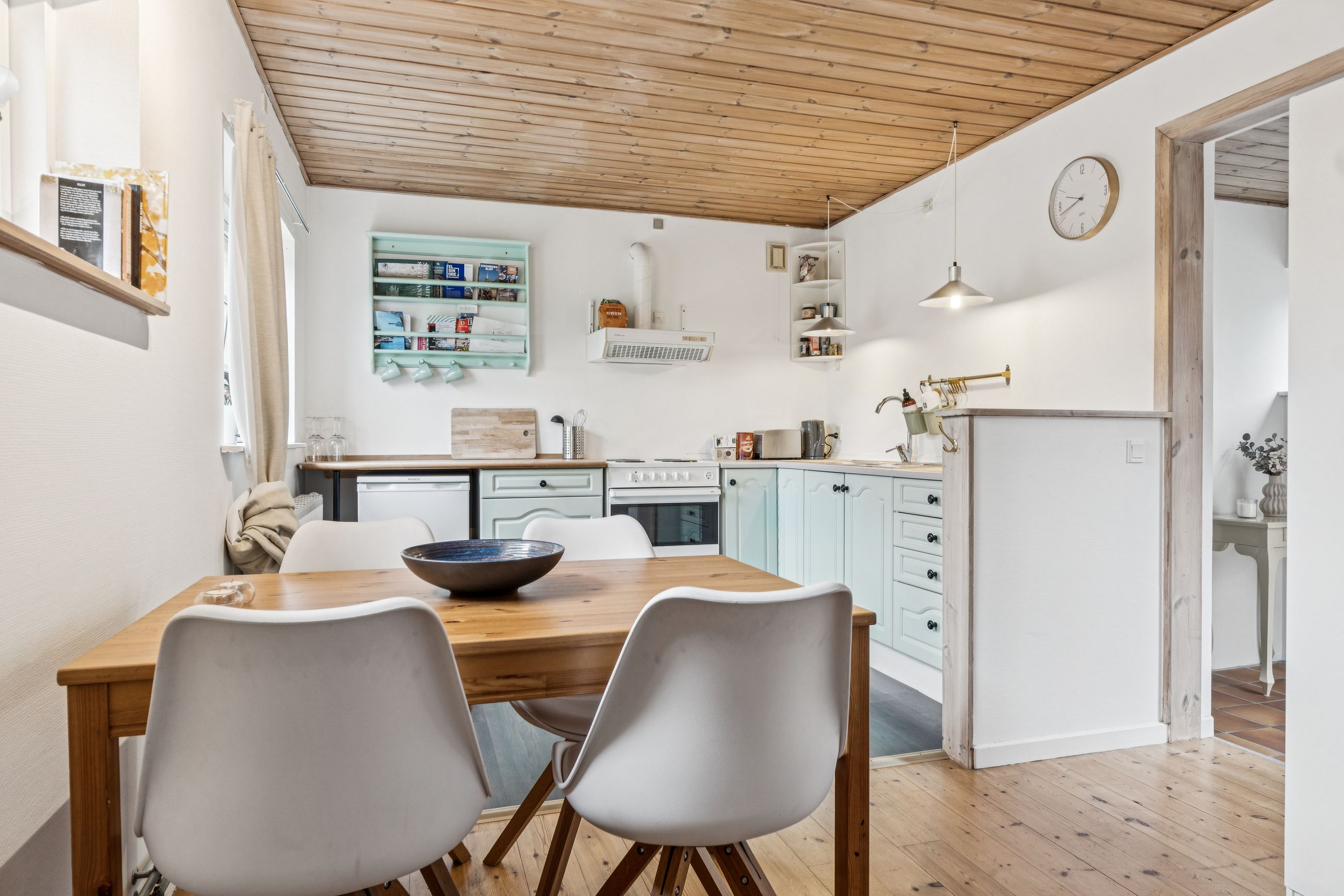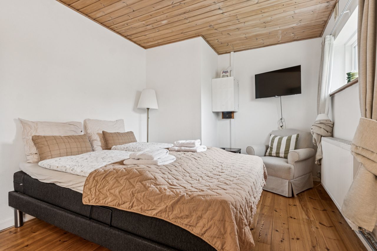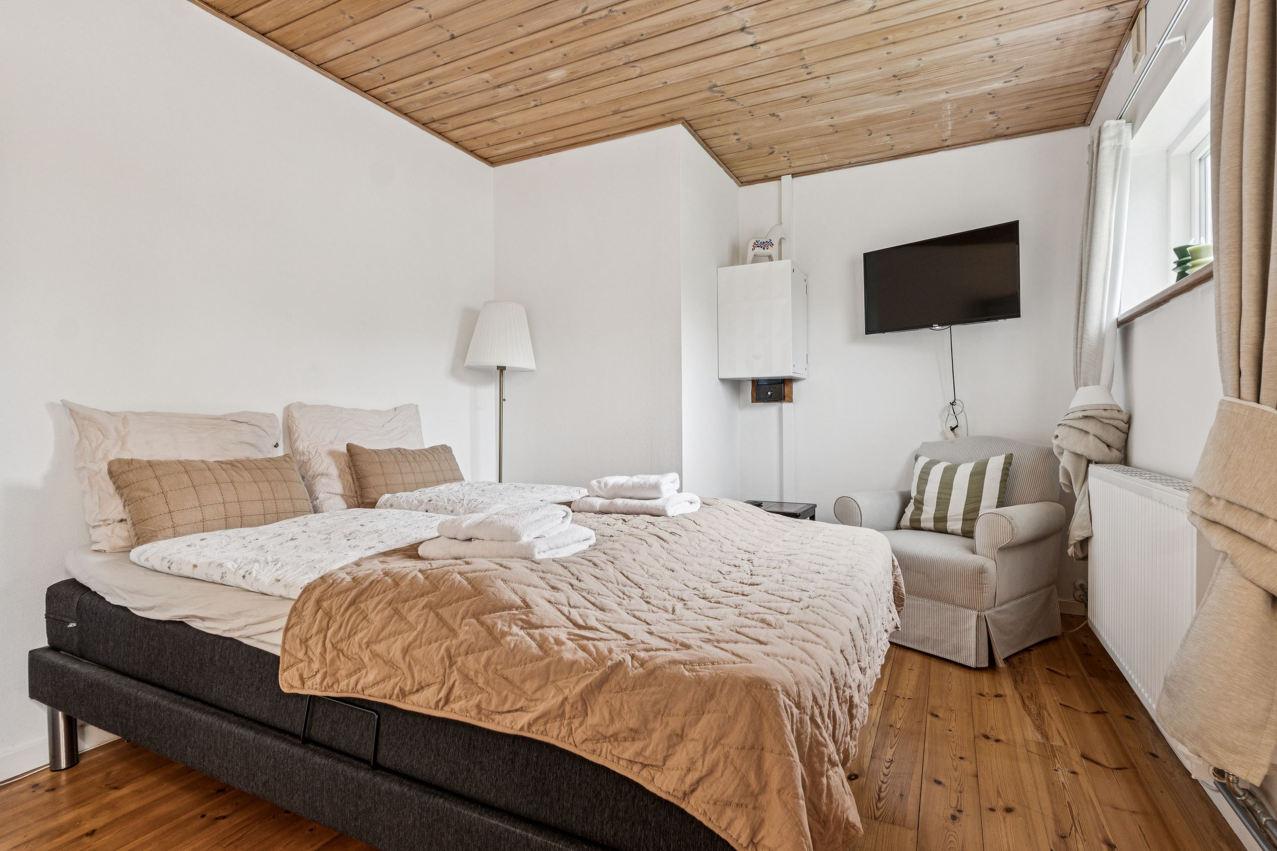 Ved siden af hovedhuset, med egen indgang og lille terrasse, er der en separat lejlighed (ikke beboelse) indrettet med entré, pænt brusebadeværelse, køkken, spiseplads, dobbeltseng, skab og fjernsyn - denne del er ideel til teenageren/ Airbnb/udlejning/gæstebolig m.v.