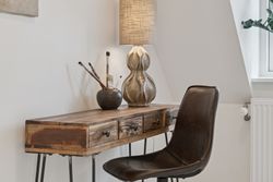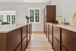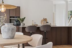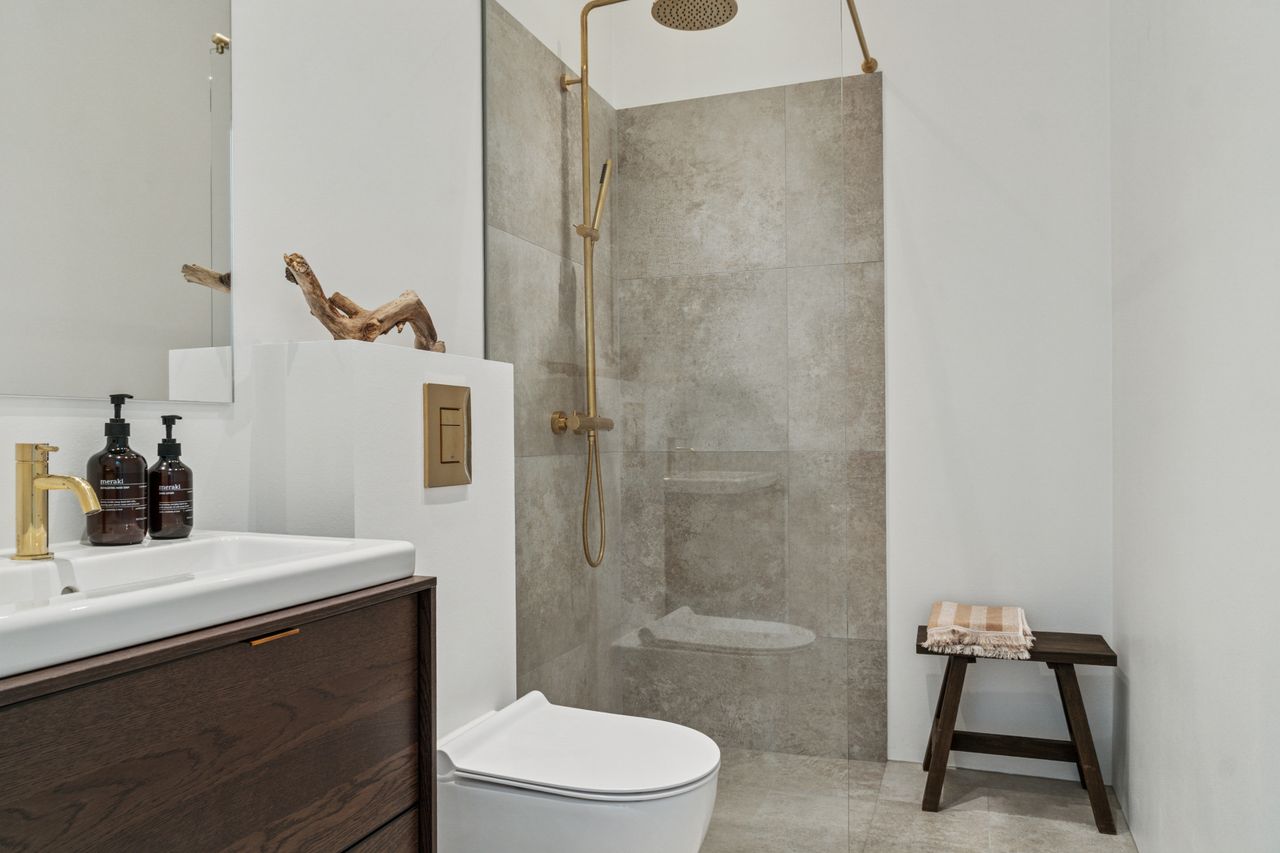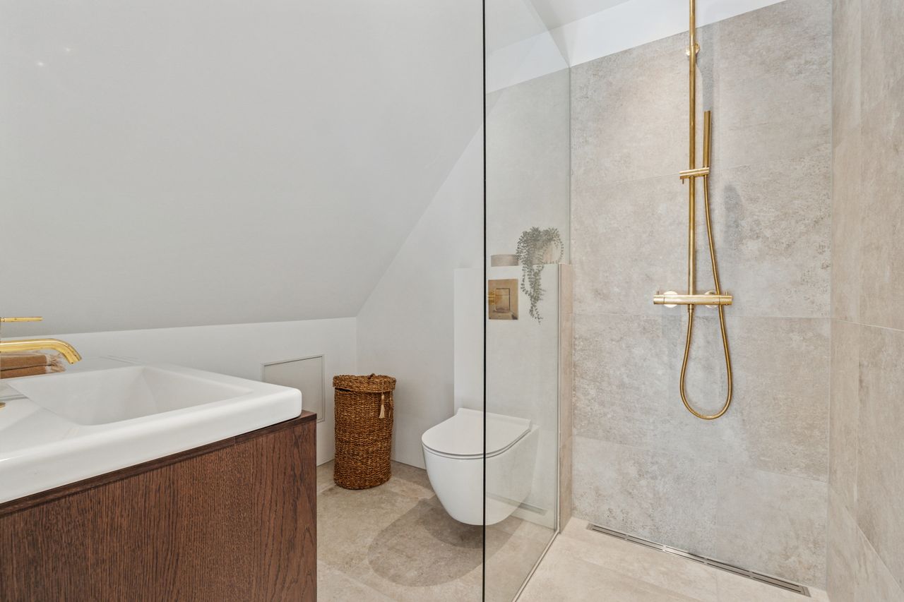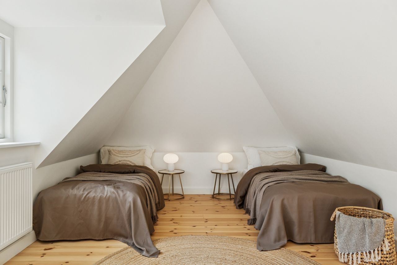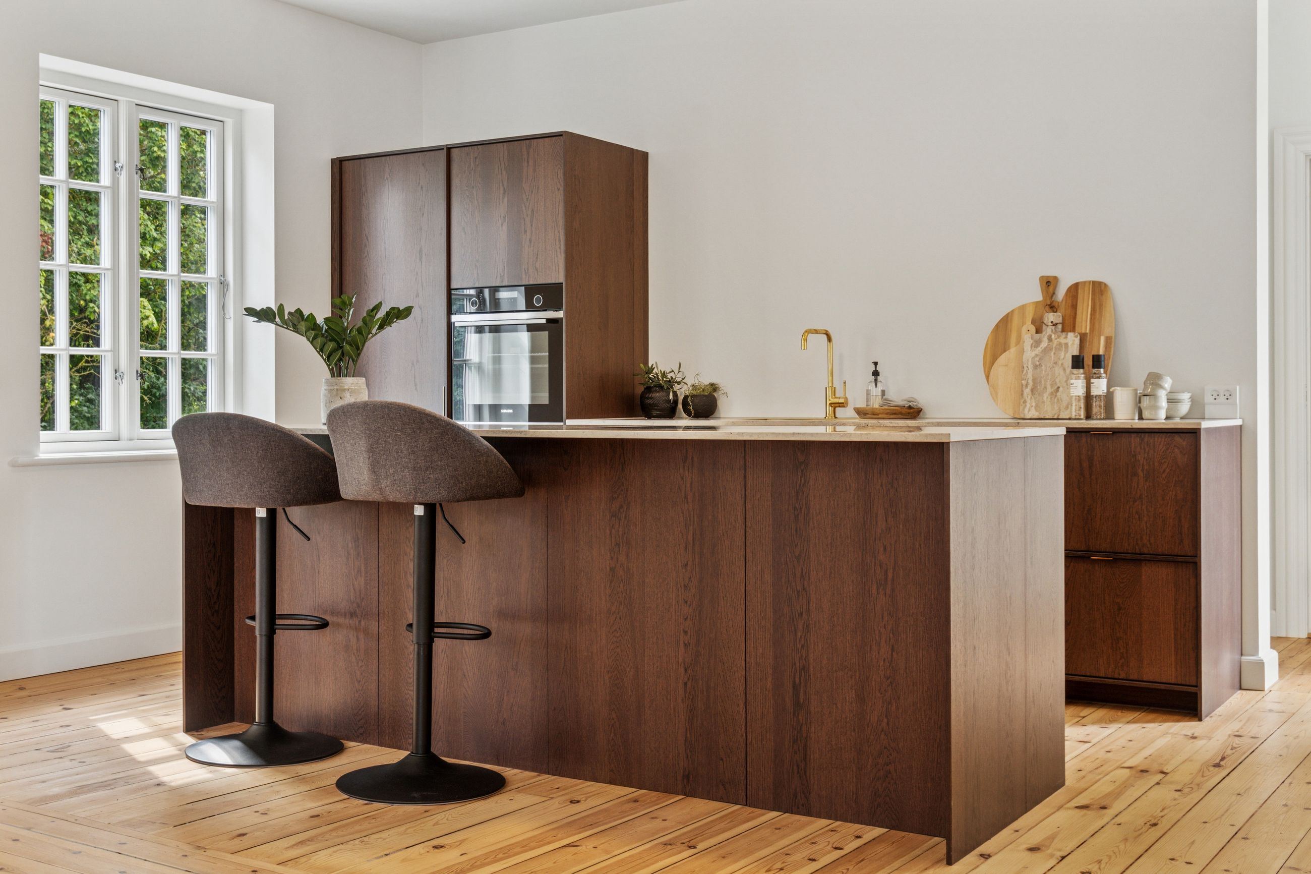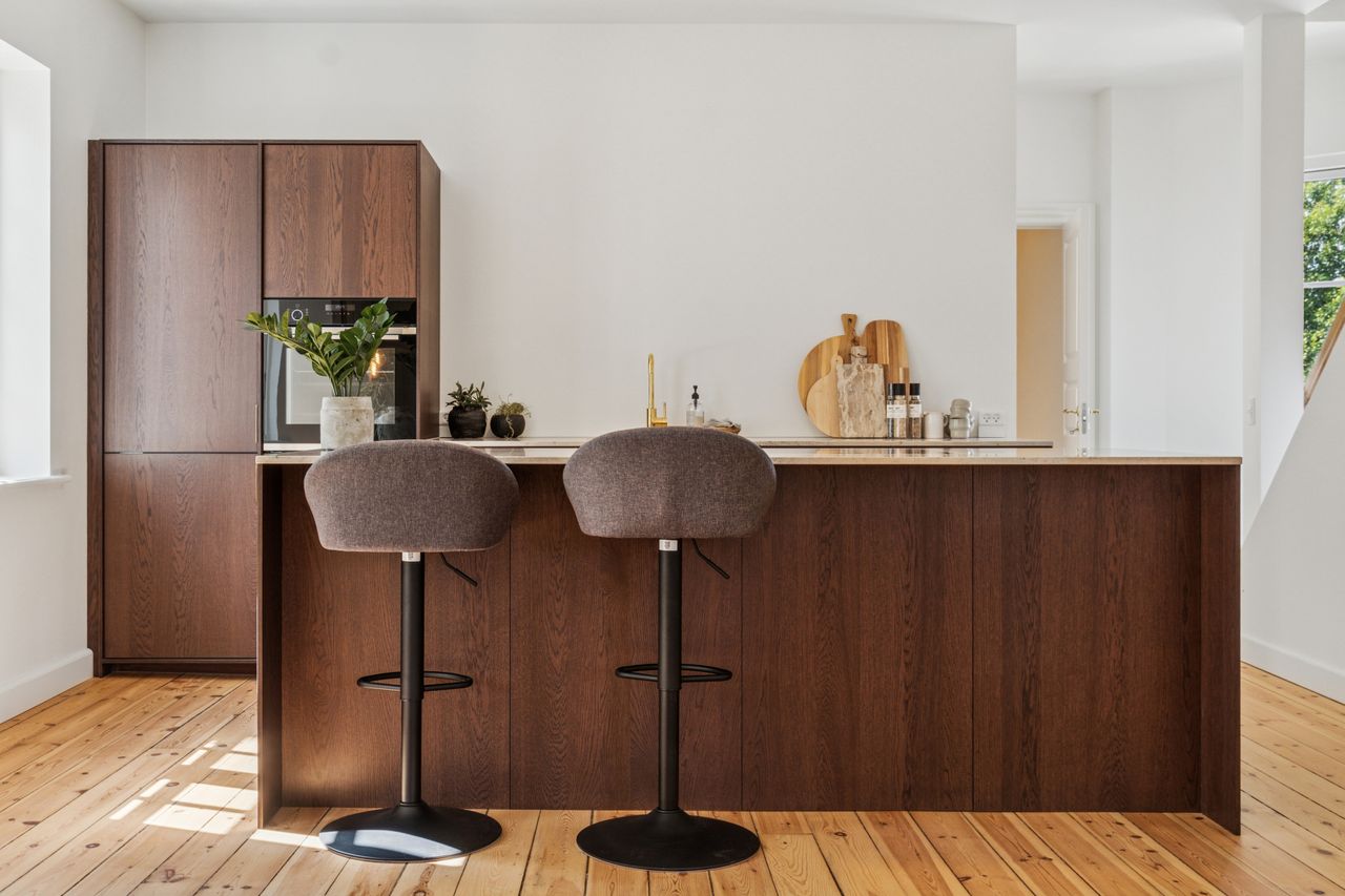 Den udbudte lejlighed udgør 132 m2 fordelt på to plan og er indrettet med fokus på både funktionalitet og stil. Boligen rummer et stort, åbent køkken-alrum og stue med mørke køkkenfronter, eksklusiv stenbordplade og messingdetaljer, der tilsammen skaber et raffineret og tidløst udtryk. De store vinduespartier sikrer et generøst lysindfald, og en indbygget kanap i stuen skaber et stemningsfuldt hjørne til eksempelvis spiseplads eller kontor. På denne etage findes desuden et stilrent badeværelse med lyse naturfliser og mørkt badeværelsesmøbel samt et soveværelse og adgang til en altan med udsigt til den rolige gårdsplads. Øverste etage rummer yderligere to værelser, et kontor samt endnu et badeværelse – alle i samme gennemførte designlinje.