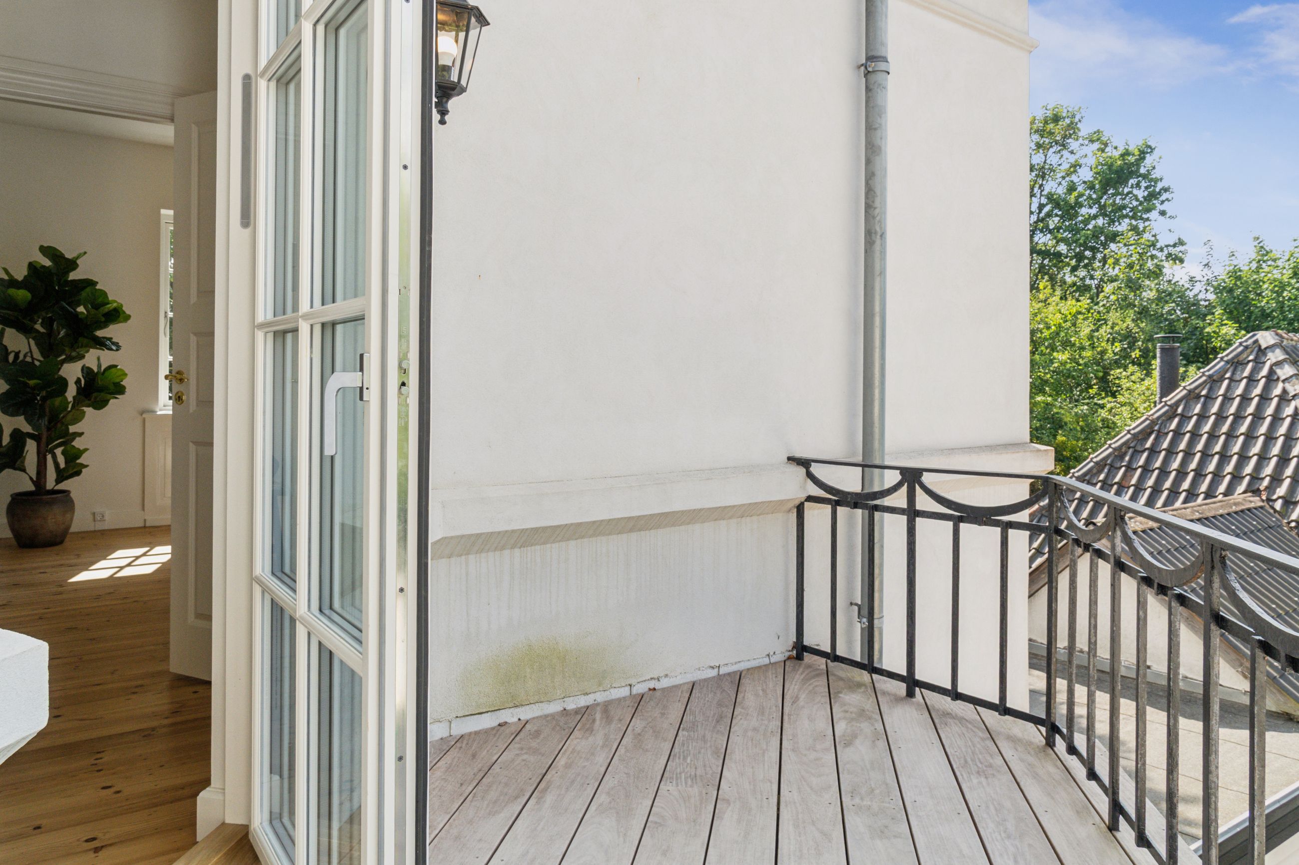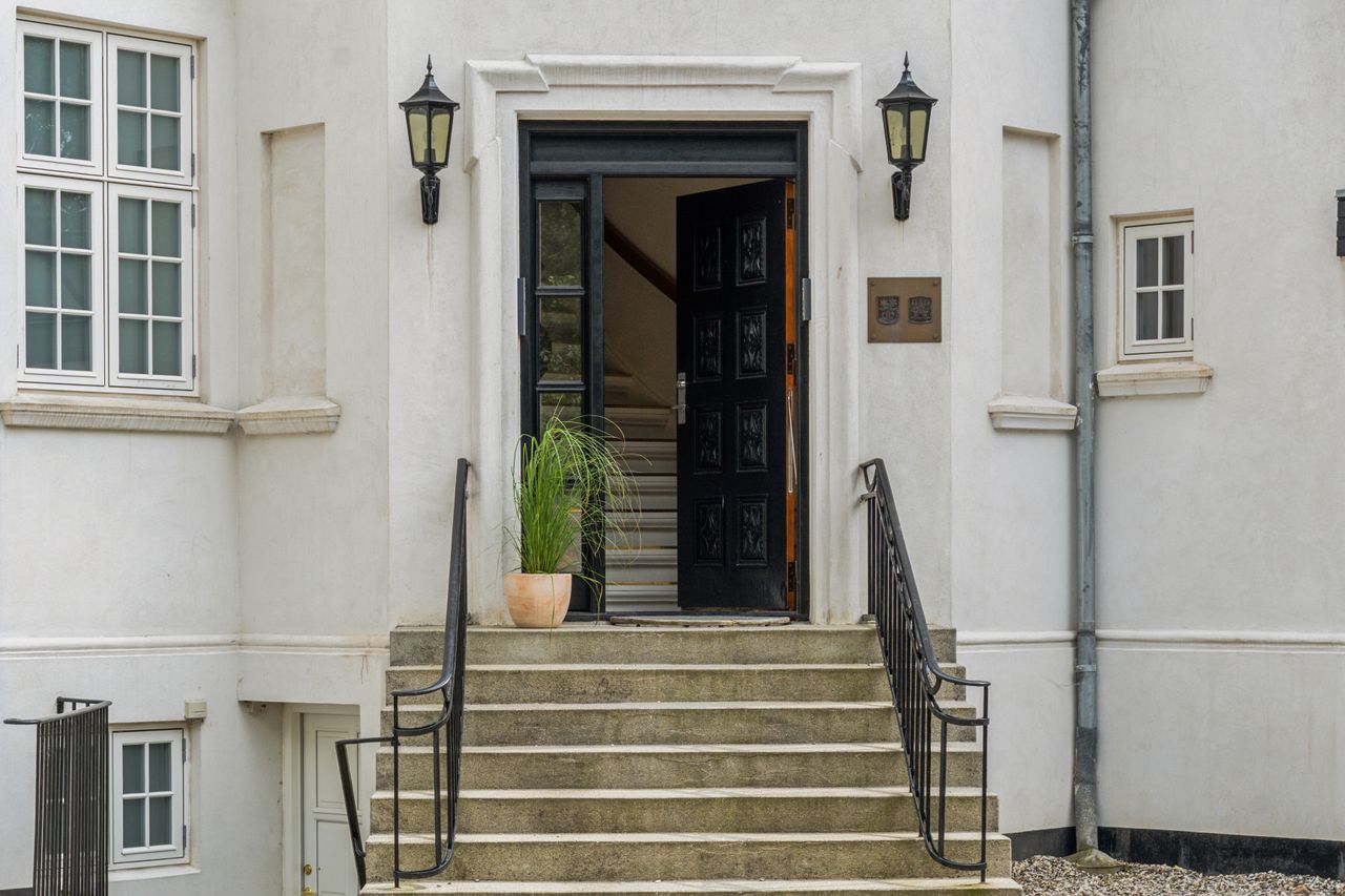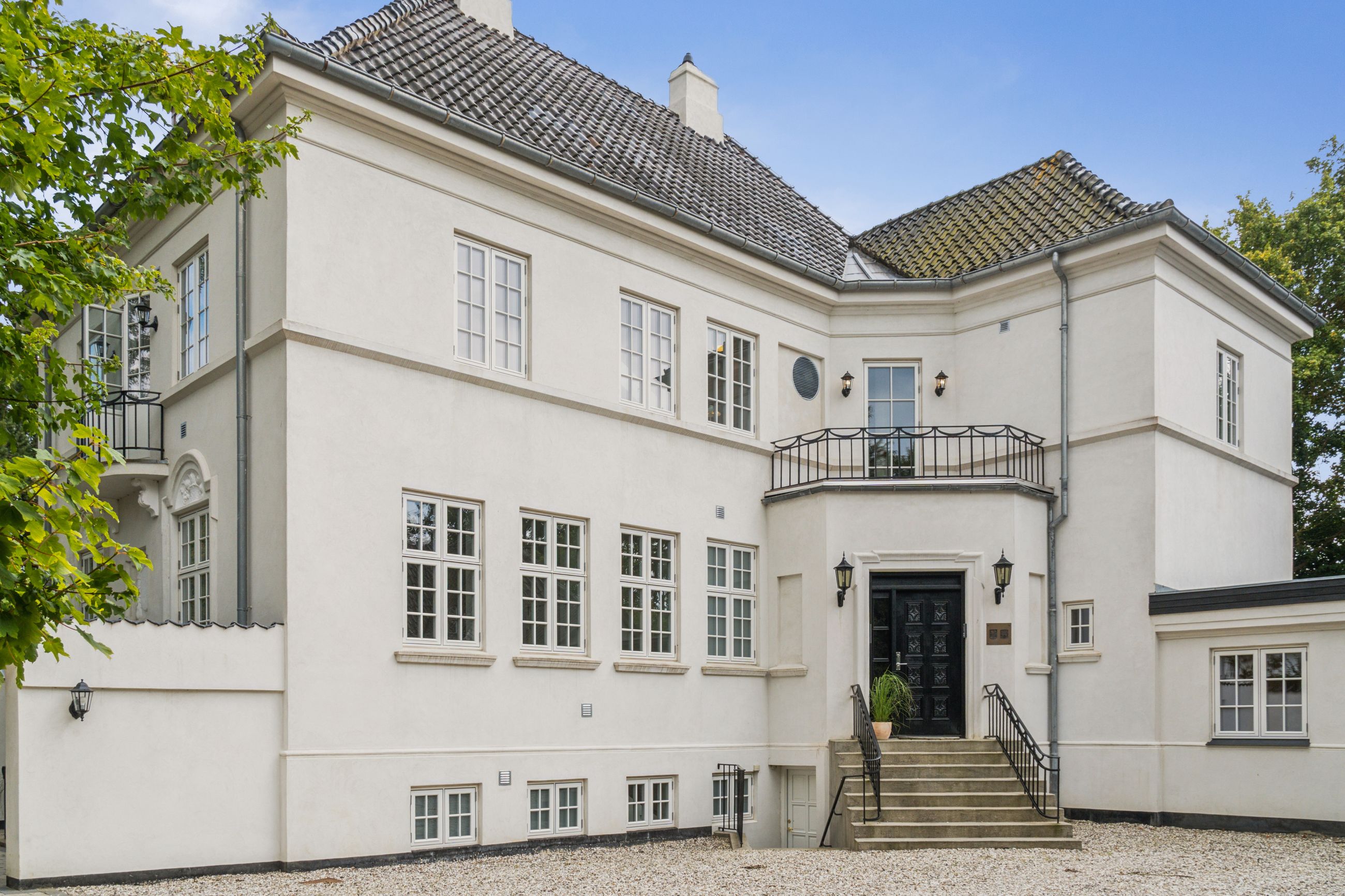 Ved ankomst mødes man af et smuk hvidmalet palæ, omgivet af en stor park med varieret beplantning, plantagetræer, skulpturer og gode parkeringsforhold. En flisebelagt sti fører til hovedindgangen, mens bagsiden af ejendommen byder på en elegant trappeopgang med adgang til den originale hoveddør. Denne åbner op til en rummelig og præsentabel hall belagt med marmor, hvor den klassiske arkitektur møder moderne forfinelse. Hallen giver adgang til de to stuelejligheder samt trappeopgangen til lejlighederne på første sal.