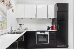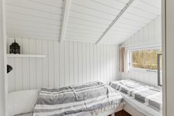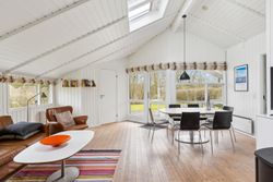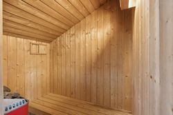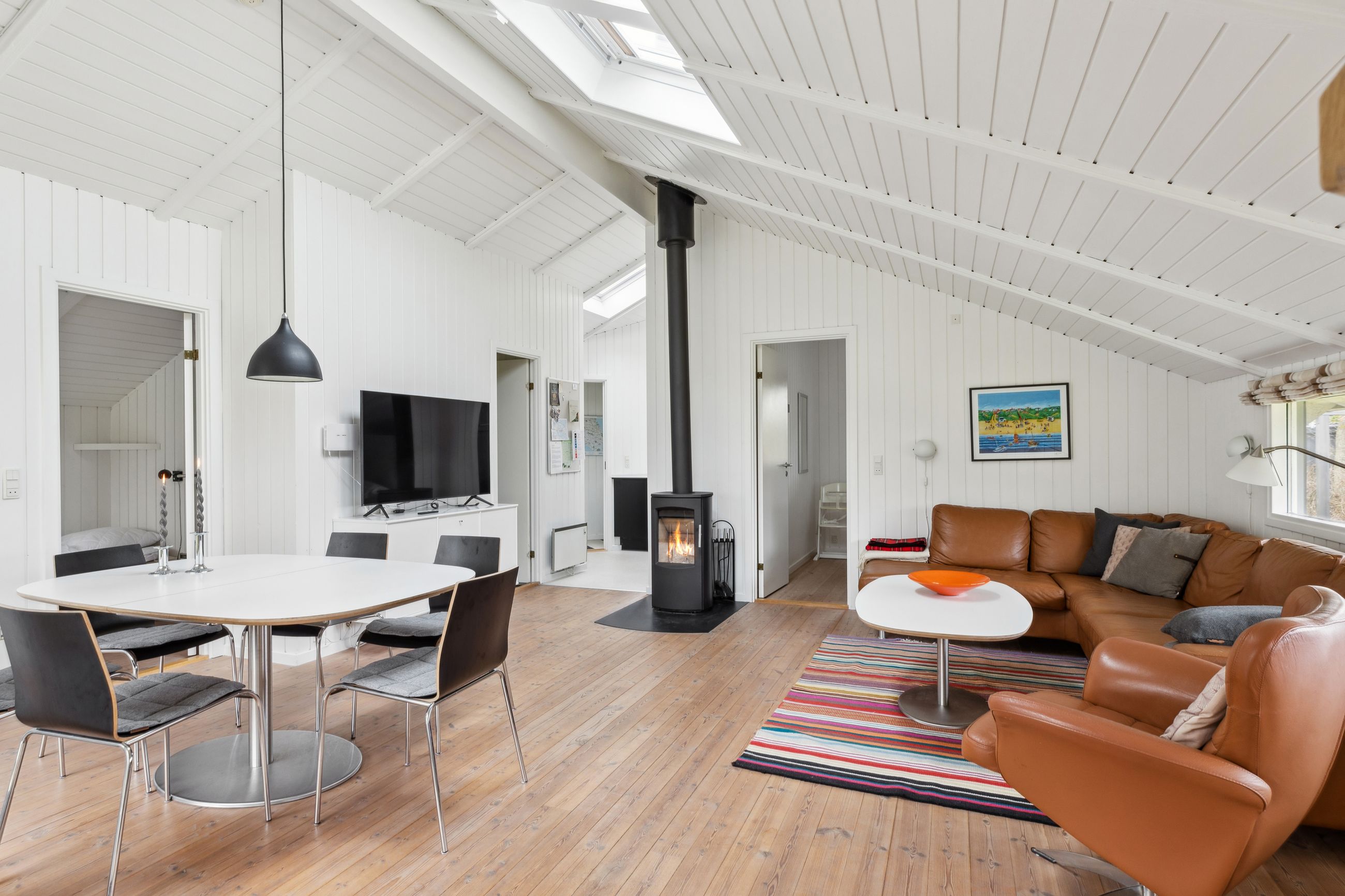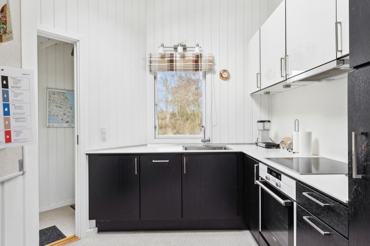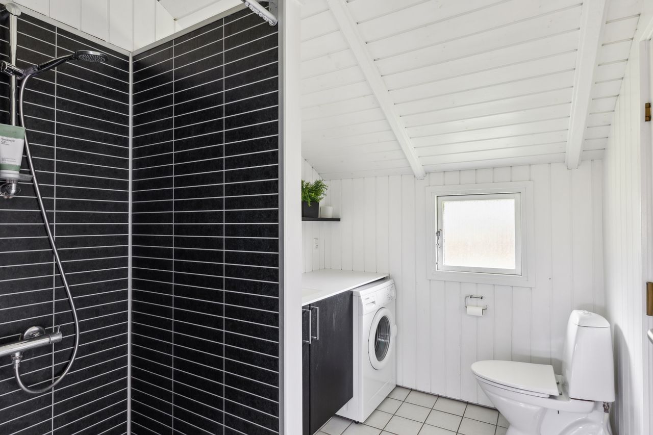 Ved ankomst til sommerhuset bliver du budt velkommen i en lys entré, der leder dig videre ind i husets hjerte – et stort, lyst og rummeligt køkken-alrum og stue i ét. Her er loft til kip, ovenlysvinduer og store vinduespartier, der lader lyset strømme ind og skaber en indbydende atmosfære. Køkkenet er stilrent og placeret i en let vinkel, hvilket gør, at det naturligt smelter sammen med opholdsrummet uden at forstyrre den åbne og rummelige stue. Der er god plads til både madlavning, spiseafdeling og hyggelige stunder med familien. Fra stuen er der direkte udgang til en skøn, delvist overdækket terrasse og den hyggelige have. Sommerhuset rummer desuden tre gode værelser, som alle ligger separat for at sikre privatliv – perfekt til familien eller gæster. Badeværelset er tidløst med bruseniche og mulighed for vaskefaciliteter. Som en ekstra luksus har huset en sauna, hvor du kan nyde velvære efter en lang dag i naturen.