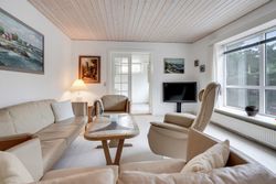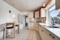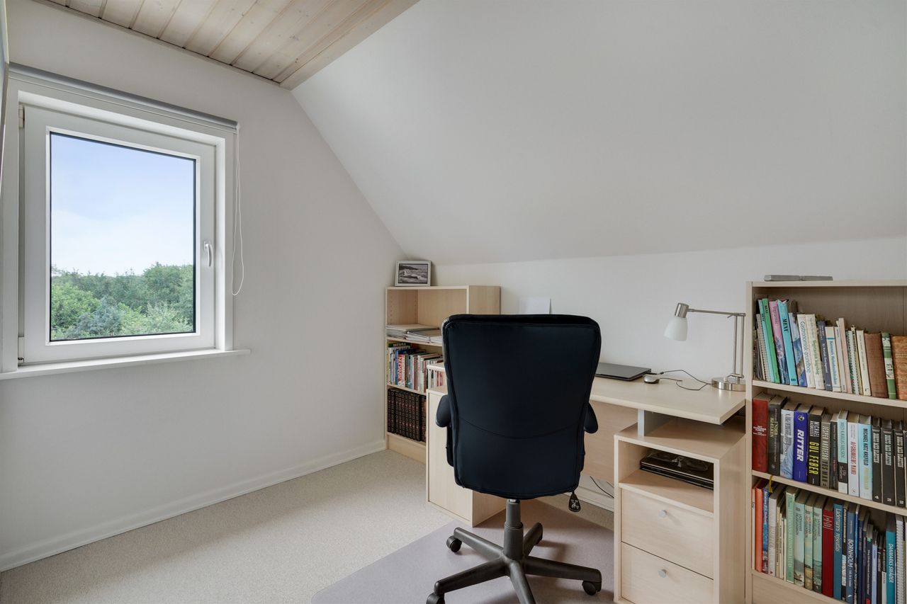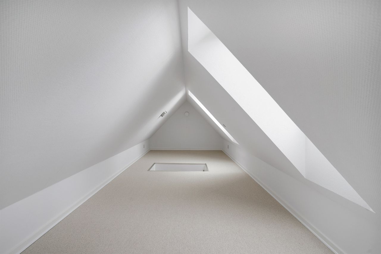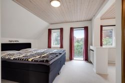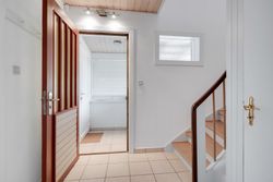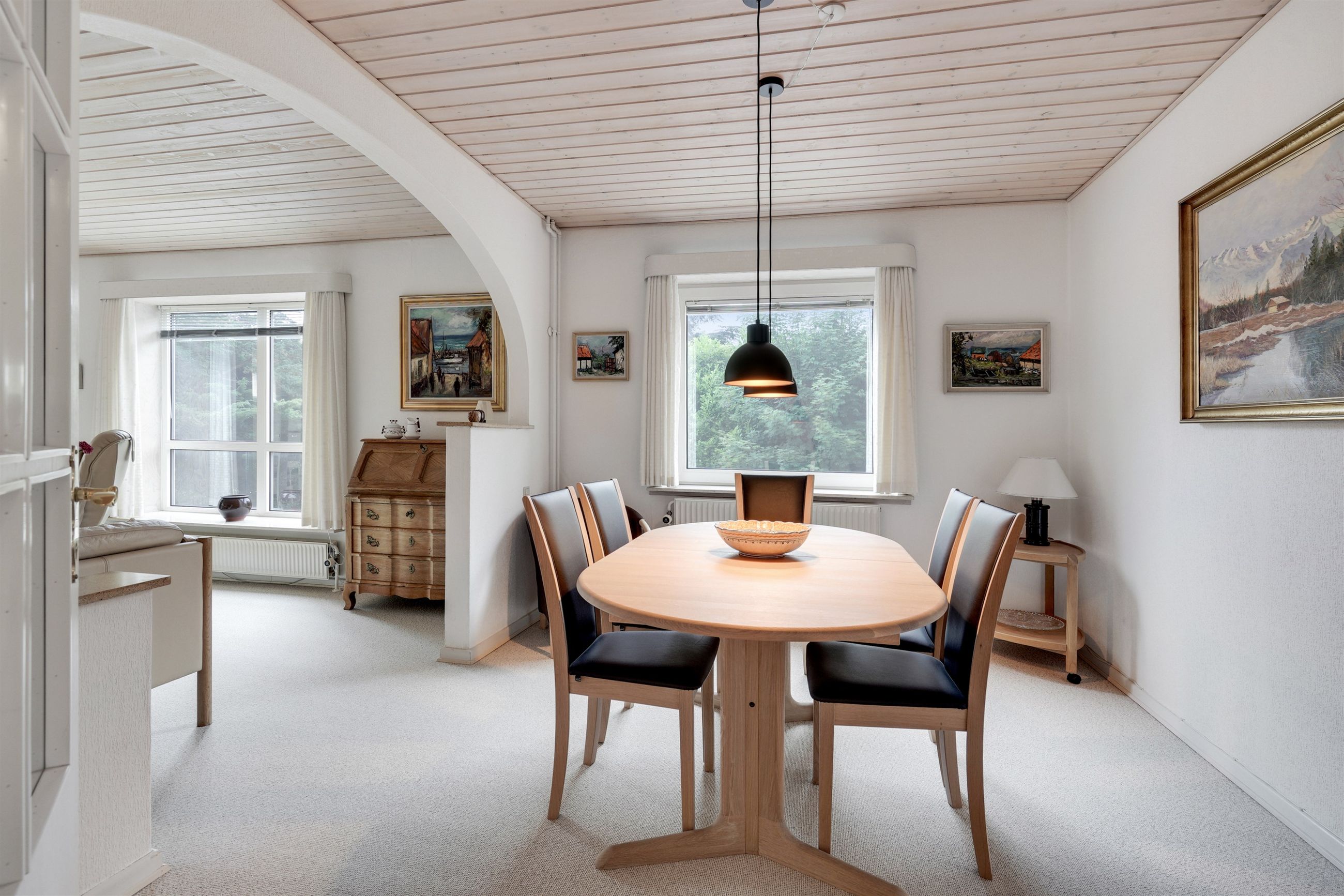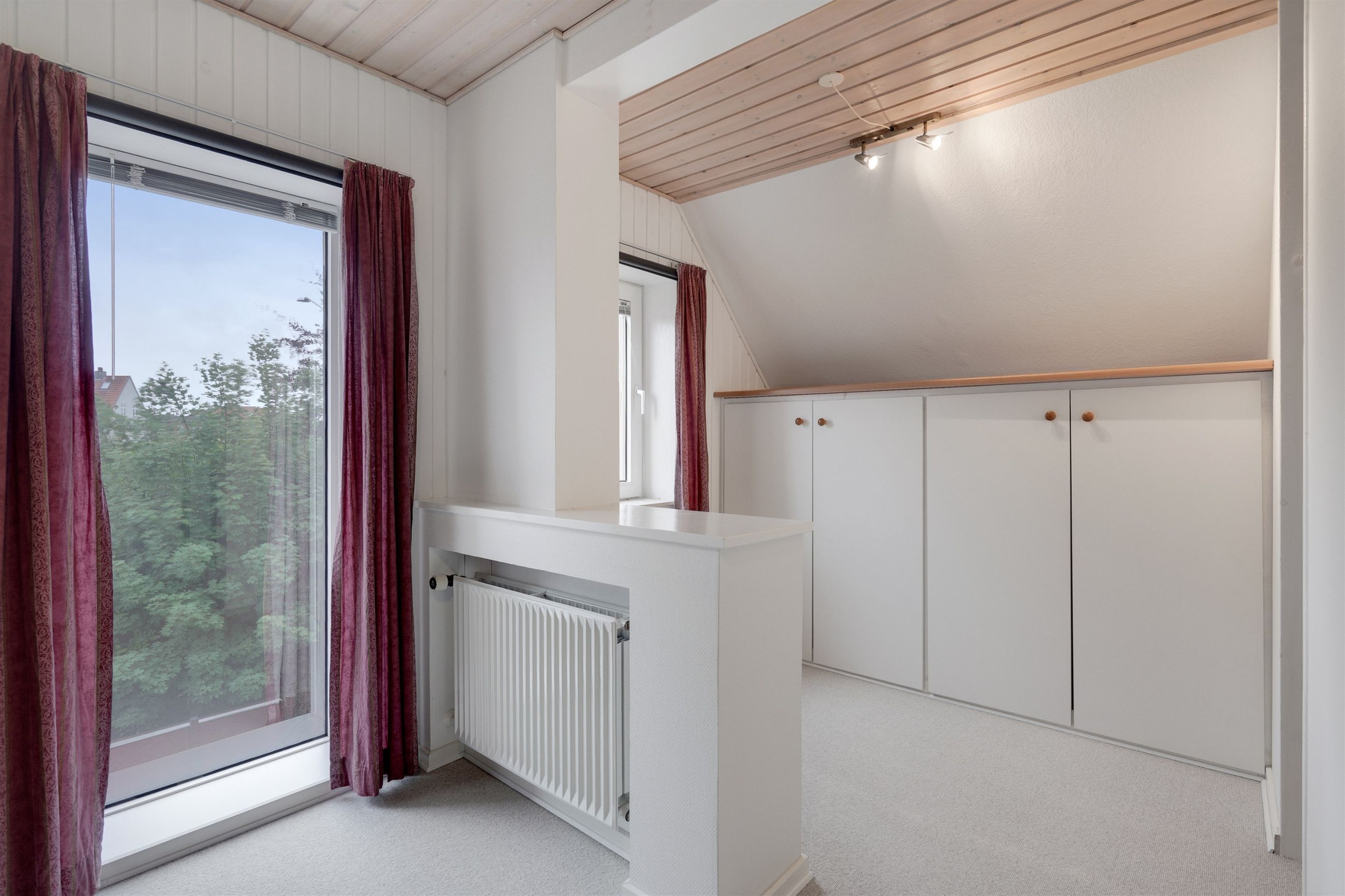 Indendørs fremstår boligen både klassisk og funktionel. Man træder ind via vindfang og entré, som giver adgang til den store, indbydende stue. Her opdeles sofa- og spiseområde elegant af en buet mur, som skaber karakter og rumfornemmelse. Fra spisestuen er der adgang til et lyst og velholdt køkken med skøn udsigt over haven. I stueetagen findes desuden et pænt, lyst gæstetoilet. På førstesalen venter et rummeligt soveværelse med walk-in closet, et ekstra værelse samt et pænt badeværelse i lyse nuancer.