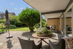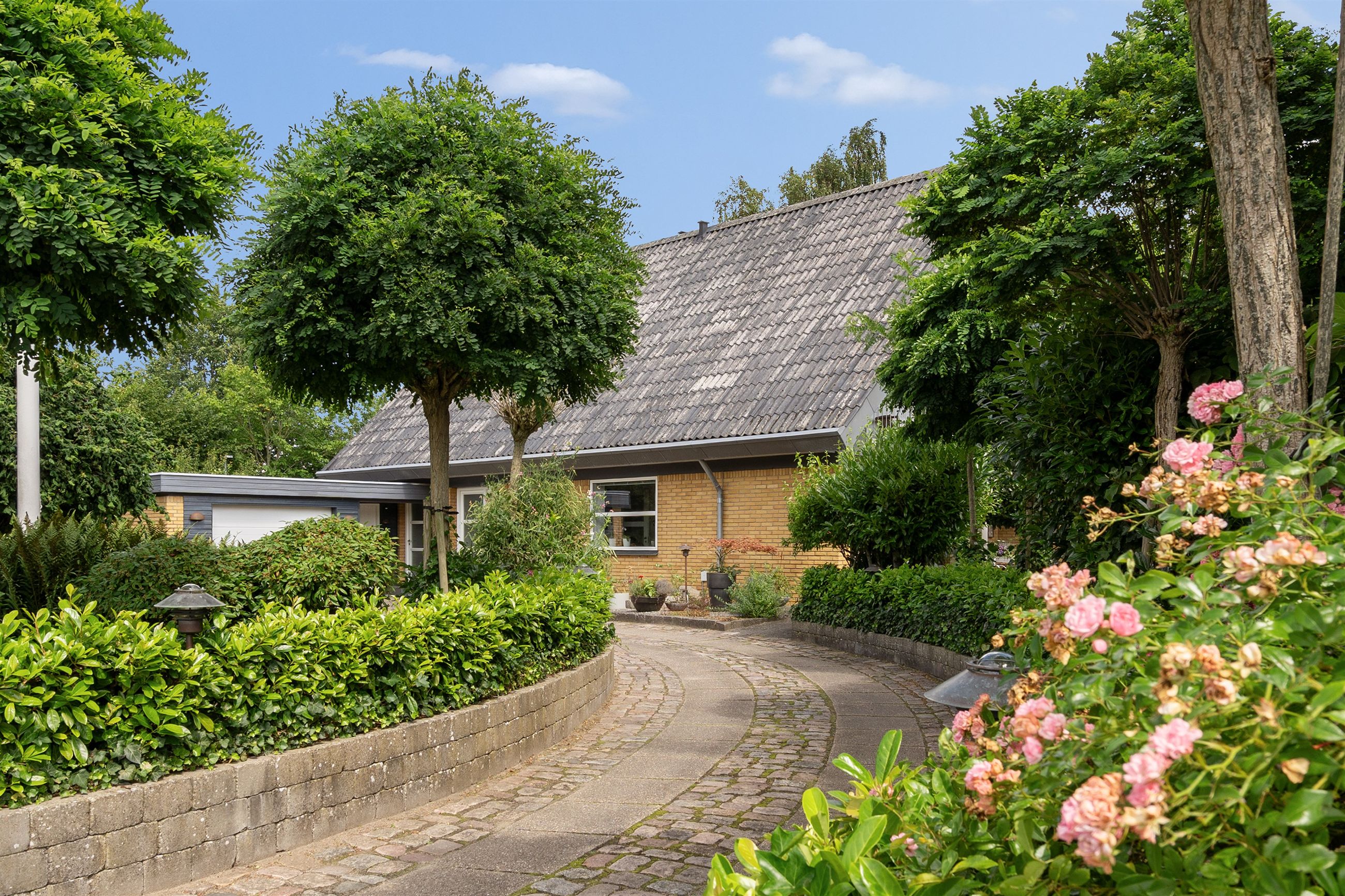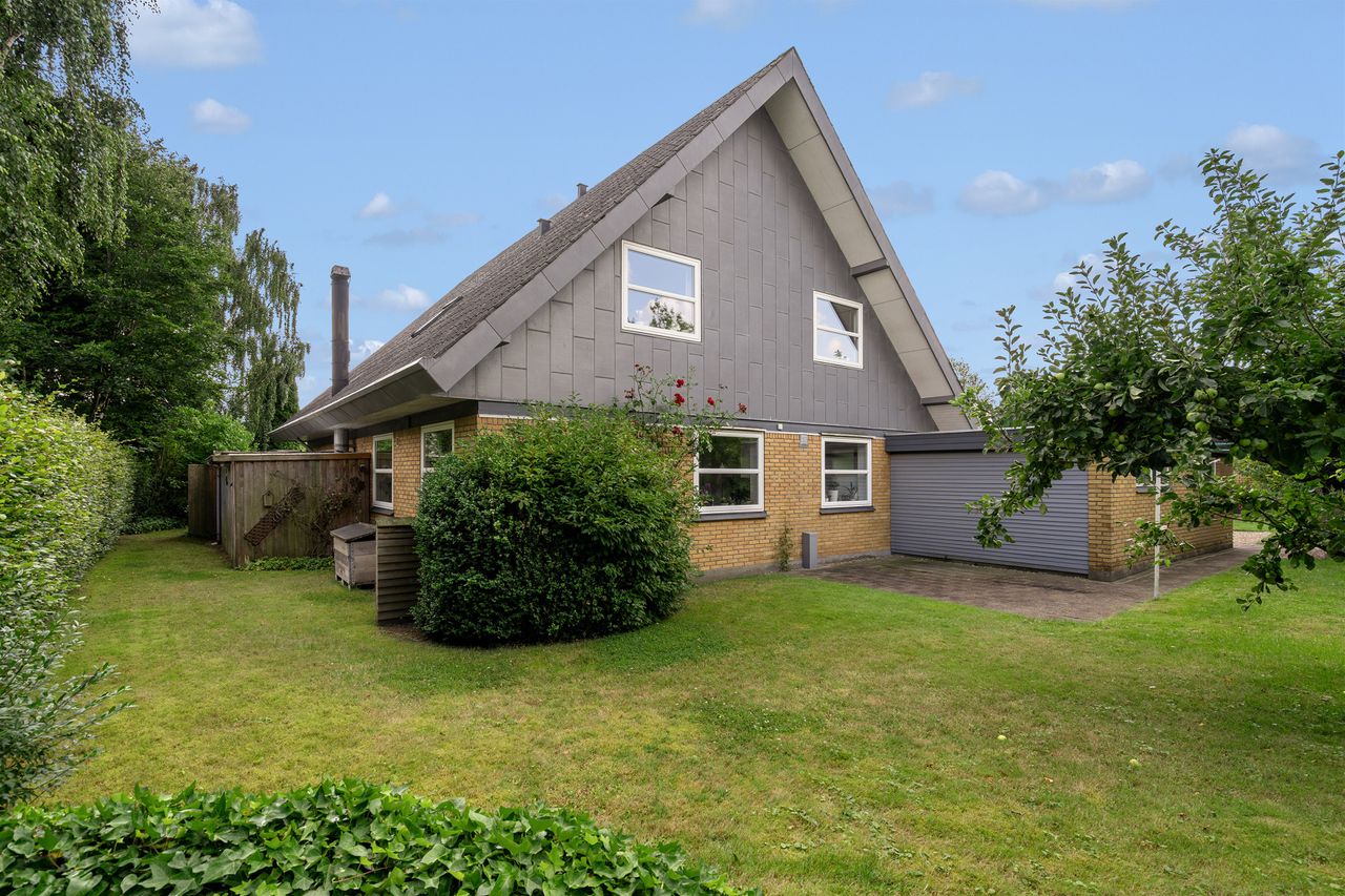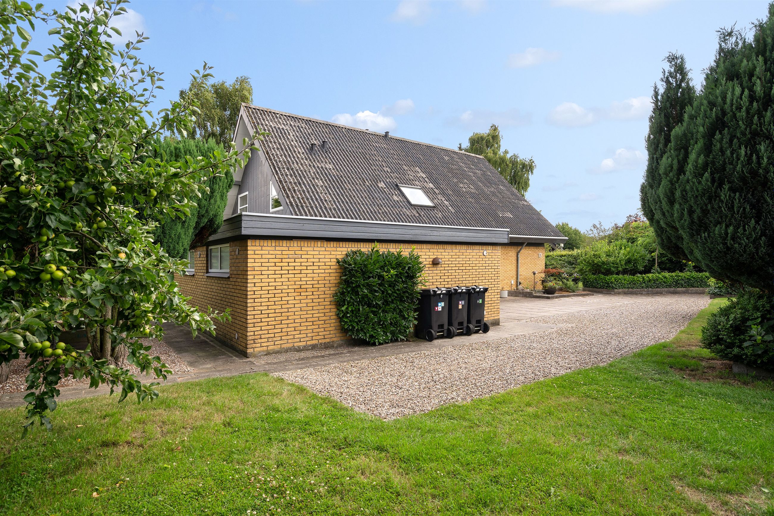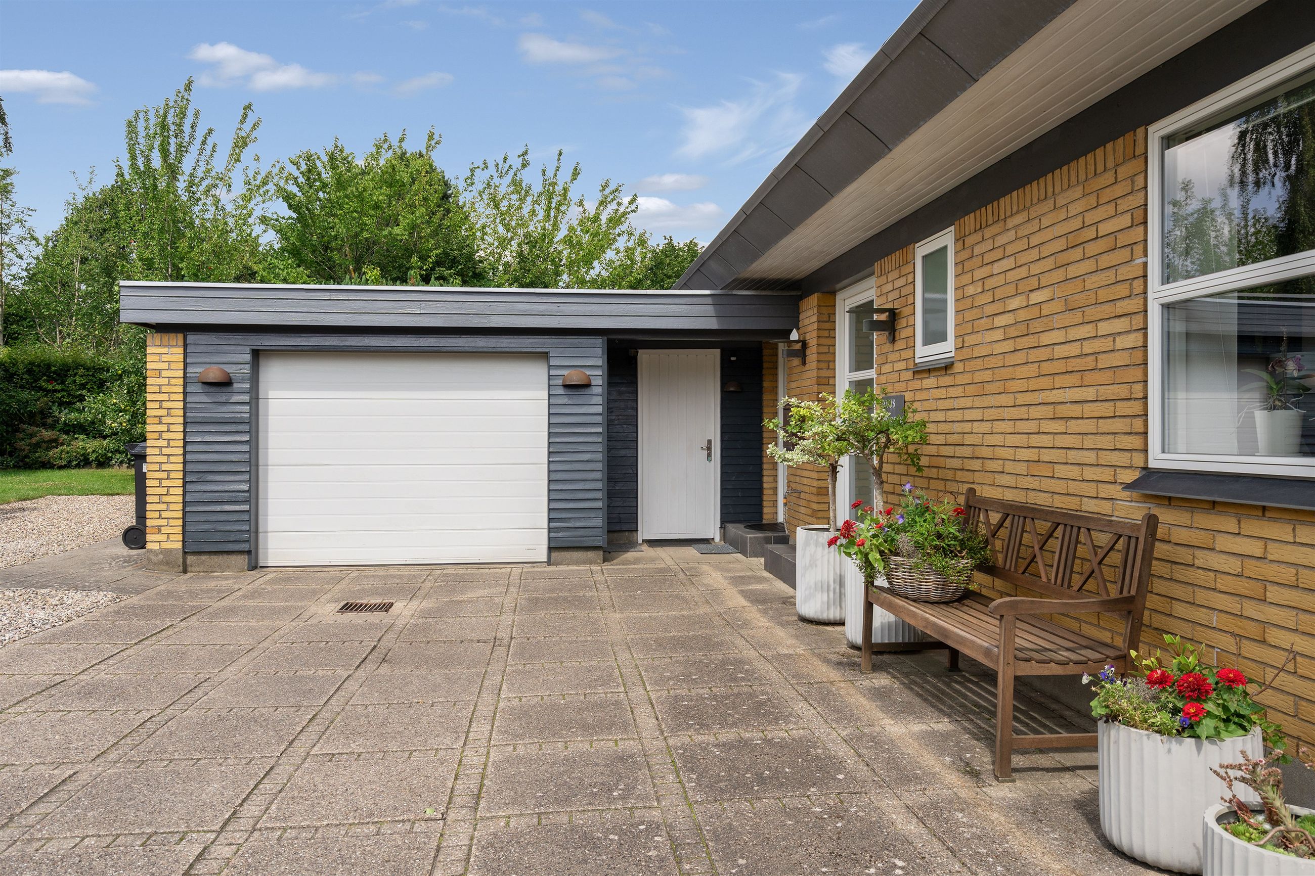 Ejendommen ligger på en lukket og privat grund, hvor der er plads til både leg og afslapning. Haven rummer flere skønne terrassemiljøer, herunder en stor overdækket terrasse med udgang fra stuen. Til ejendommen hører desuden garage og flere redskabsrum, der giver rig mulighed for opbevaring.