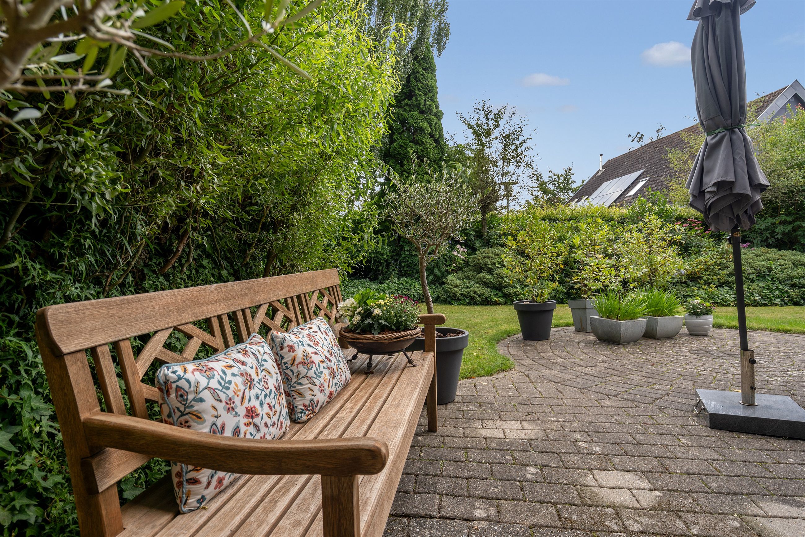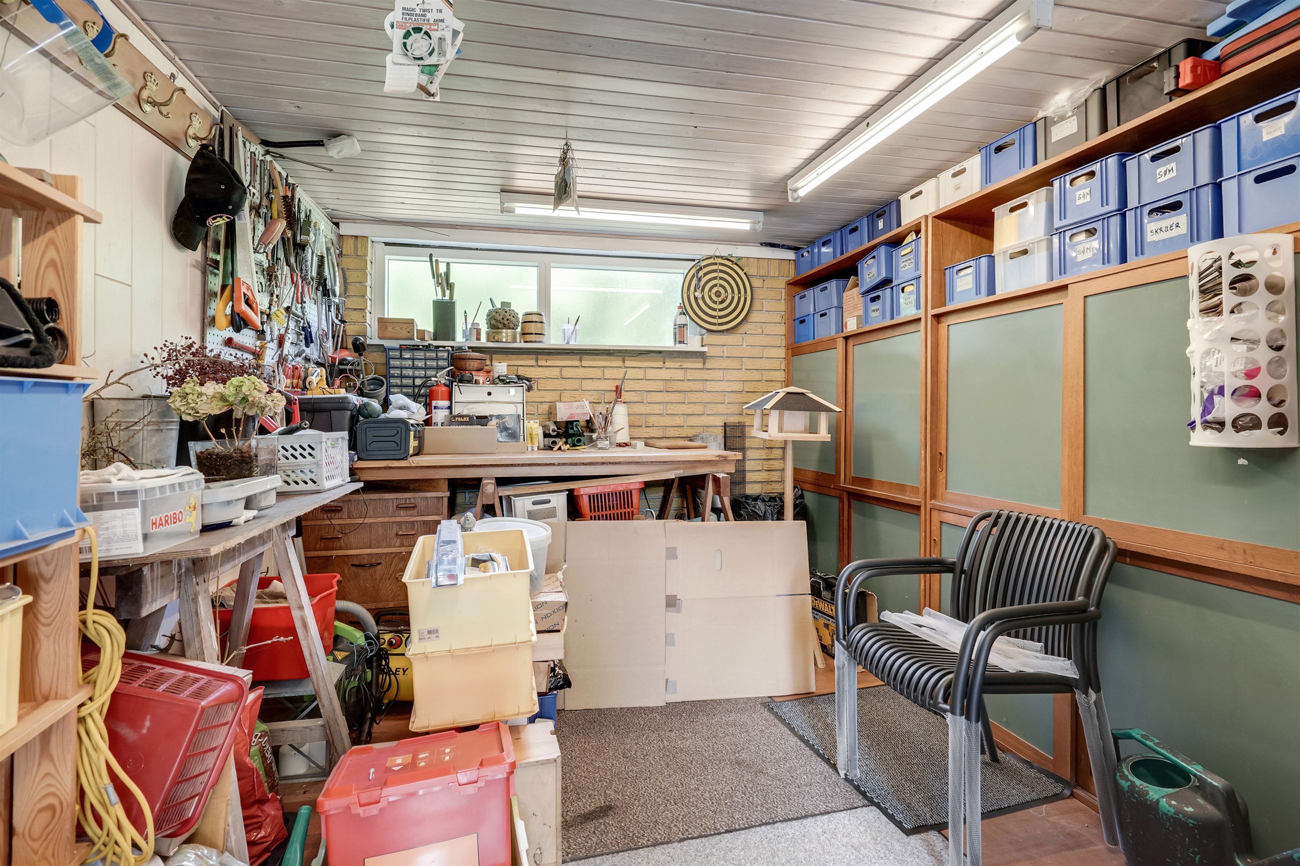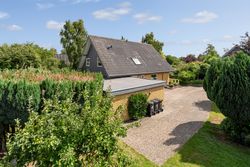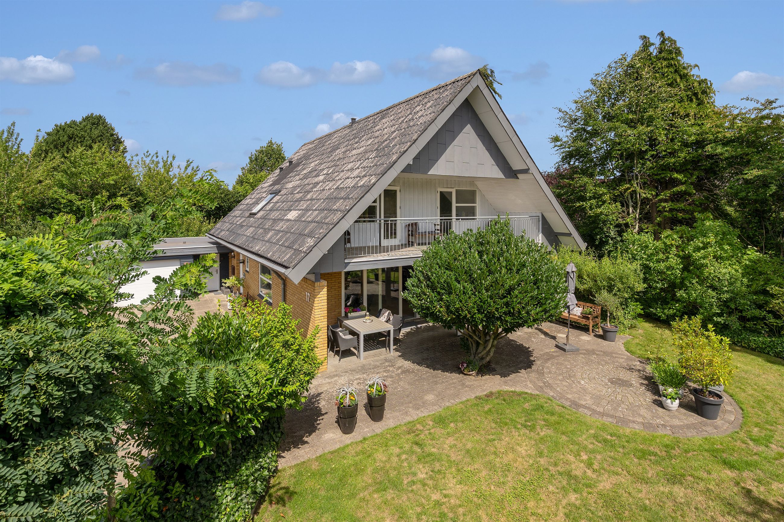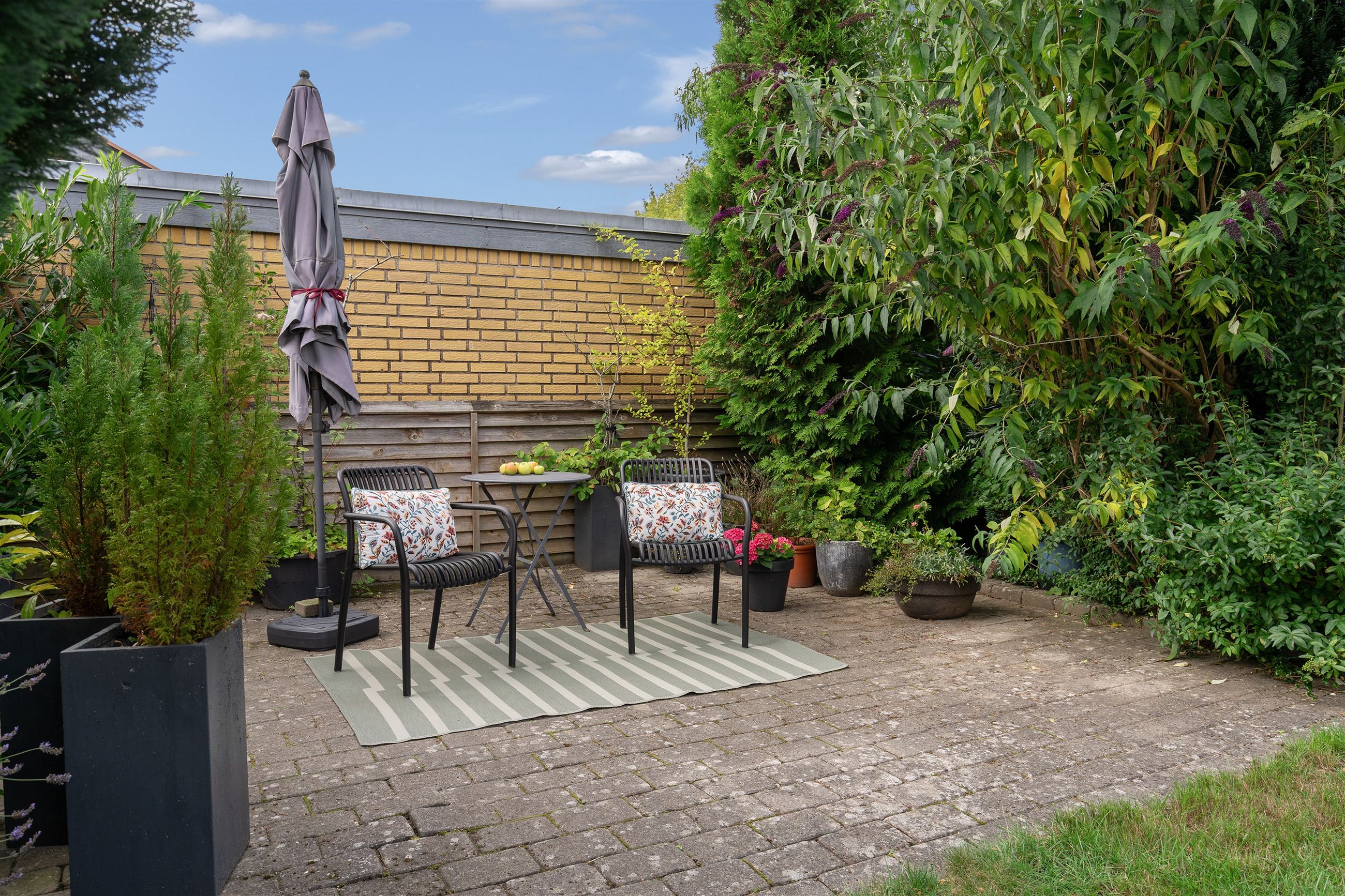 Ejendommen ligger på en lukket og privat grund, hvor der er plads til både leg og afslapning. Haven rummer flere skønne terrassemiljøer, herunder en stor overdækket terrasse med udgang fra stuen. Til ejendommen hører desuden garage og flere redskabsrum, der giver rig mulighed for opbevaring.
