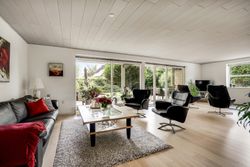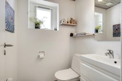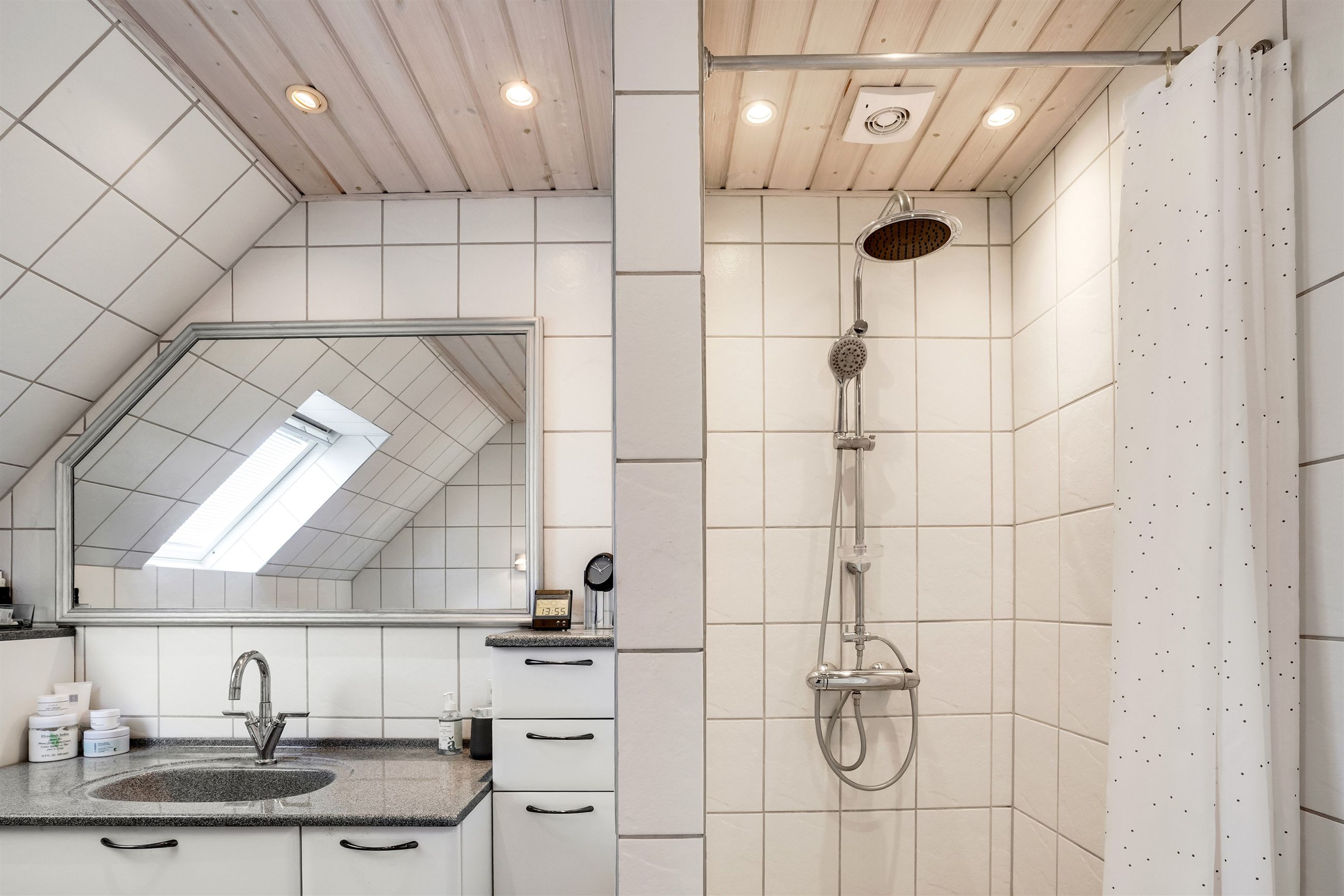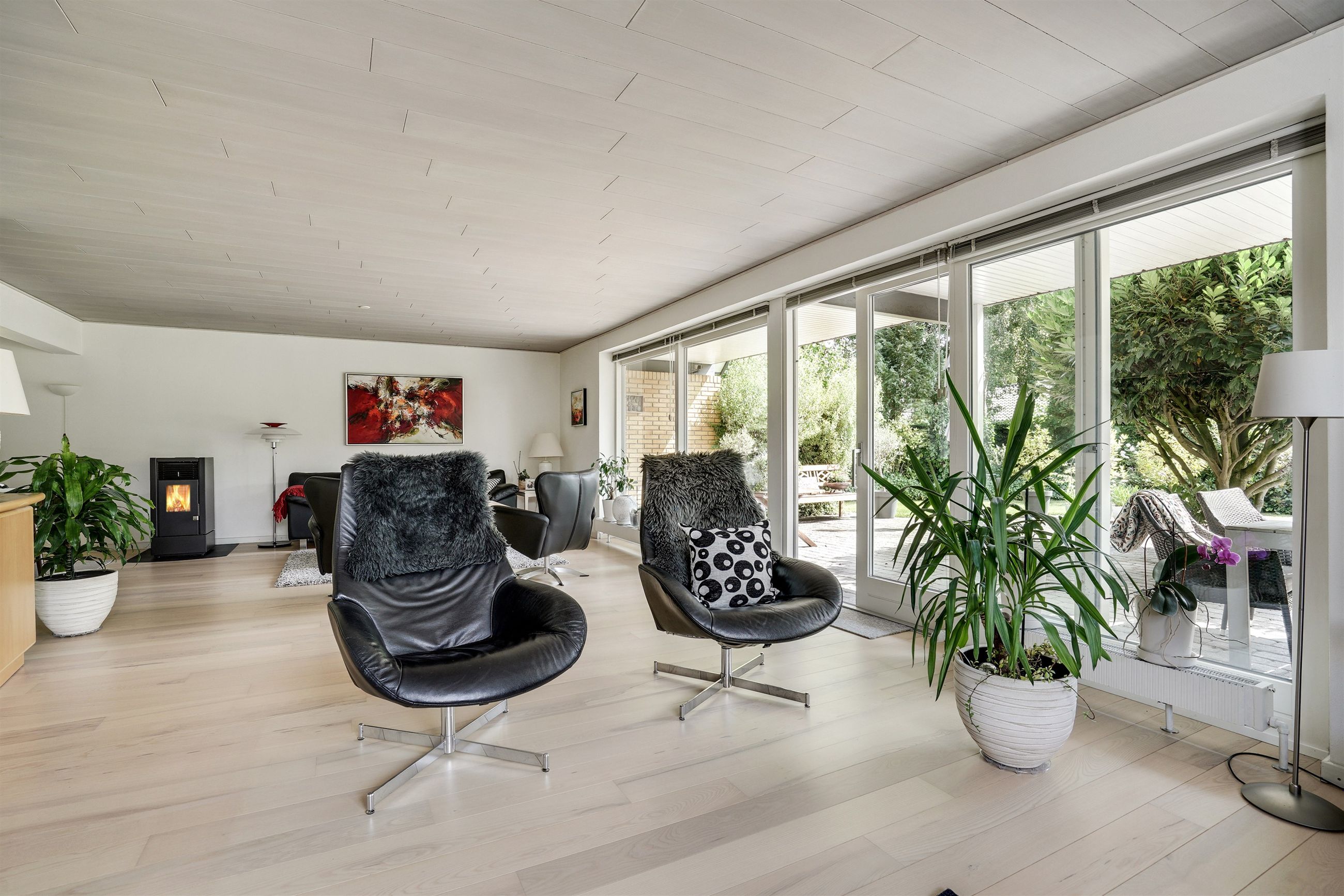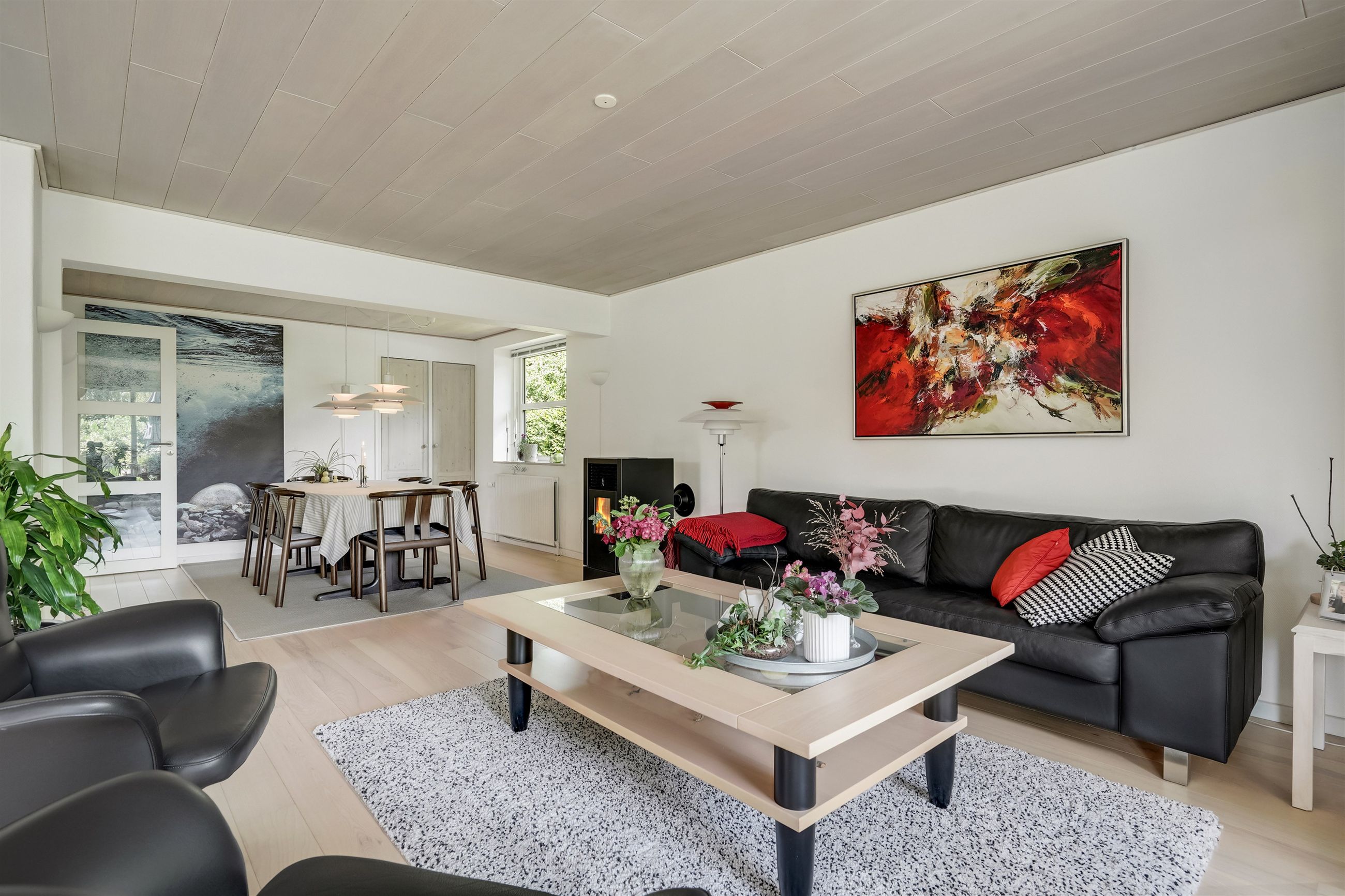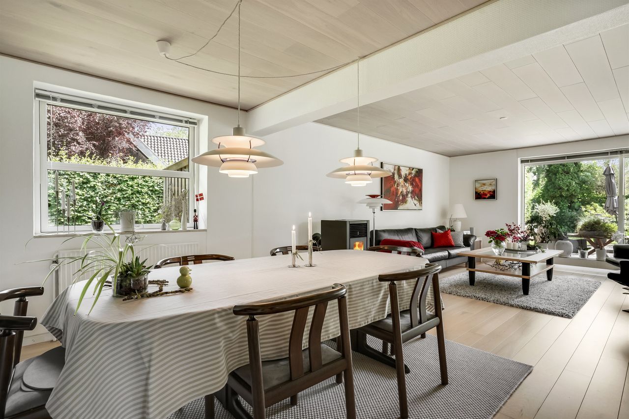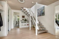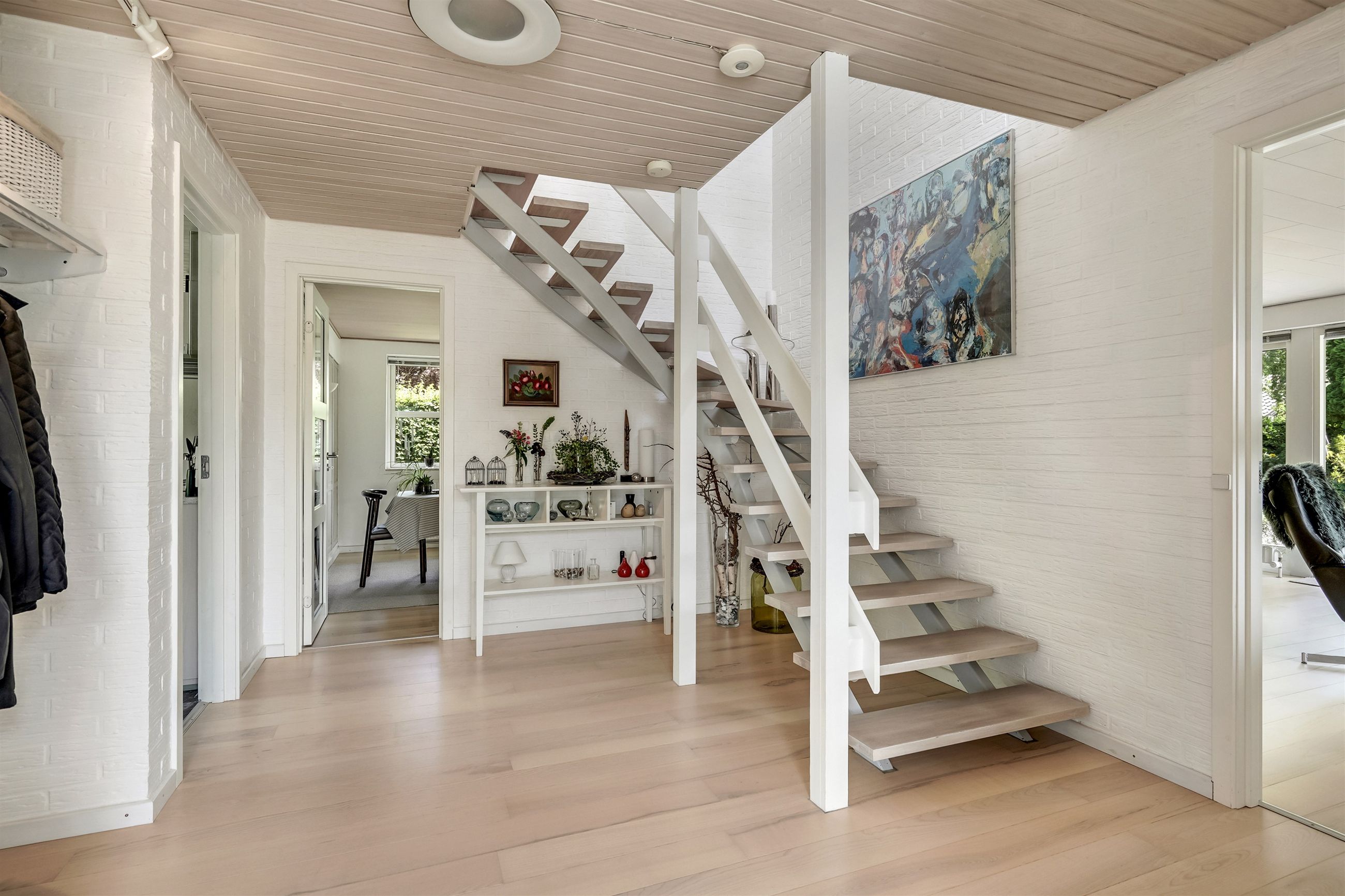 Man bydes velkommen i en stor og indbydende entré, hvorfra boligens rum fordeler sig på praktisk vis. Her finder du et gæstetoilet samt adgang til både det rummelige køkken og den store, lyse vinkelstue. Stuen er indrettet med både opholds- og spisestue, store vinduespartier og direkte udgang til en overdækket terrasse og haven – perfekt til både hverdagsliv og gæster.