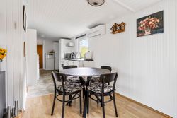 Køkkenet, som blev udskiftet i 2021, fremstår lyst, moderne og funktionelt med god skabsplads og alt i nødvendige faciliteter og det er integreret i det åbne opholdsrum, som byder på et dejligt lysindfald, hyggelig spiseplads, dejlig opholdsstue og udgang til den overdækkede terrasse. Her er der rig mulighed for at nyde sommeraftenerne i fredelige omgivelser.