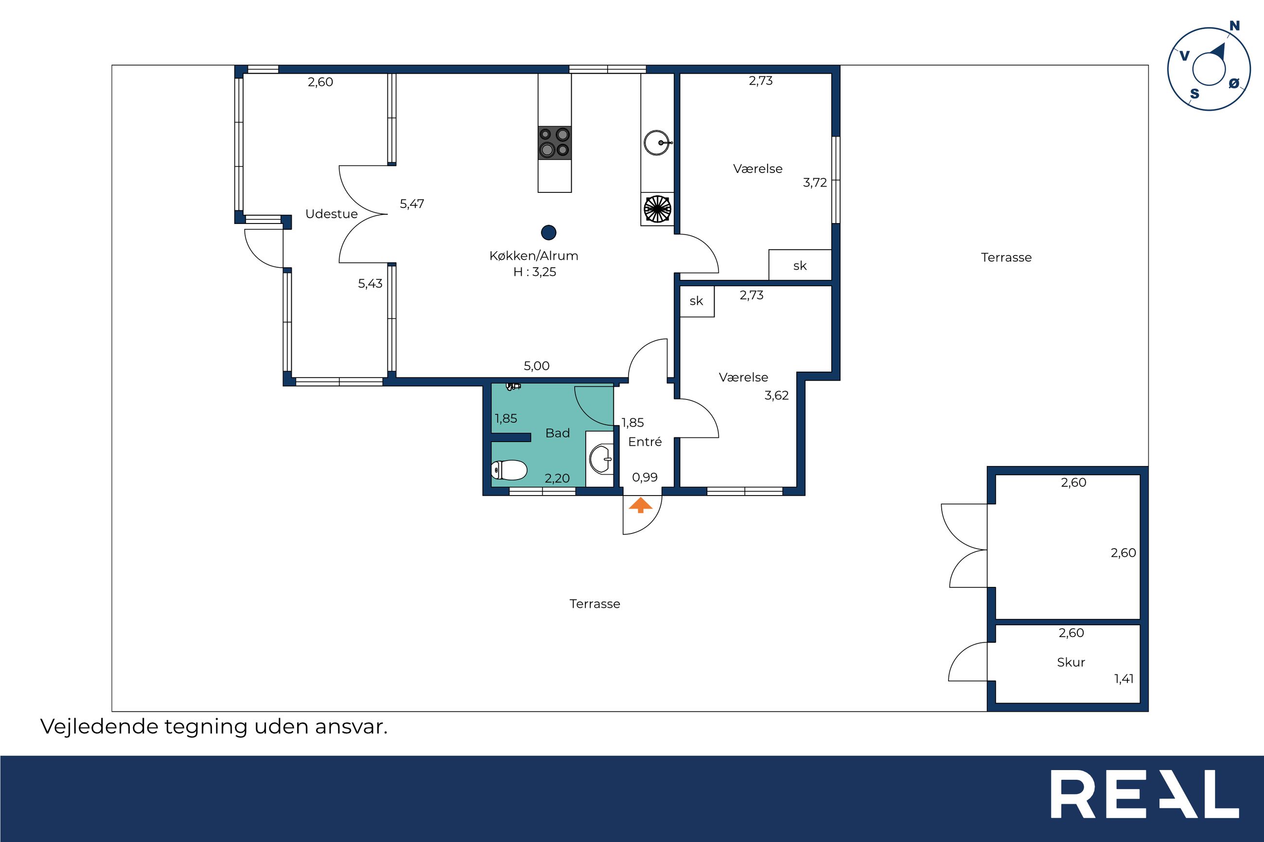 Indvendigt byder huset på en rummelig og praktisk entré, et pænt og nydeligt badeværelse med bruseniche samt et stort og lyst soveværelse med indbyggede skabe. Dertil kommer et ekstra værelse – perfekt som gæsteværelse eller til børnene – også med god skabsplads. Hjertet i huset er det skønne, åbne køkken/alrum/stue med loft til kip, som skaber en skøn rumfornemmelse. Herfra er der direkte udgang til den hyggelige udestue, hvor vinduespartiet dog snart trænger til en opdatering – en oplagt mulighed for at sætte sit eget præg.