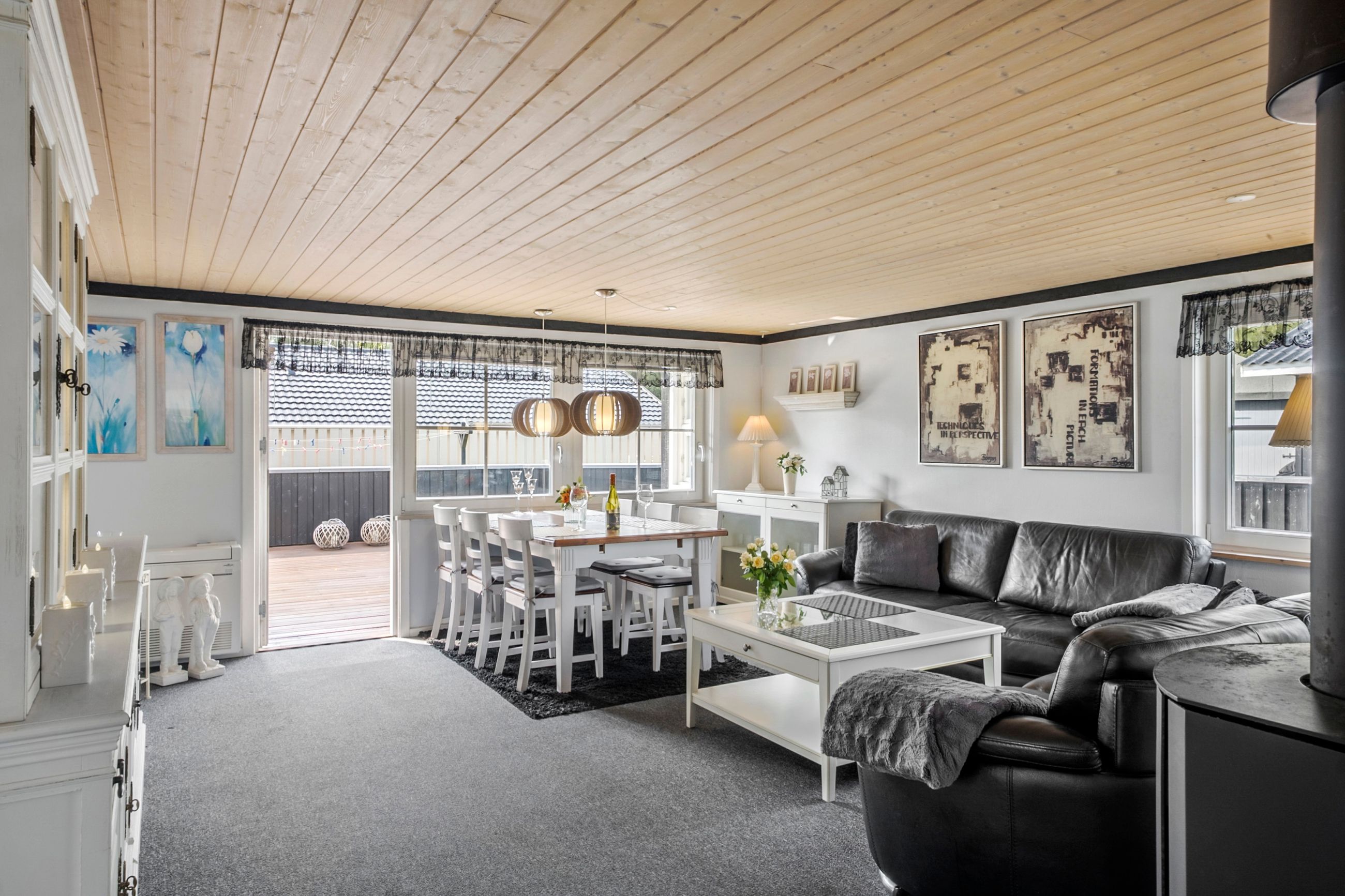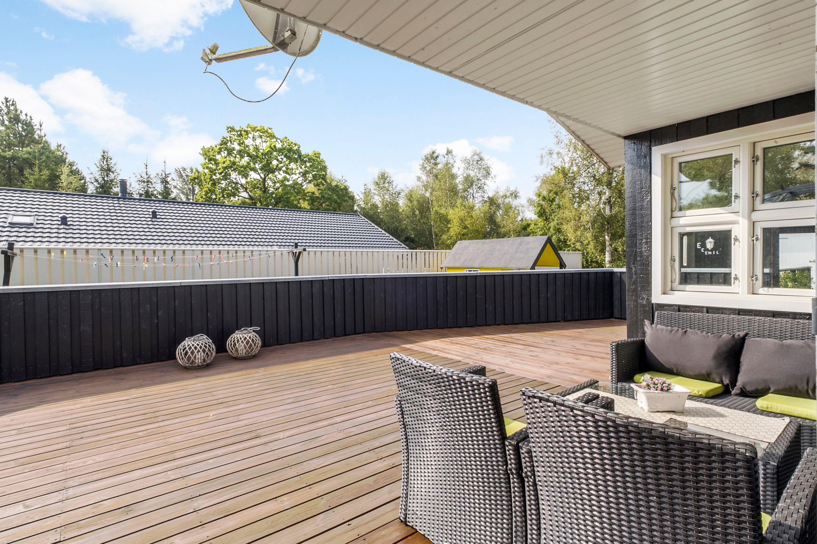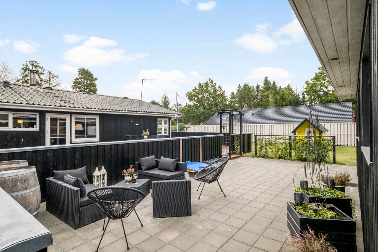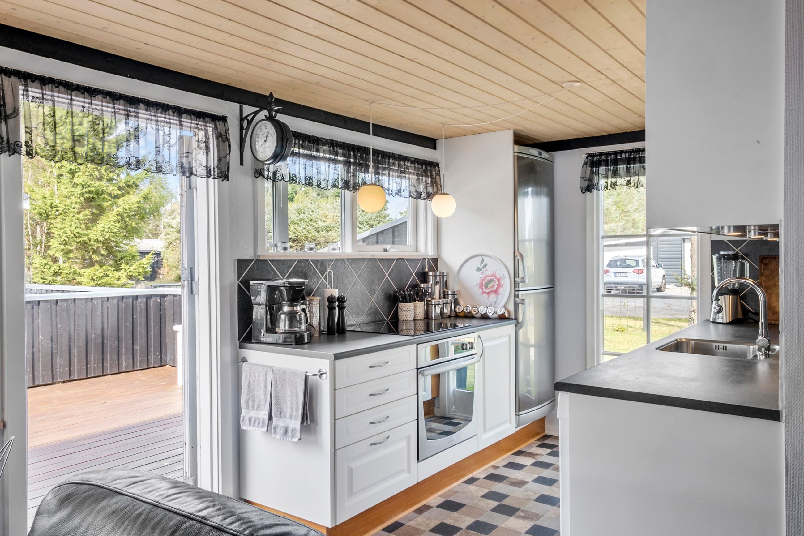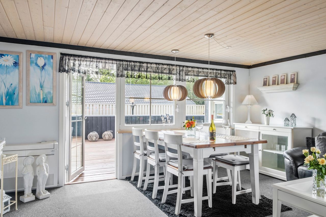 Køkkenet er flot og moderne, i åben forbindelse med den lyse spise- og opholdsstue, hvilket skaber en hyggelig og indbydende atmosfære. Herfra er der udgang til den store træterrasse, som inviterer til udendørs spisning, afslapning og sociale stunder i sommermånederne. Terrassen er ideel til solrige dage, og den omkringliggende have giver plads til leg og afslapning i fredelige omgivelser.