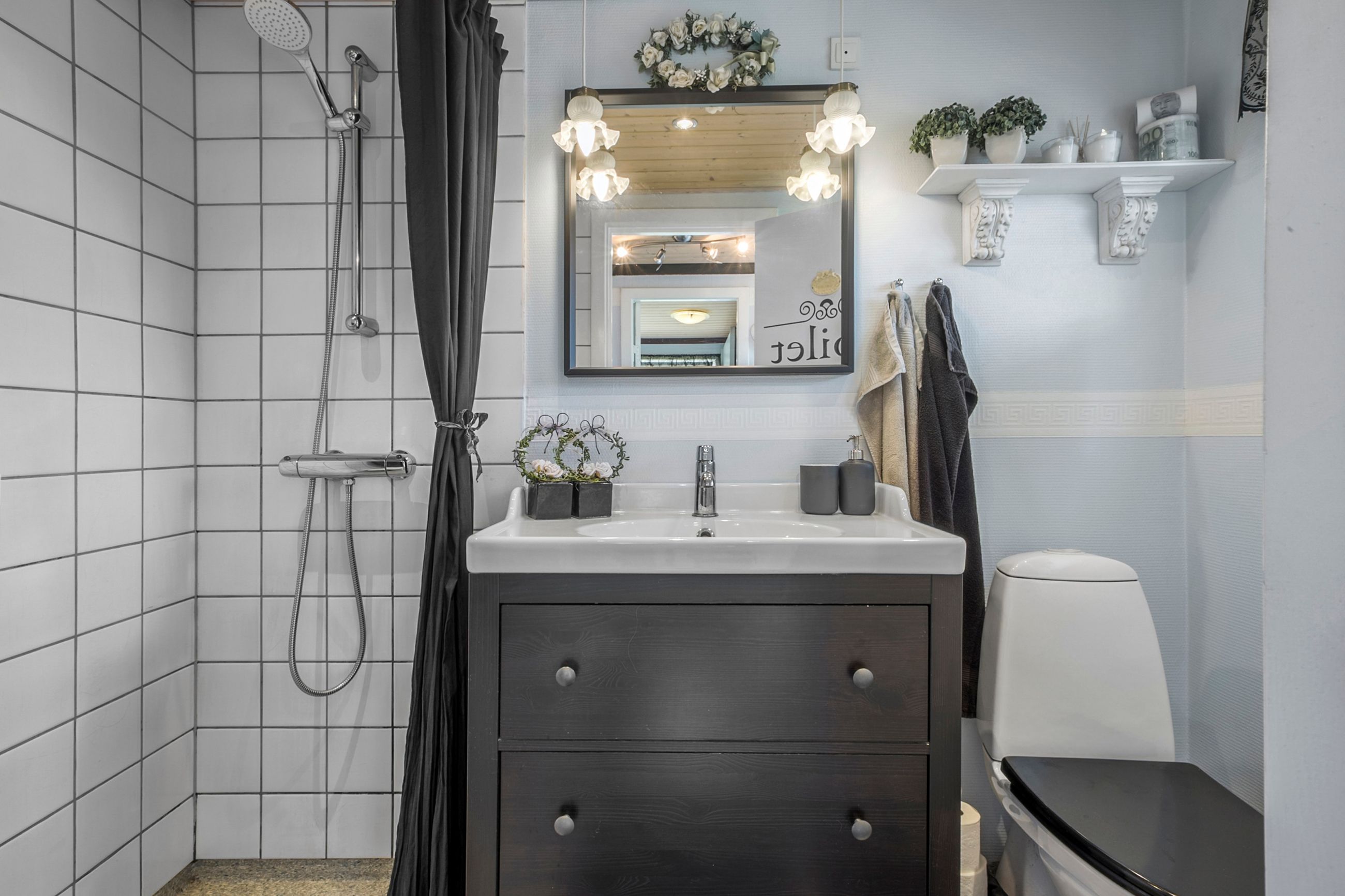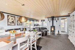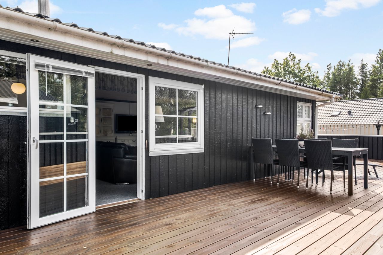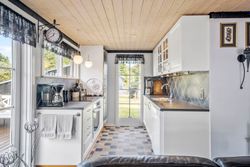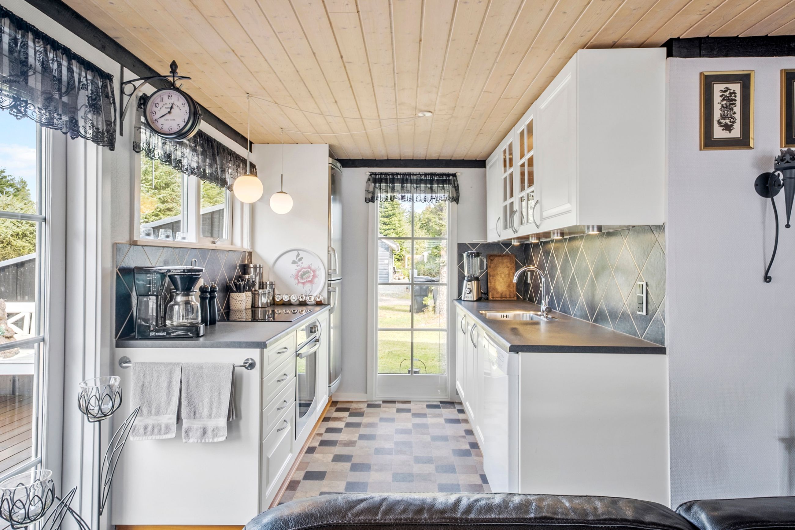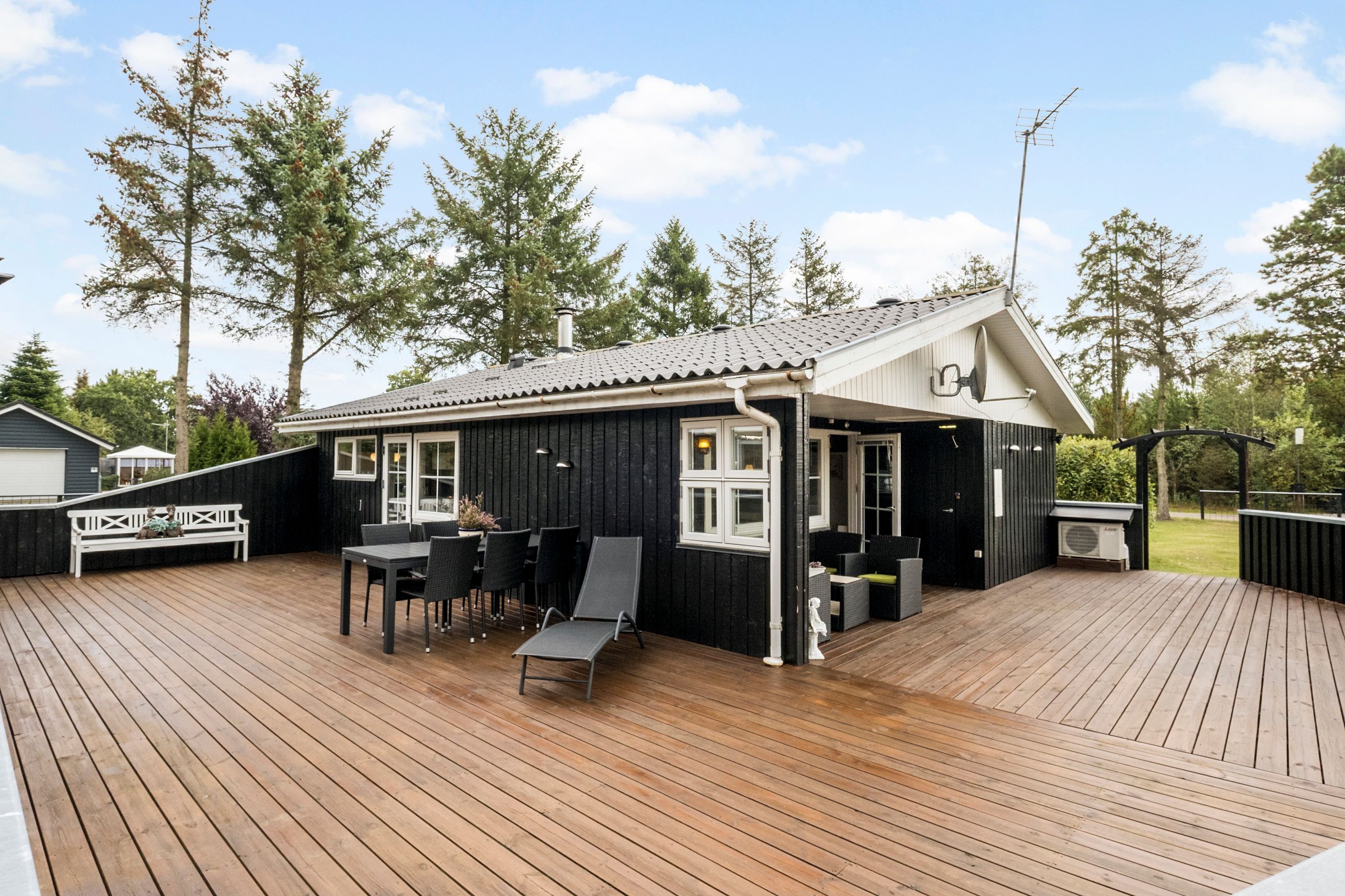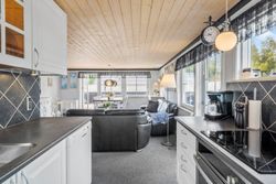 Køkkenet er flot og moderne, i åben forbindelse med den lyse spise- og opholdsstue, hvilket skaber en hyggelig og indbydende atmosfære. Herfra er der udgang til den store træterrasse, som inviterer til udendørs spisning, afslapning og sociale stunder i sommermånederne. Terrassen er ideel til solrige dage, og den omkringliggende have giver plads til leg og afslapning i fredelige omgivelser.