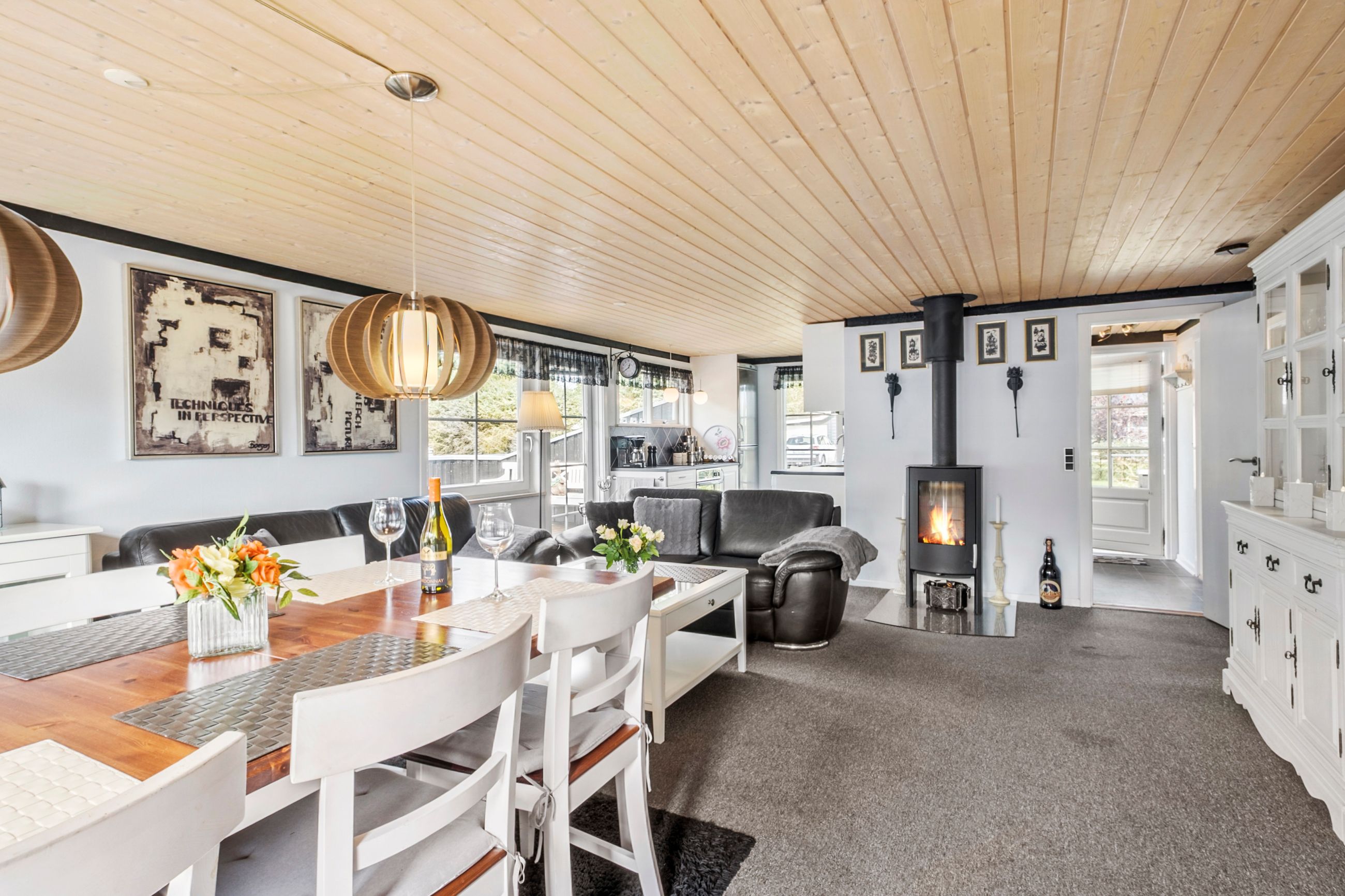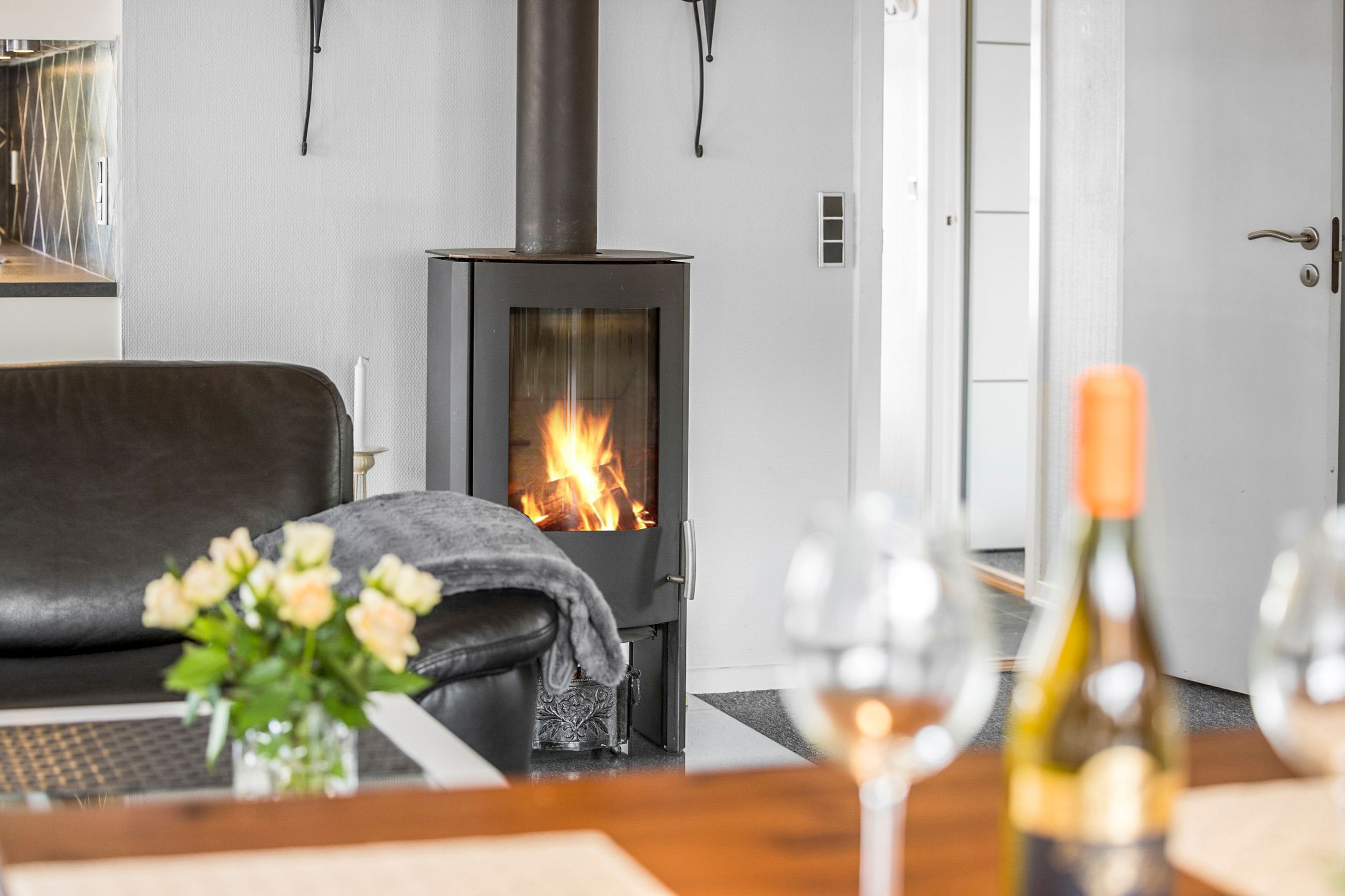 Huset er udstyret med både brændeovn og varmepumpe, hvilket sikrer behagelig temperatur året rundt, uanset vejret. Den varme luft eller pejsens hygge bidrager til en varm og hjemlig atmosfære, når vinterkulden sniger sig på.