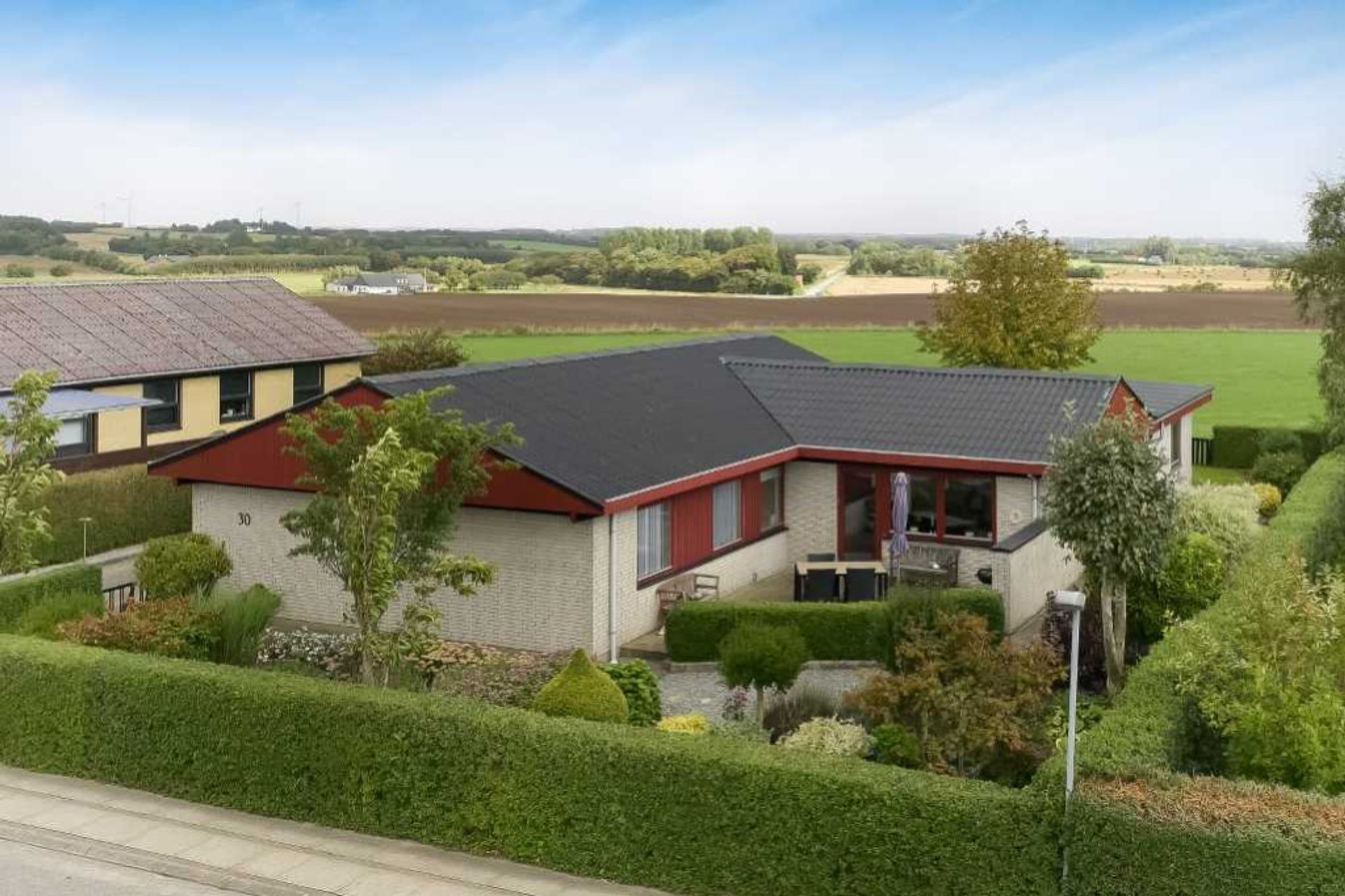 Dejlig rummelig 1 plans villa på 192 m2 opført 1972/1978 i hvide kalksandsten. Grunden på 815 m2 ligger fredeligt op mod marker med vidtstrakt udsigt over landskabet mod øst. Velanlagt have opdelt i prydhave og gårdhave med lækroge, terrasser og græsplæne.. Overvejende bølgeeternittag - stålplader på tilbygning. Bred flisebelagt indkørsel til carport og redskabsrum. Her bor du tæt ved dagligvarebutik (Aldi) og når bymidten indenfor kort tid.