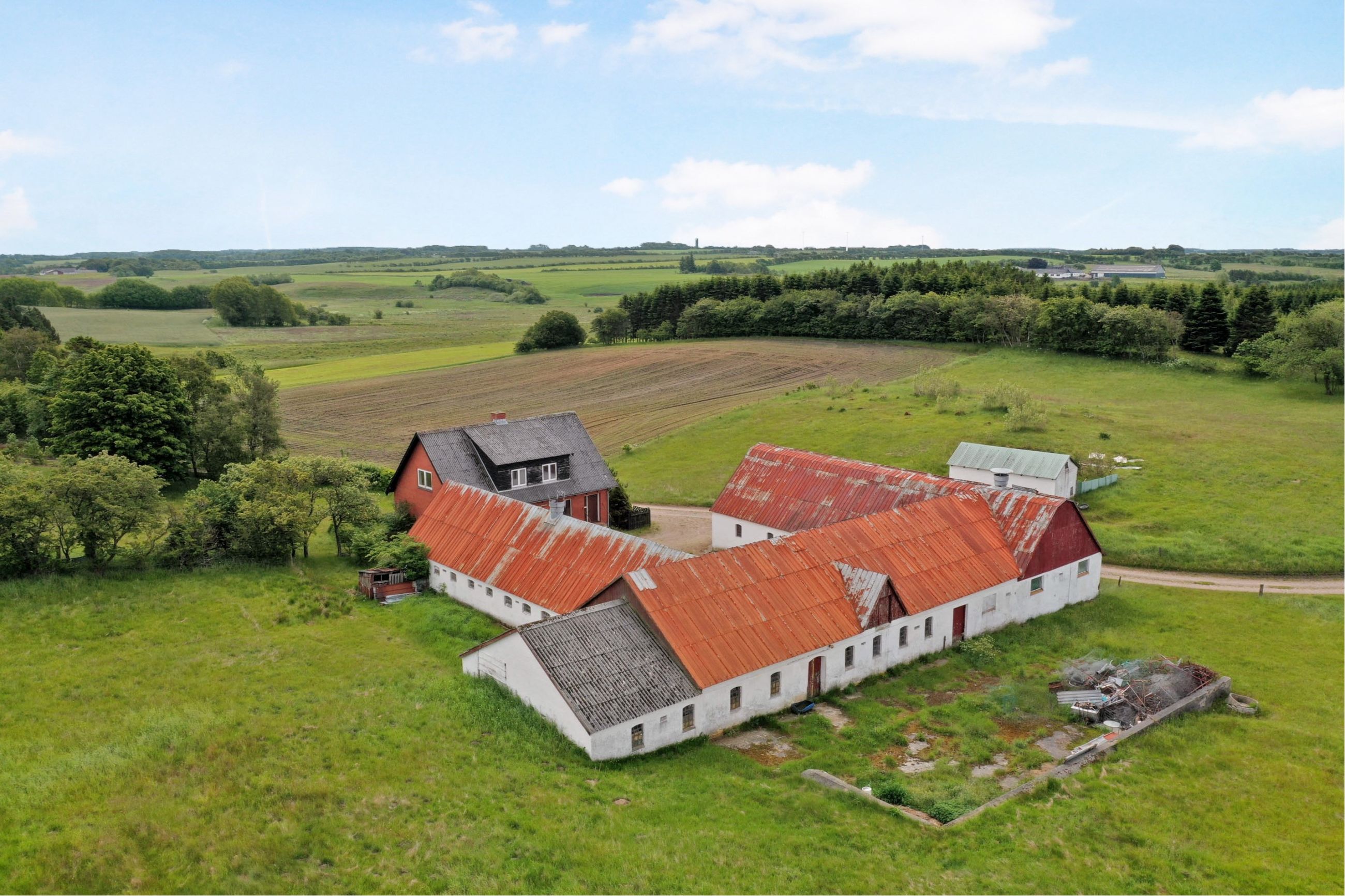 Stuehuset fremstår som en solid rødstensvilla fra 1959 med mange gode detaljer, termovinduer og ellers til dels i helt oprindelig stand og der må påregnes nogen modernisering. Huset er utrolig godt indrettet med forgang, 2 stuer en-suite - dagligstuen med smuk udsigt over markerne, landkøkken fra KVIK i en god størrelse fra ca. 2007, godt soveværelse med indbyggede skabe, oprindeligt badeværelse samt baggang med trappe til 1. sal og kælder. 1. salen har gamle plankegulve og er indrettet med stor møblerbar repos samt 3 gode værelser - de to med kviste, der giver god ekstra plads. Kælderen virker høj og tør og er indrettet med gang med udgang, viktualierum, bryggers med vaskemaskine og stort hobbyrum/fyrrum. Ifølge BBR er huset boligareal 138 kvm plus 44 kvm. kælder. Gode udbygninger med masser af muligheder - særligt den store maskinhal har mange muligheder. Rundt om gårdspladsen finder man 3 længet udbygning som har fungeret som stald, lade mm. Desuden er der garage og hønsehus.