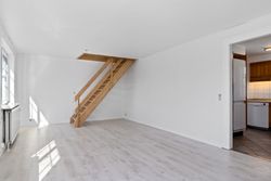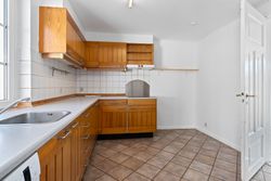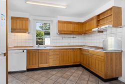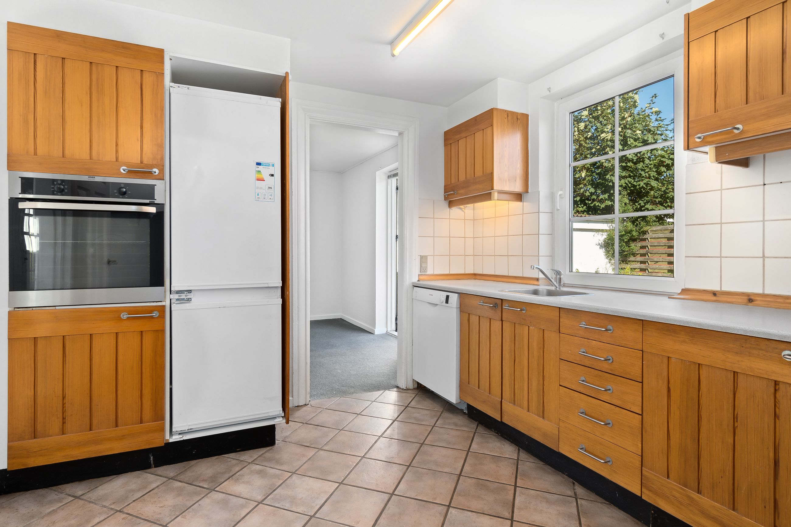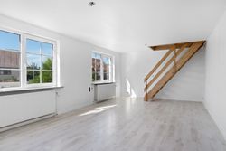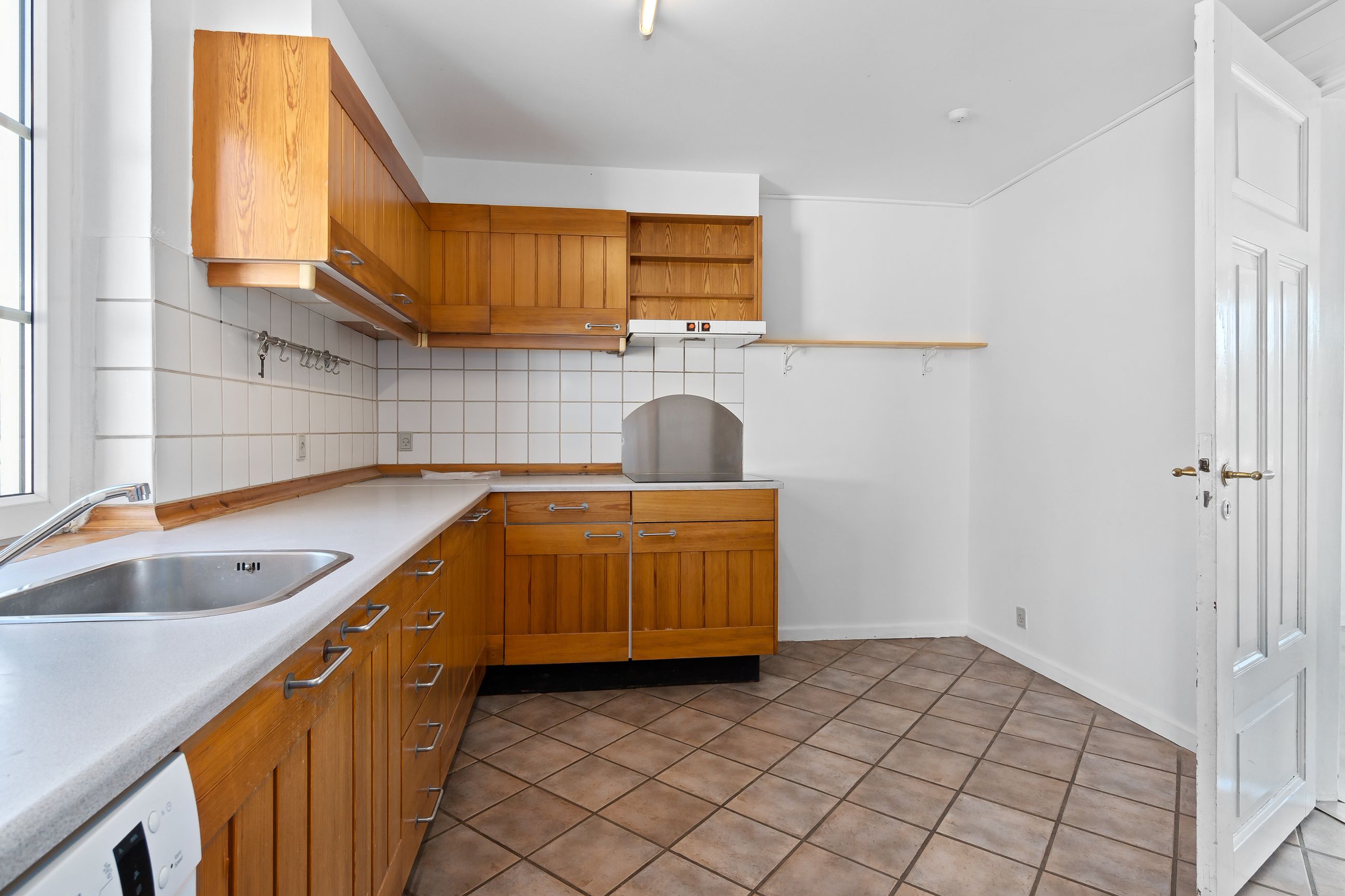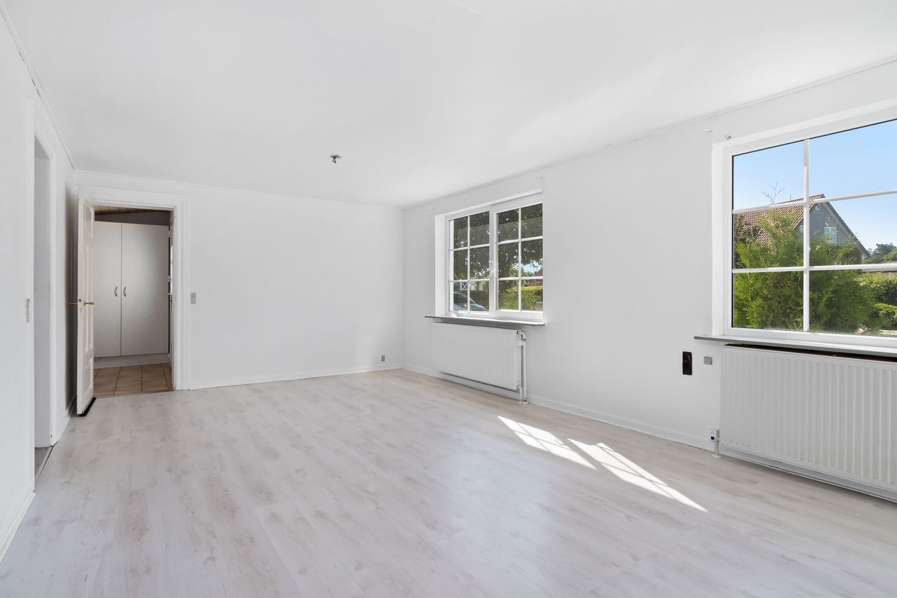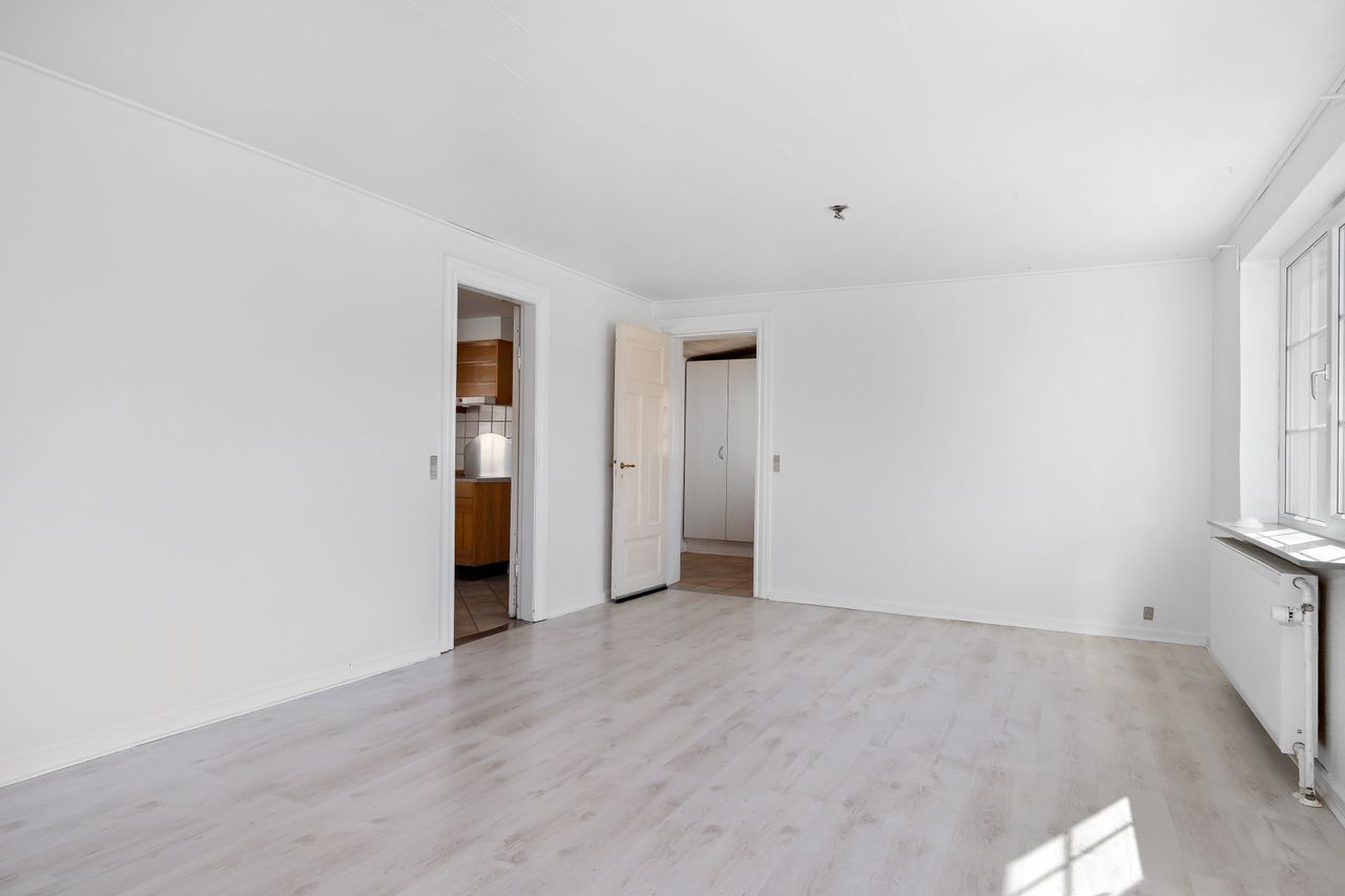 Rummelig og præsentabel stue med laminatgulve. Derfra adgang til godt køkkenafsnit med plads til
