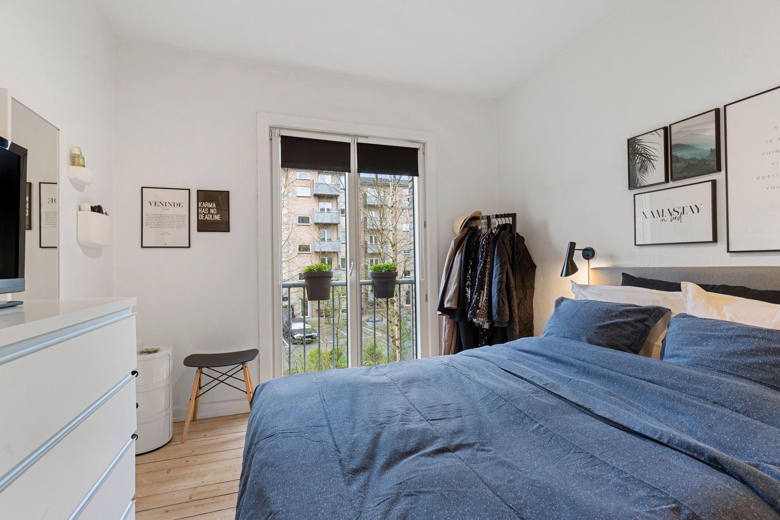Soveværelset ligger ved siden af og har en rigtig god størrelse. Her er plads til både seng og et lille skrivebord, hvis du ønsker at indrette en hjemmearbejdsplads – og stadig holde stuen fri til ren afslapning og samvær.