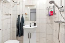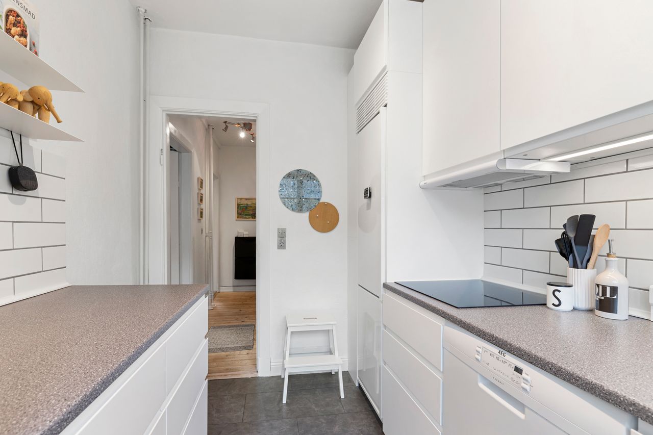Køkkenet er enkelt og praktisk indrettet med alt det nødvendige til hverdagen, og et fint kig ud mod gården. Her er både god bordplads og mulighed for opbevaring. Badeværelset er lyst og funktionelt, og har det hele samlet på få, men veludnyttede kvadratmeter.