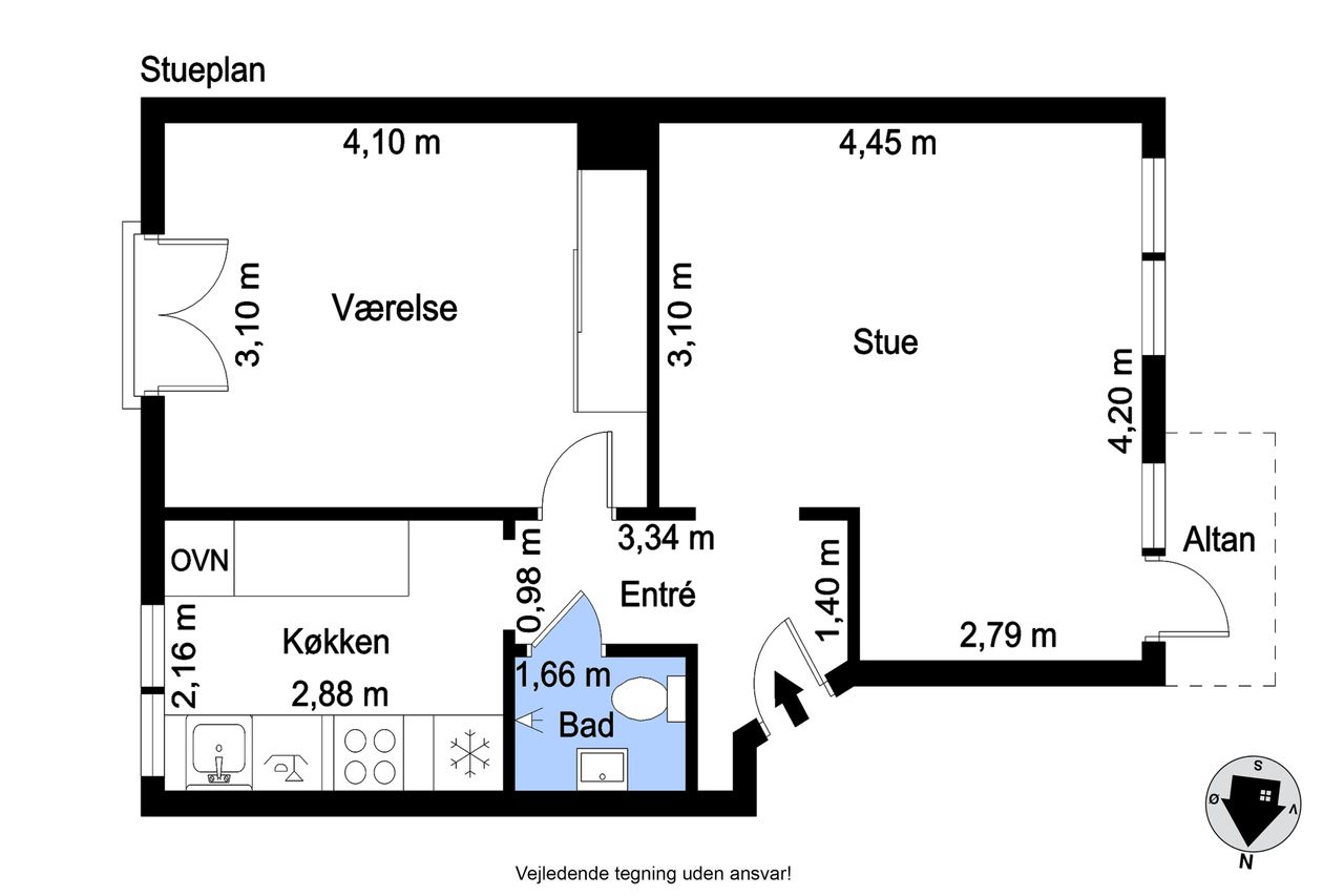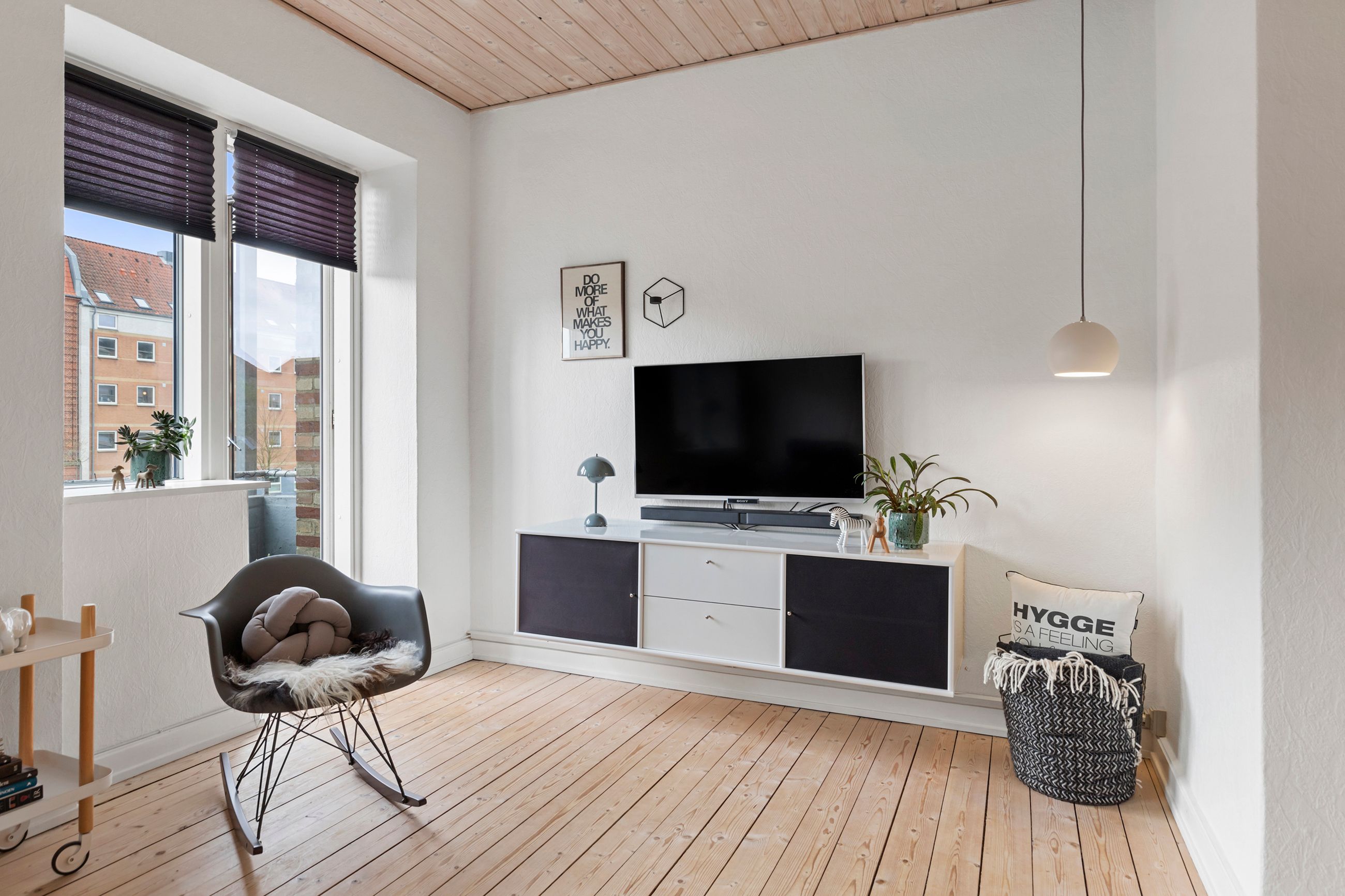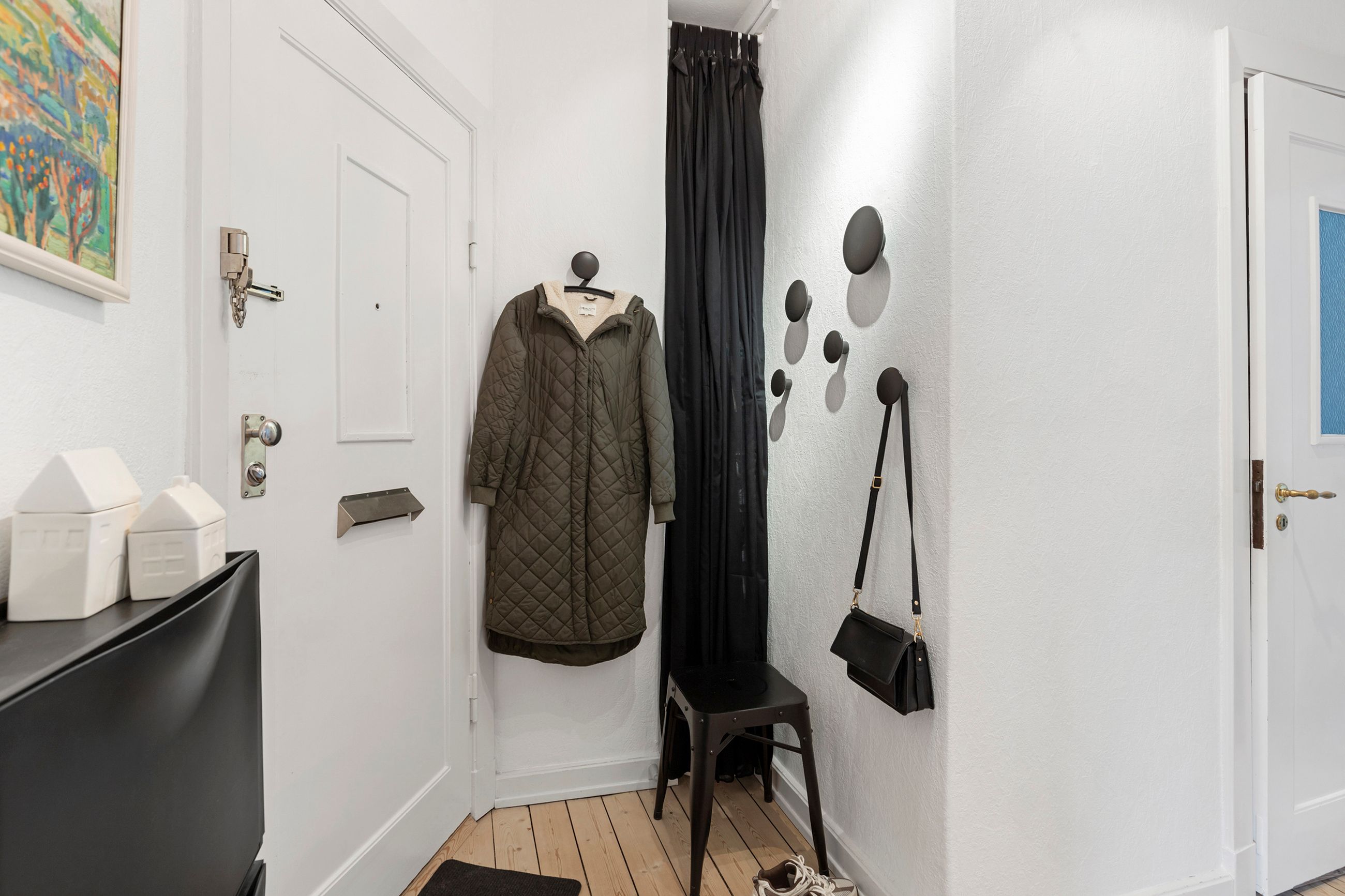 Lejligheden byder velkommen i en fin og funktionel entré, hvorfra der er adgang til alle boligens rum. Til højre træder du ind i den lyse stue, hvor vestvendte vinduer inviterer eftermiddagssolen ind og skaber en varm og afslappet stemning – perfekt efter en lang dag på studiet eller arbejdet. Herfra er der direkte udgang til en skøn vestvendt altan, hvor du kan nyde solen og et roligt øjeblik med kaffe eller kolde drikke.