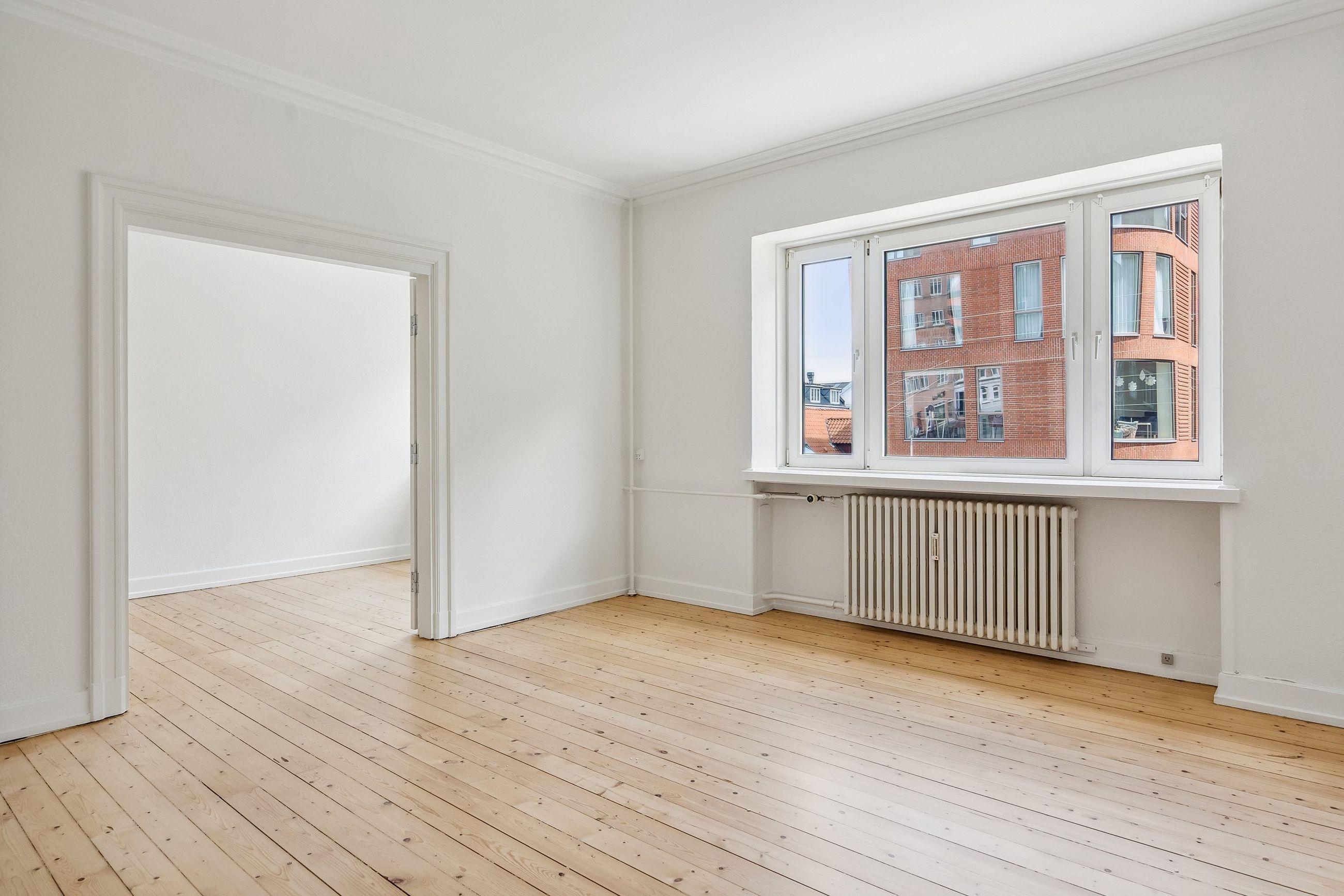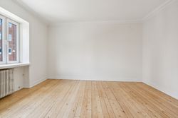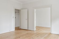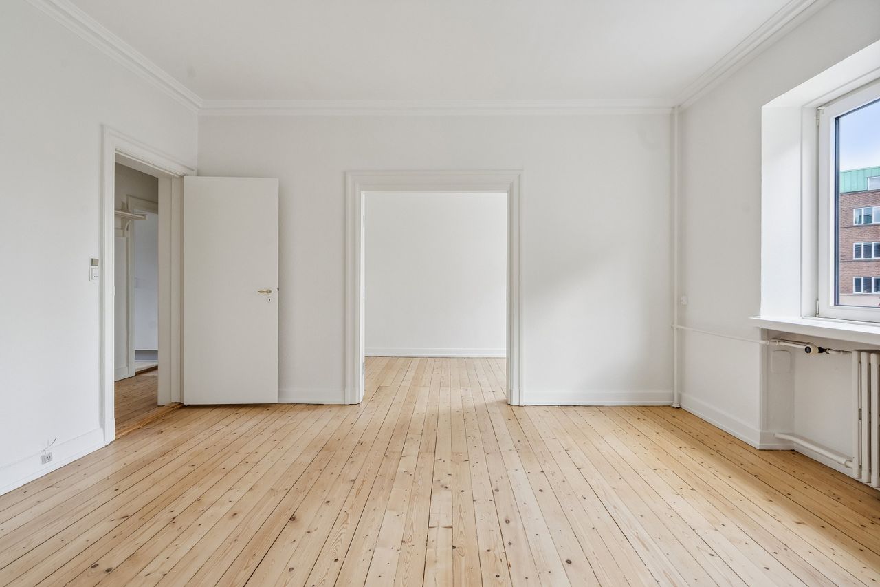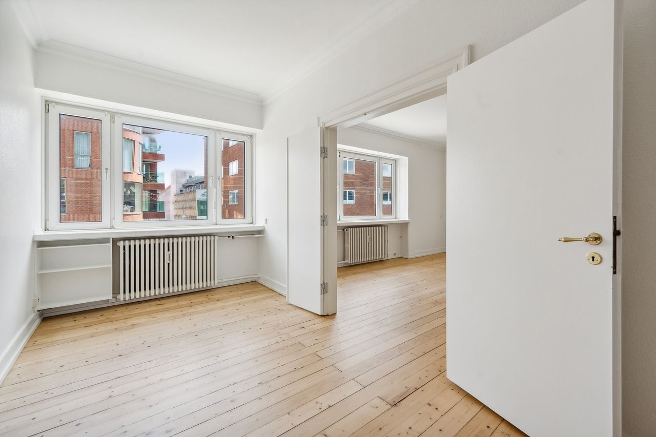 De to rummelige stuer en suite ligger i den modsatte side af lejligheden, og her er rigelig plads til både spisebord og sofagruppe. Rummene prydes af det flotte klassiske plankegulv, som står flot til det velholdte stukloft.