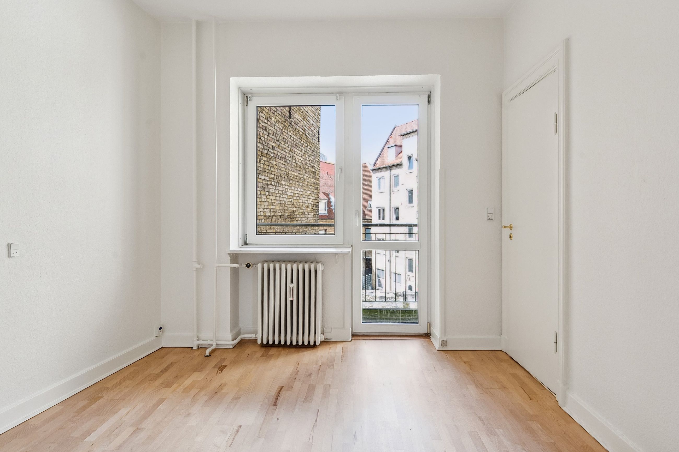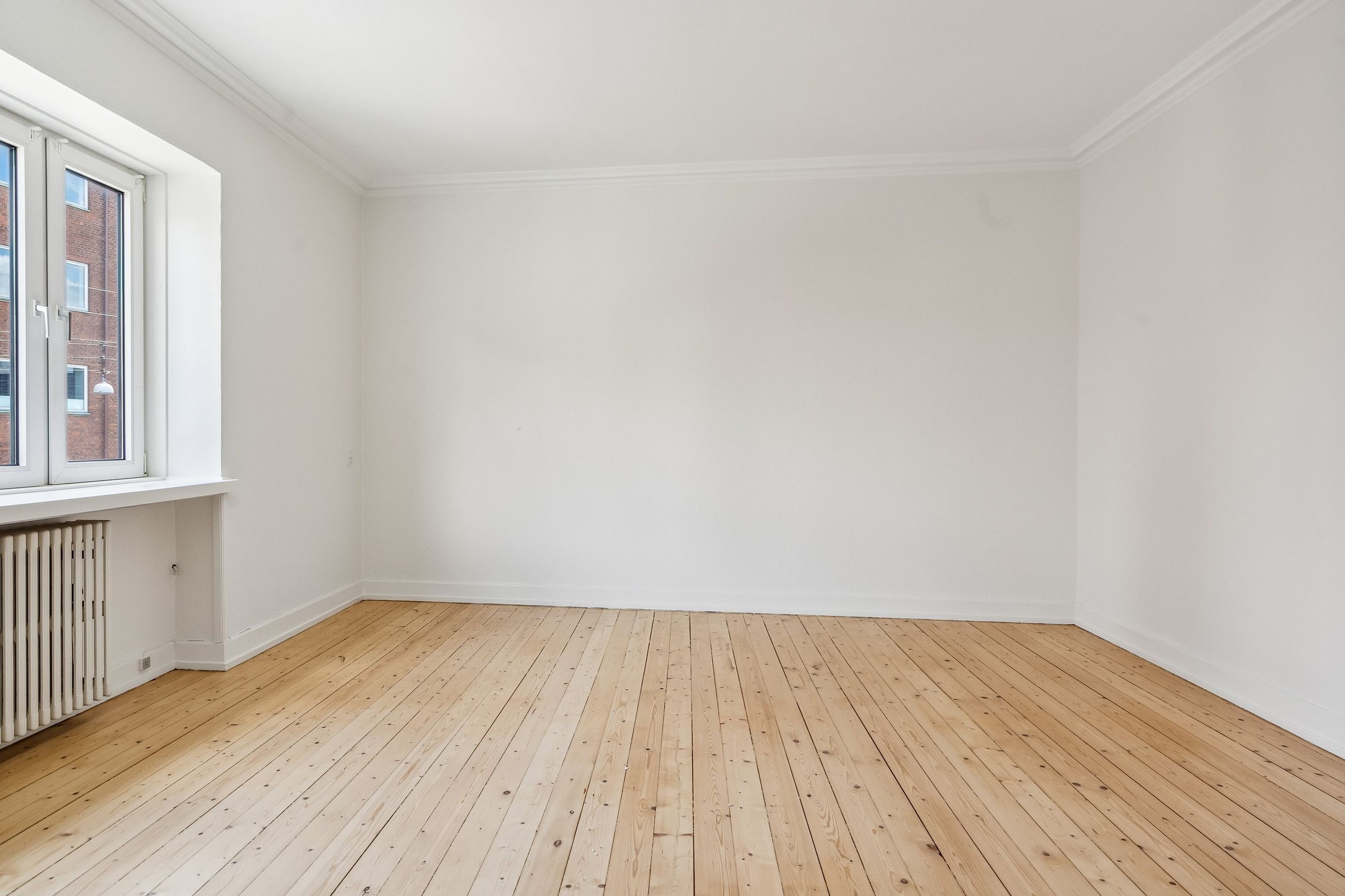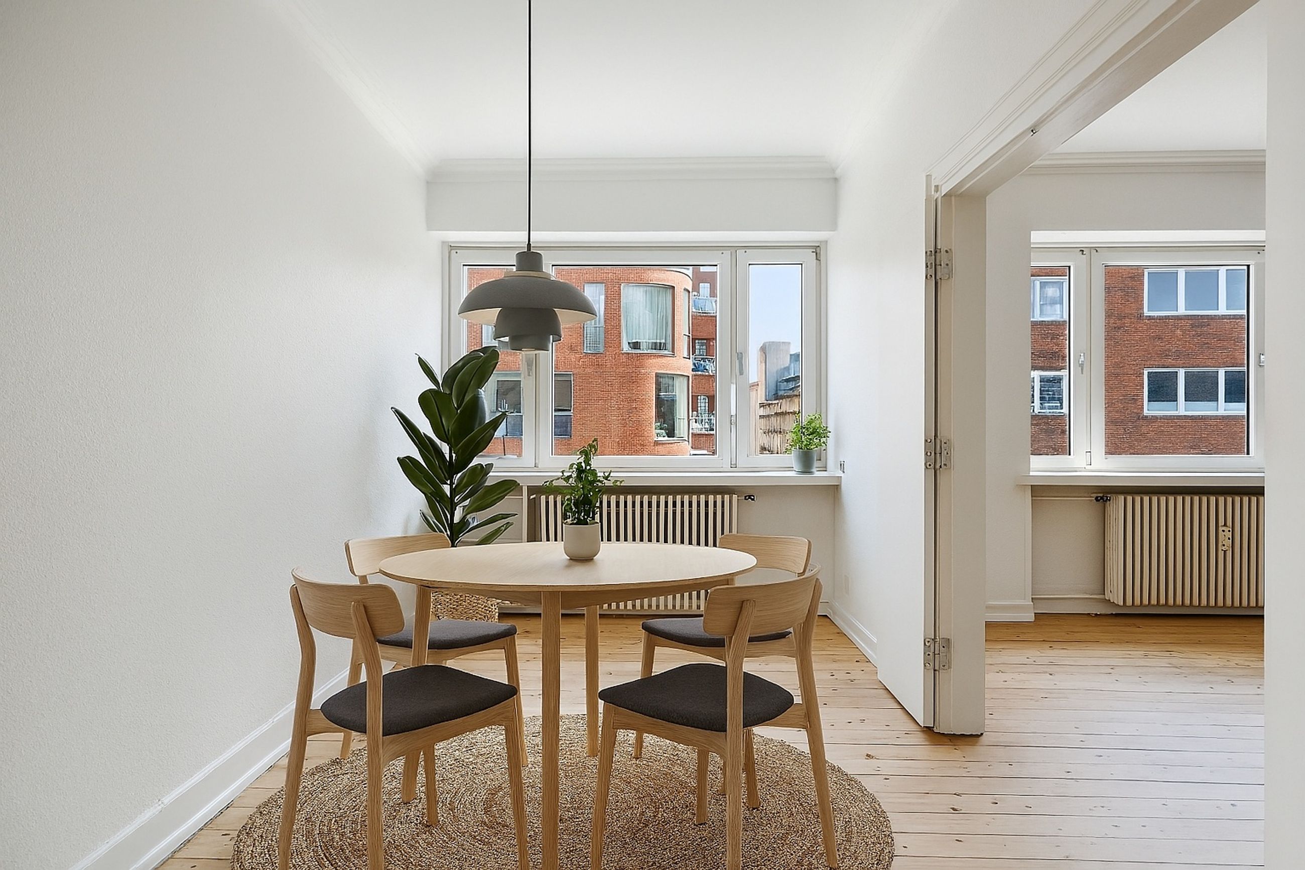 De to rummelige stuer en suite ligger i den modsatte side af lejligheden, og her er rigelig plads til både spisebord og sofagruppe. Rummene prydes af det flotte klassiske plankegulv, som står flot til det velholdte stukloft.