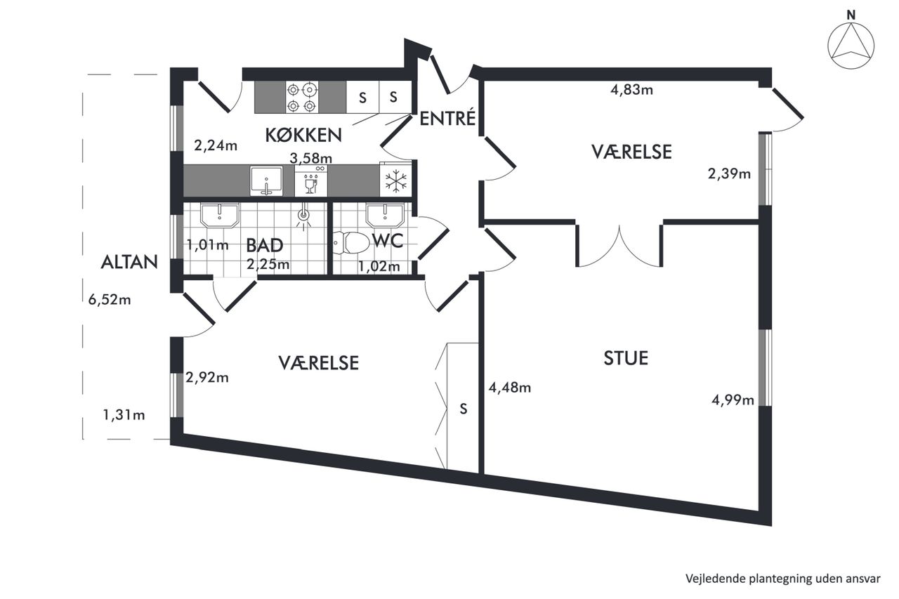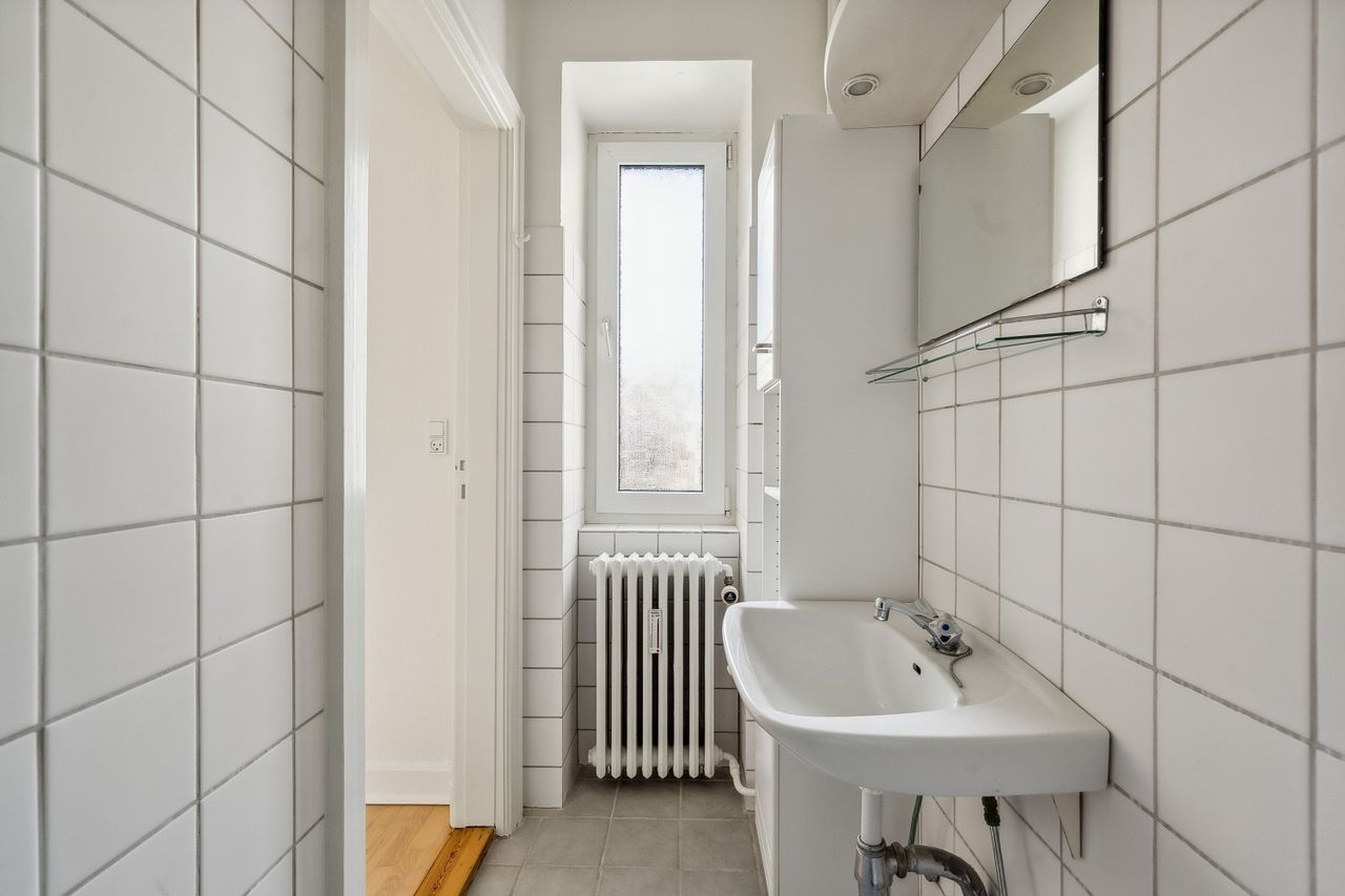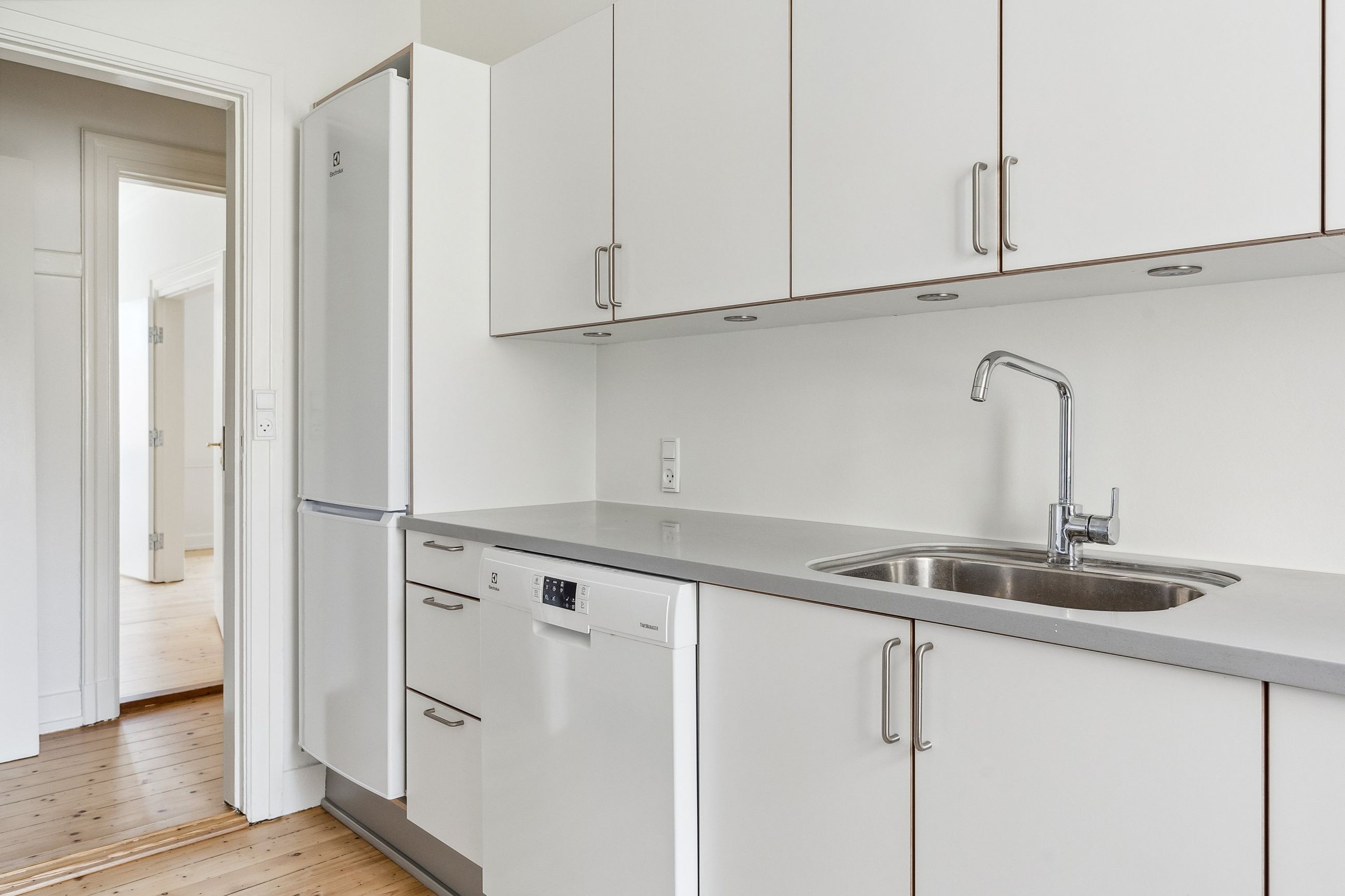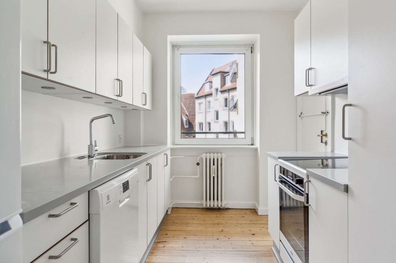 Selve lejligheden er indbydende og indflytningsklar med et gennemgående tema i klassisk herskabelig stil og en god loftshøjde, som understreger den luftige atmosfære. Du træder først over dørtrinnet til entréen, der fungerer som fordelingsgang. På venstre hånd finder man først lejlighedens nyere køkken fra 2020, som byder på masser af bordplads og alt i hårde hvidevarer.
