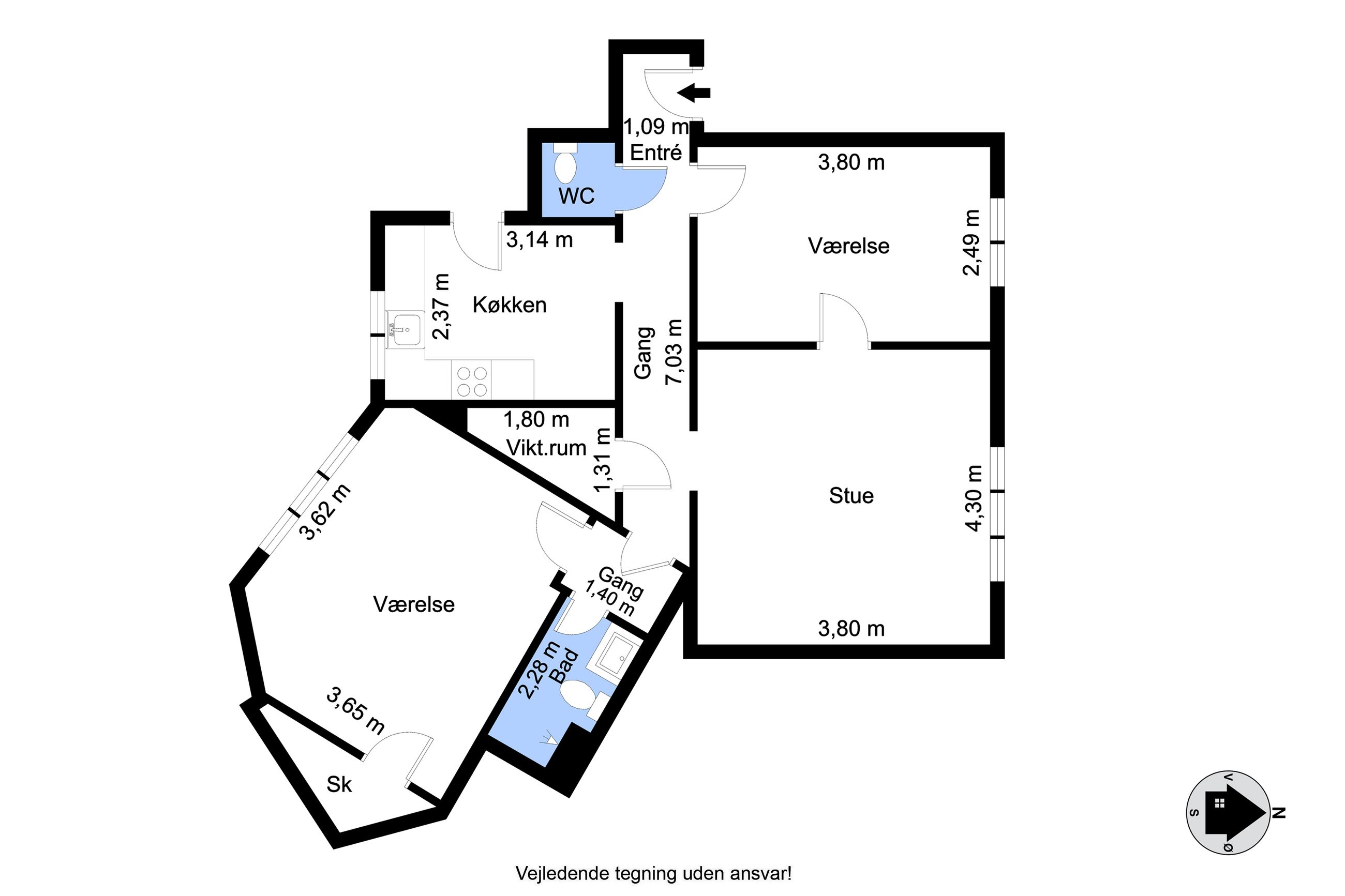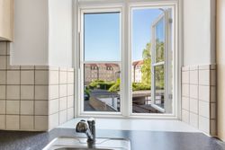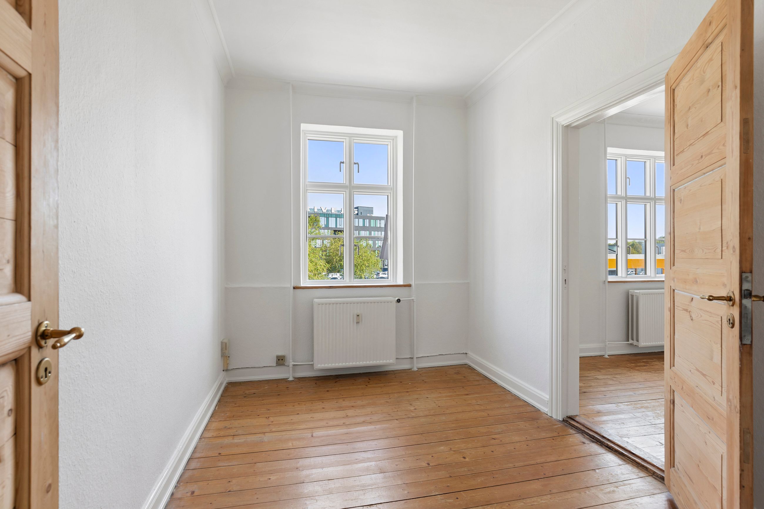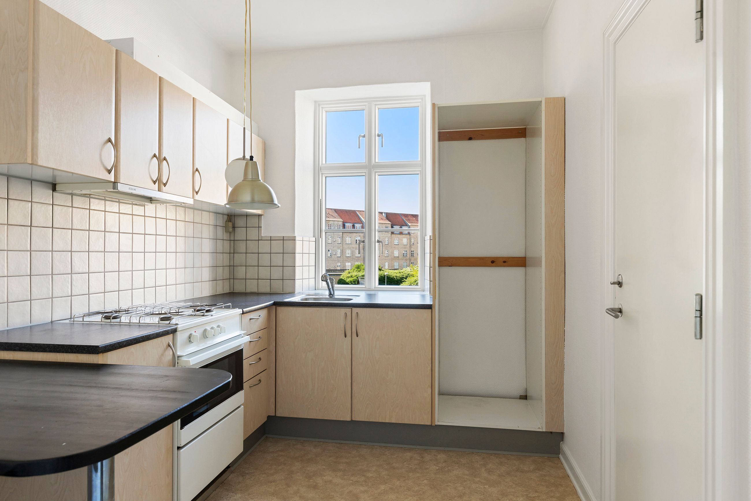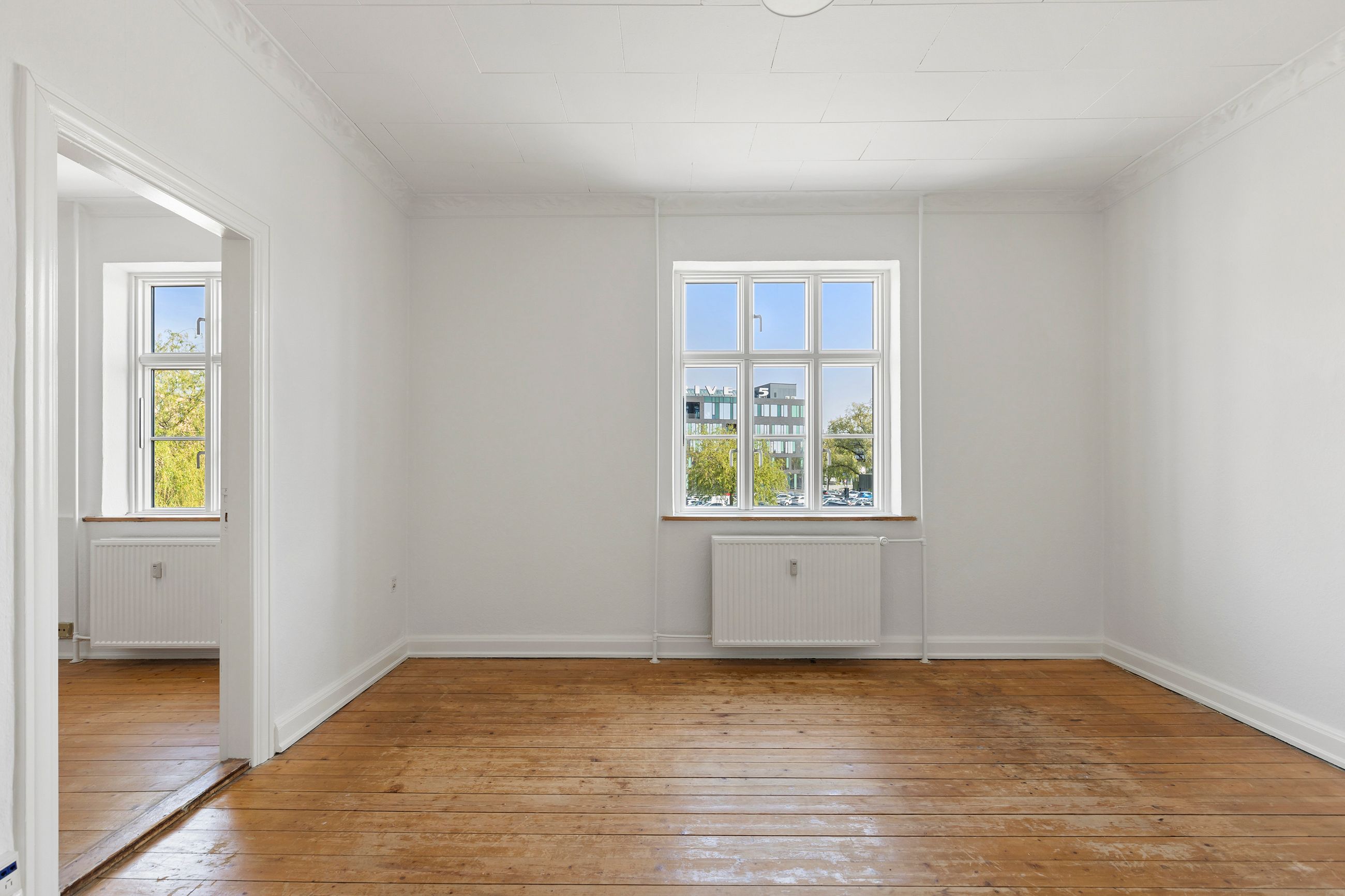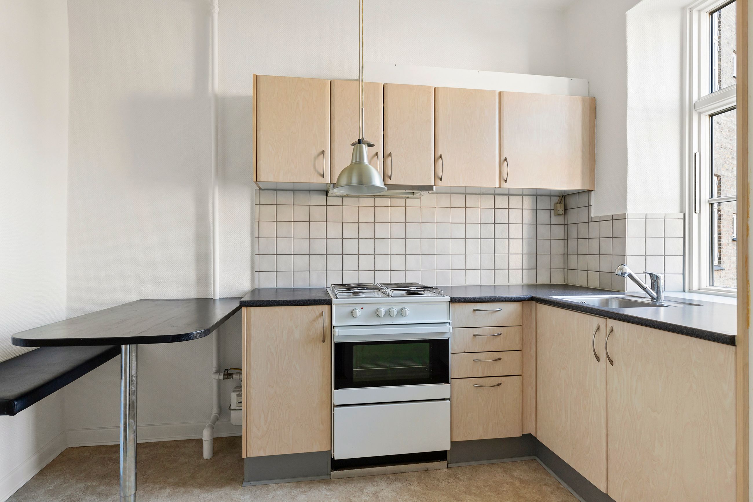 Lejligheden byder på en god planløsning med en rummelig og charmerende stue, hvor der er plads til både sofaområde og spiseplads. Her får du masser af naturligt lys og en behagelig atmosfære, der indbyder til afslapning og samvær. Køkkenet er funktionelt indrettet med god skabsplads og mulighed for spisekrog.