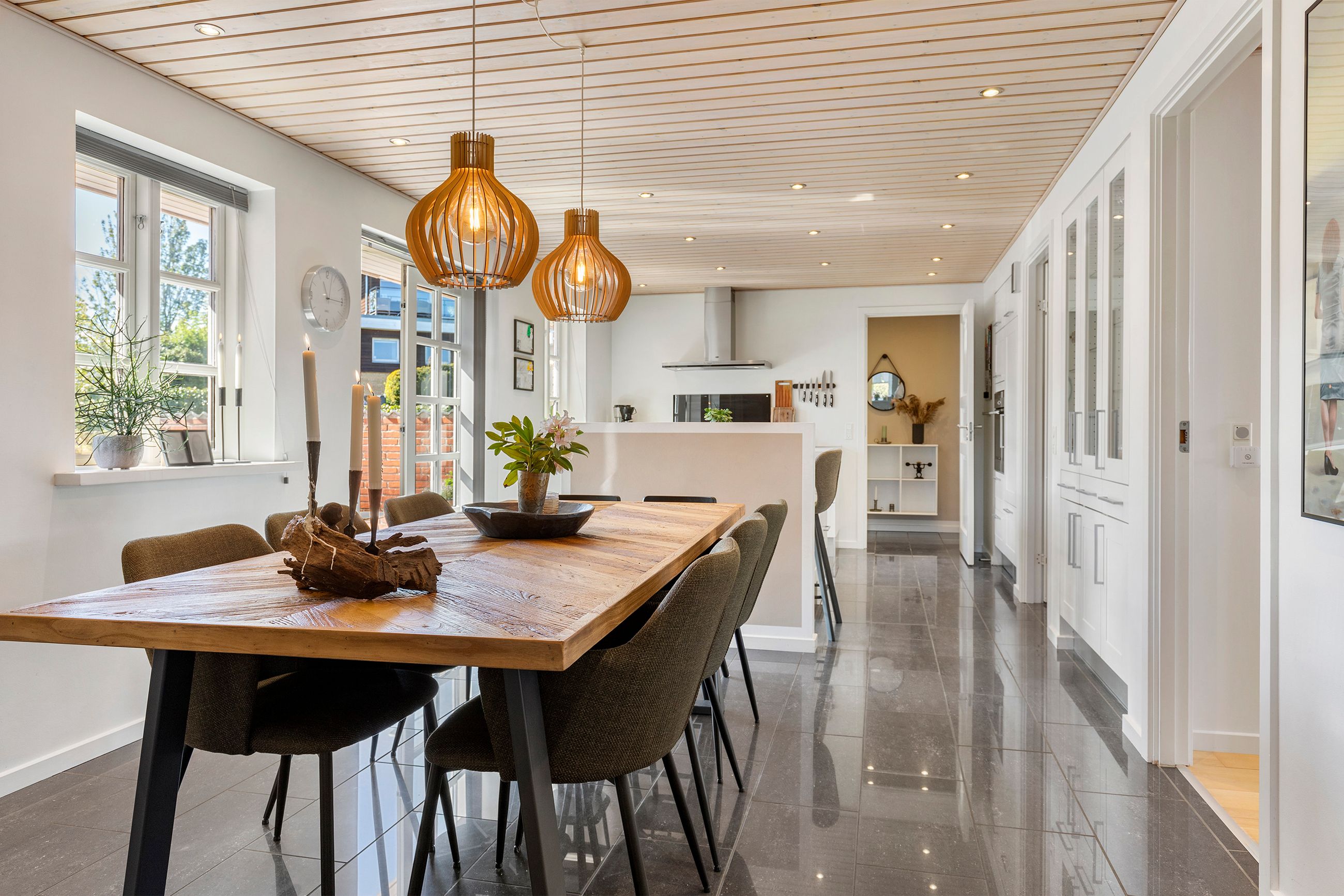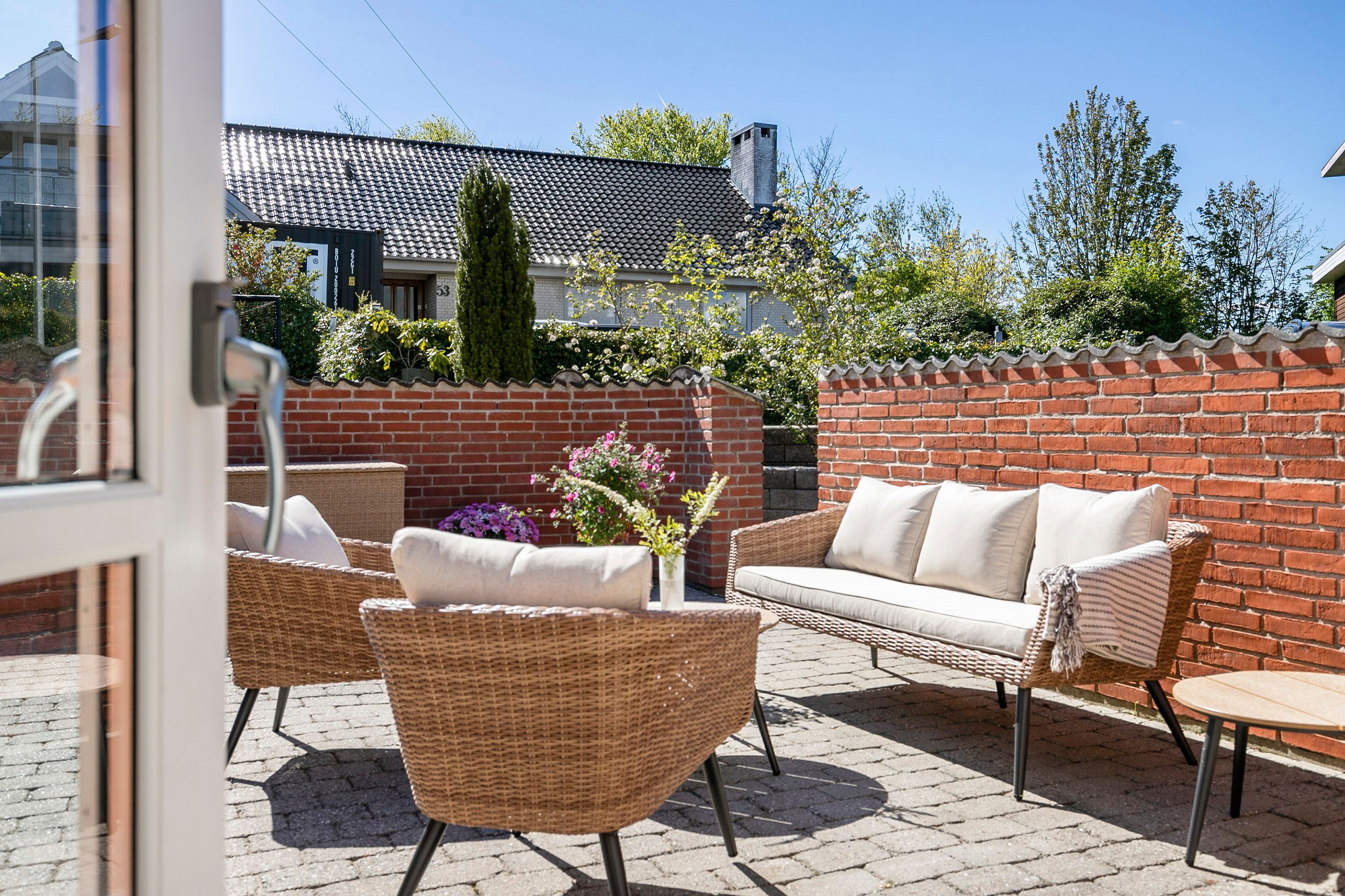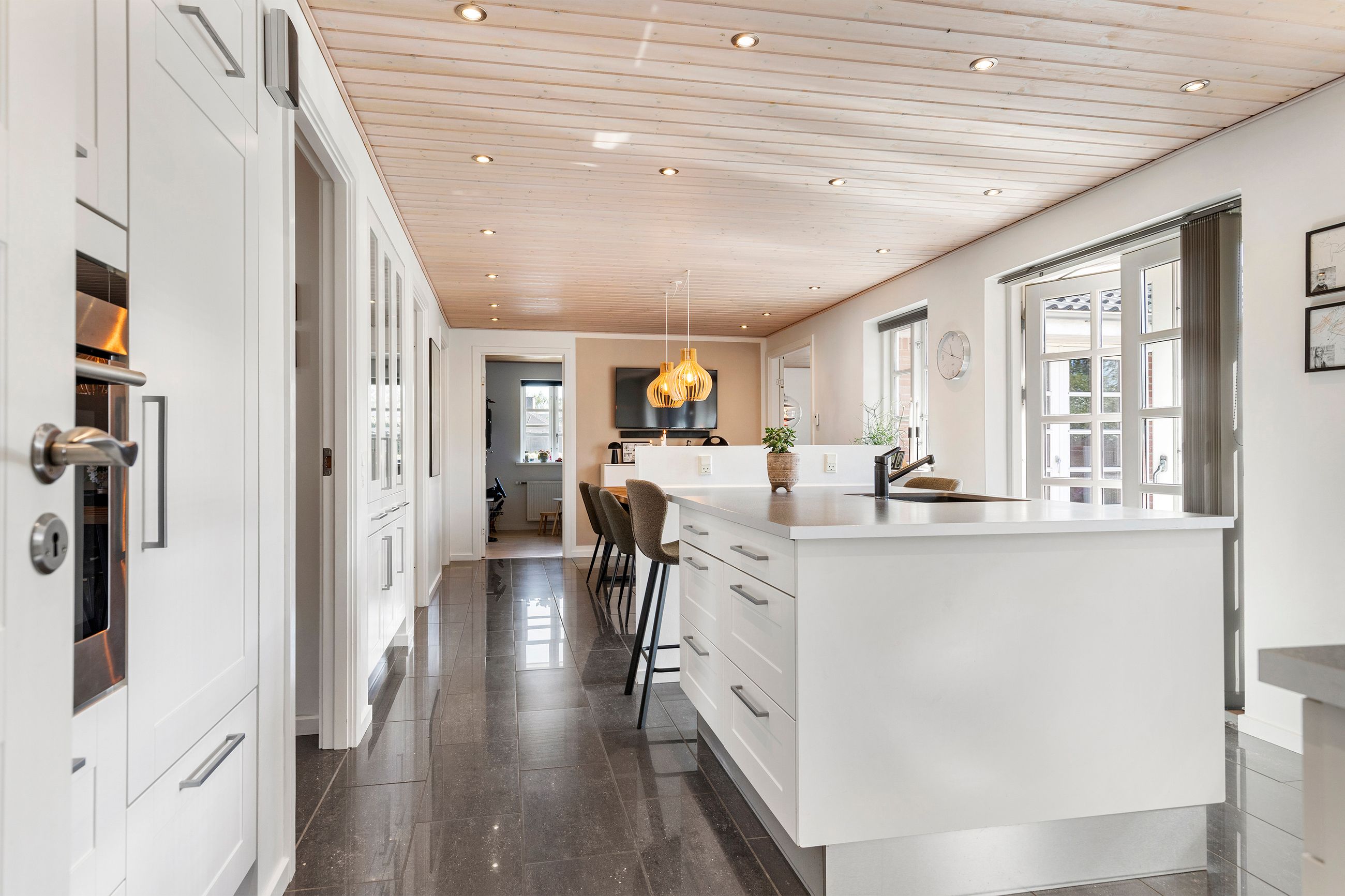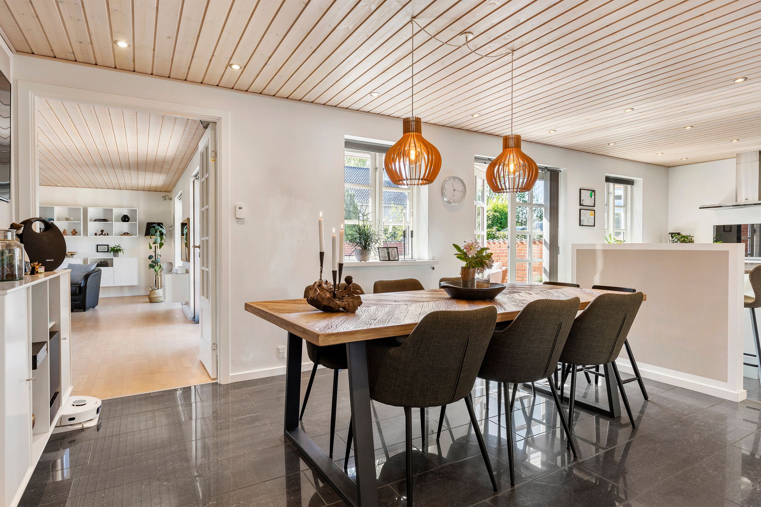 Boligen byder på fire gode værelser, som giver rigeligt med plads til både børn, kontor og gæster. Det store og åbne køkken-alrum er hjemmets hjerte, hvor det stilrene JKE-køkken kombineres med masser af lys og plads til fællesskab. Herfra er der åben forbindelse til en rummelig og lys stue, som har direkte udgang til den solrige terrasse og have.