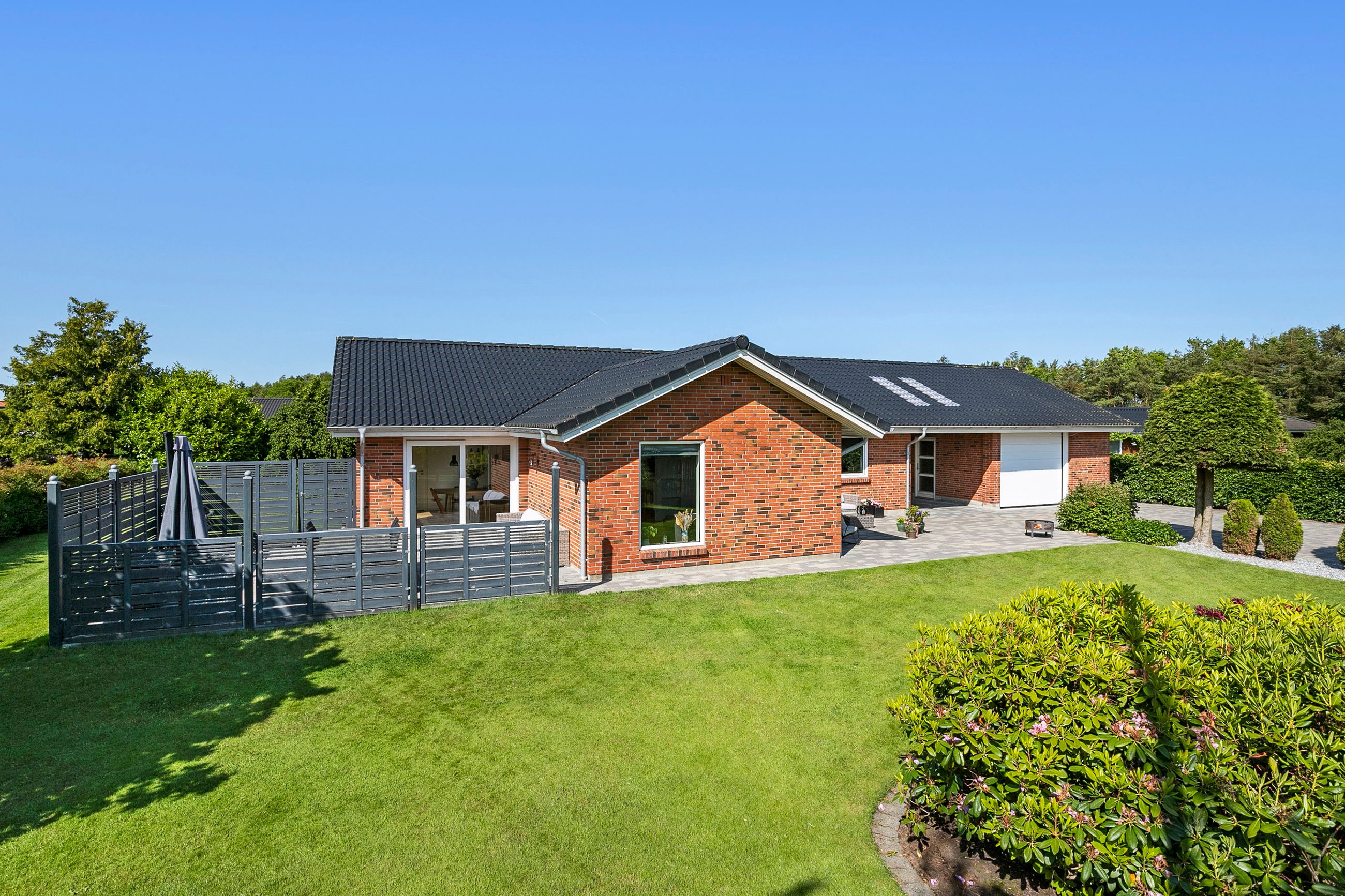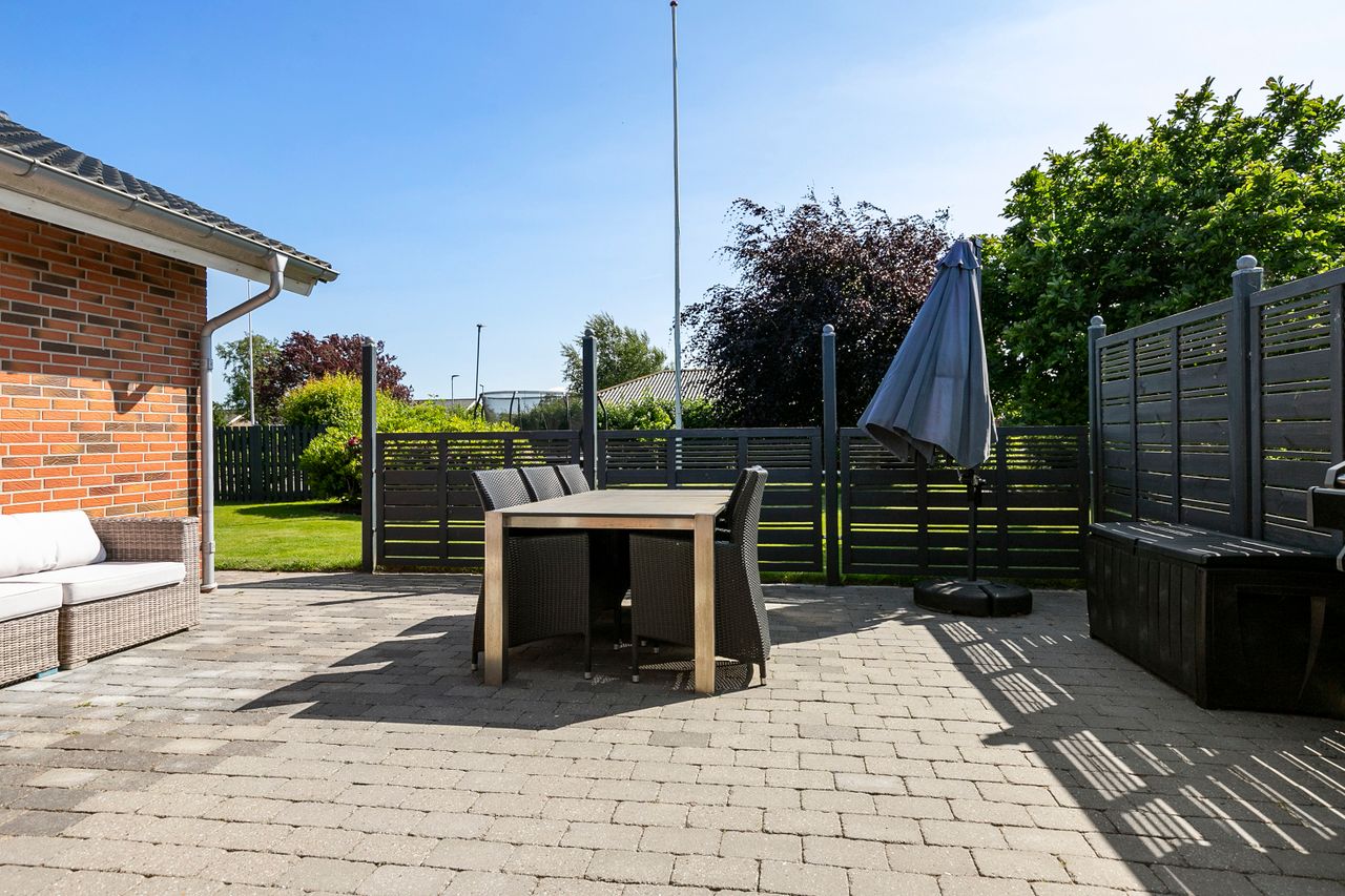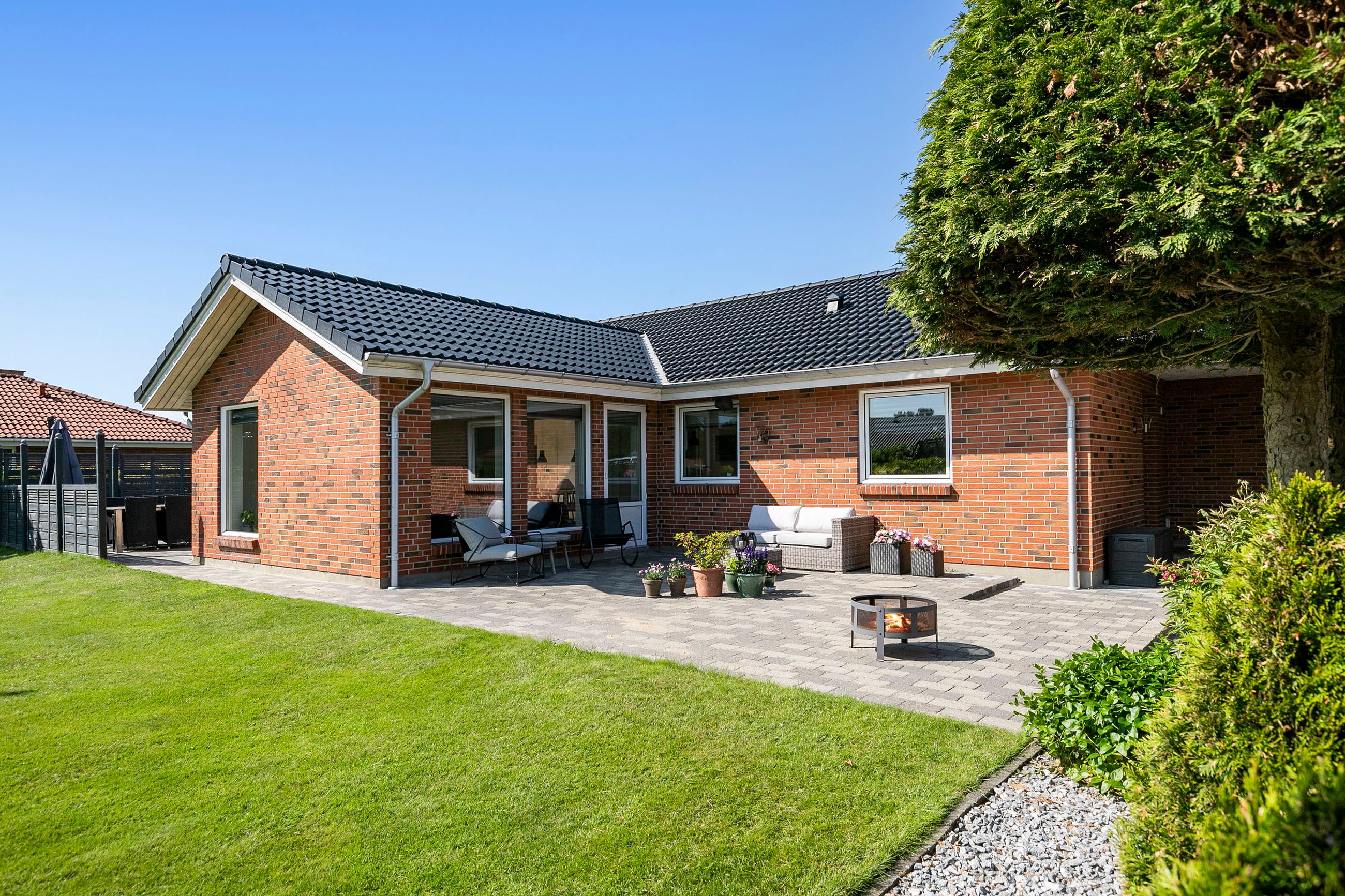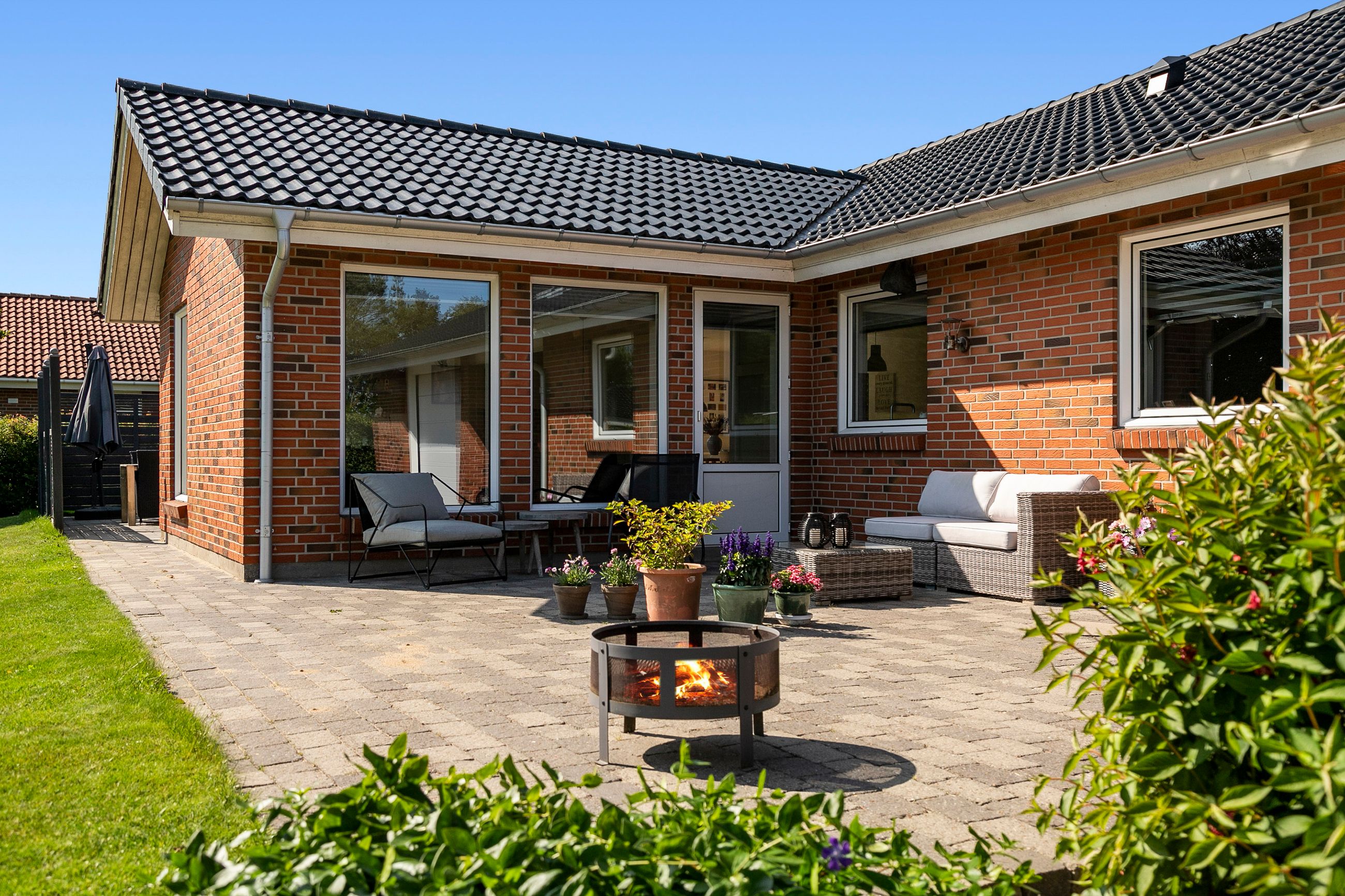 Udenfor breder den store have sig ud – grøn, indbydende og nem at holde. Her er plads til både trampolin, fodboldmål og blomsterbede, og på terrassen kan I følge årstidernes skiften med solen i ansigtet og fuglesang i baggrunden.