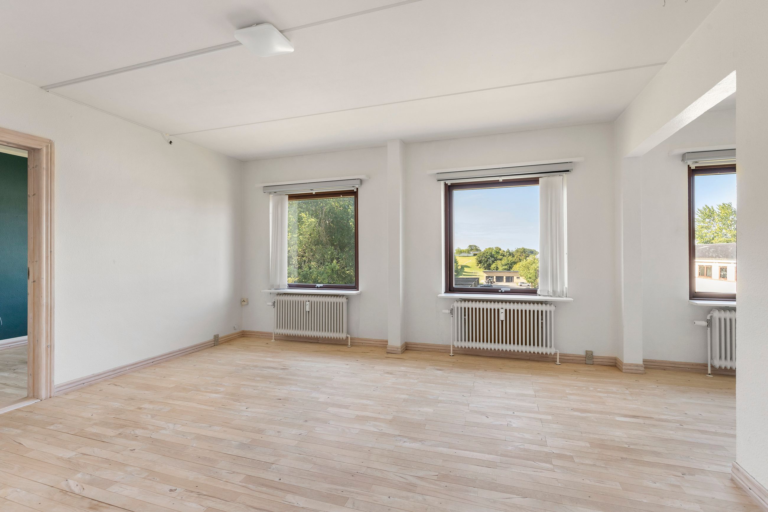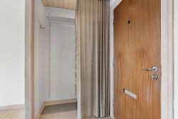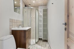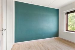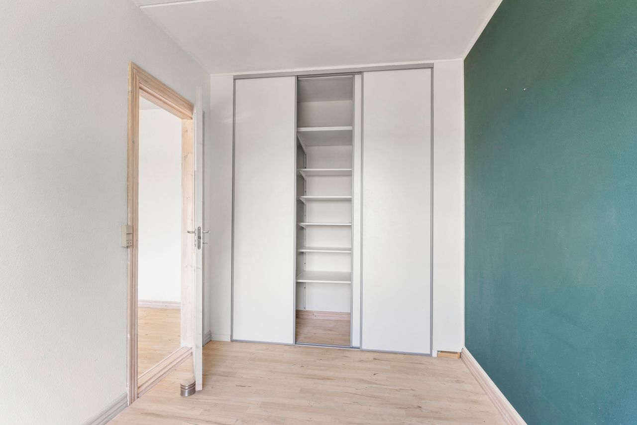 Soveværelset er også lyst med et stort indbygget skab med masser af plads til opbevaring. Badeværelset er moderniseret og praktisk indrettet med komfortabel gulvvarme.