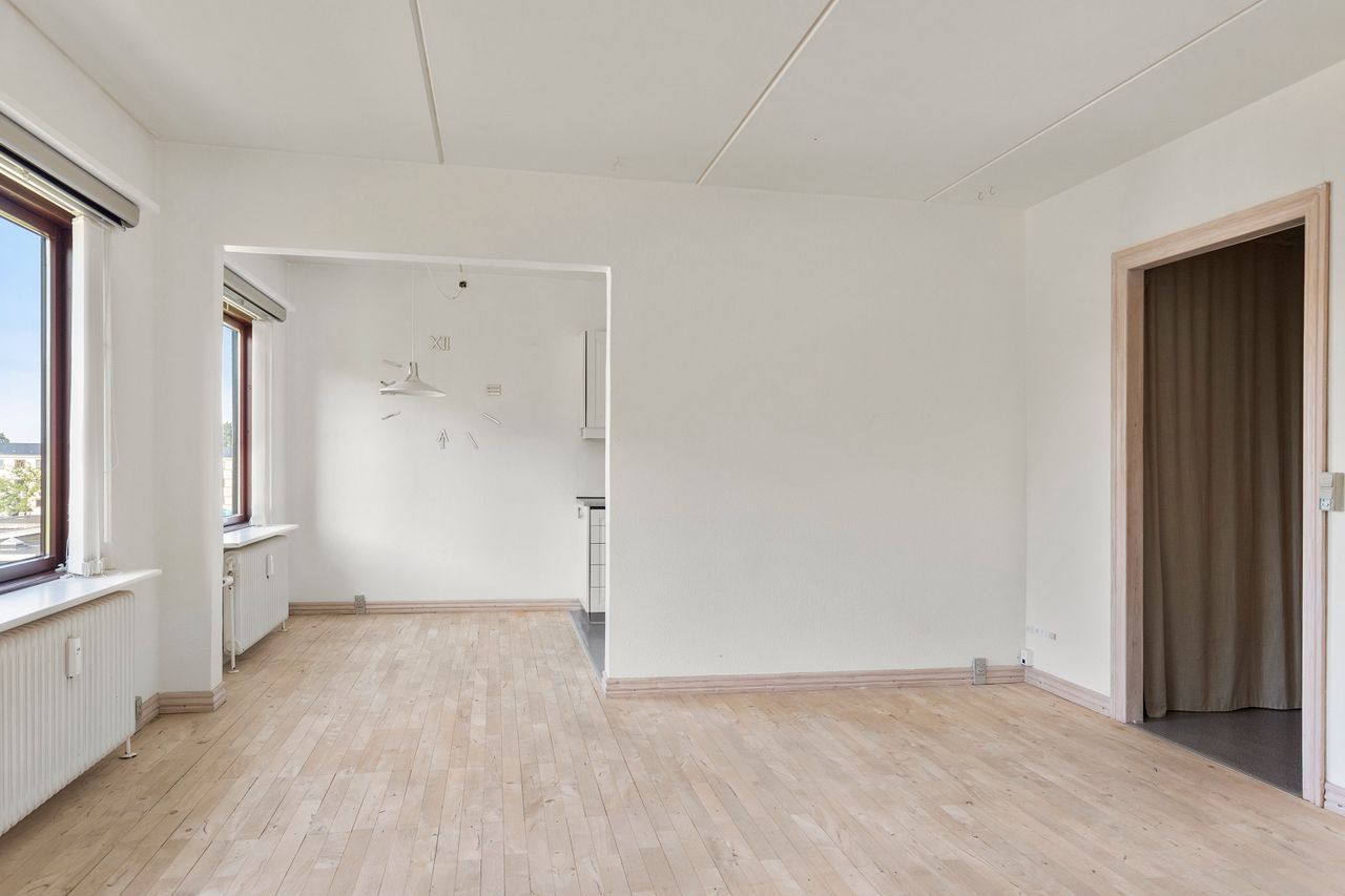 Lejligheden byder på et lyst og rummeligt køkken med god opbevaringsplads i åben forbindelse med stuen, hvilket skaber et indbydende og socialt opholdsrum med plads til både sofa- og spiseafdeling. De store vinduer givet et dejligt lysindfald og en god udsigt over området.