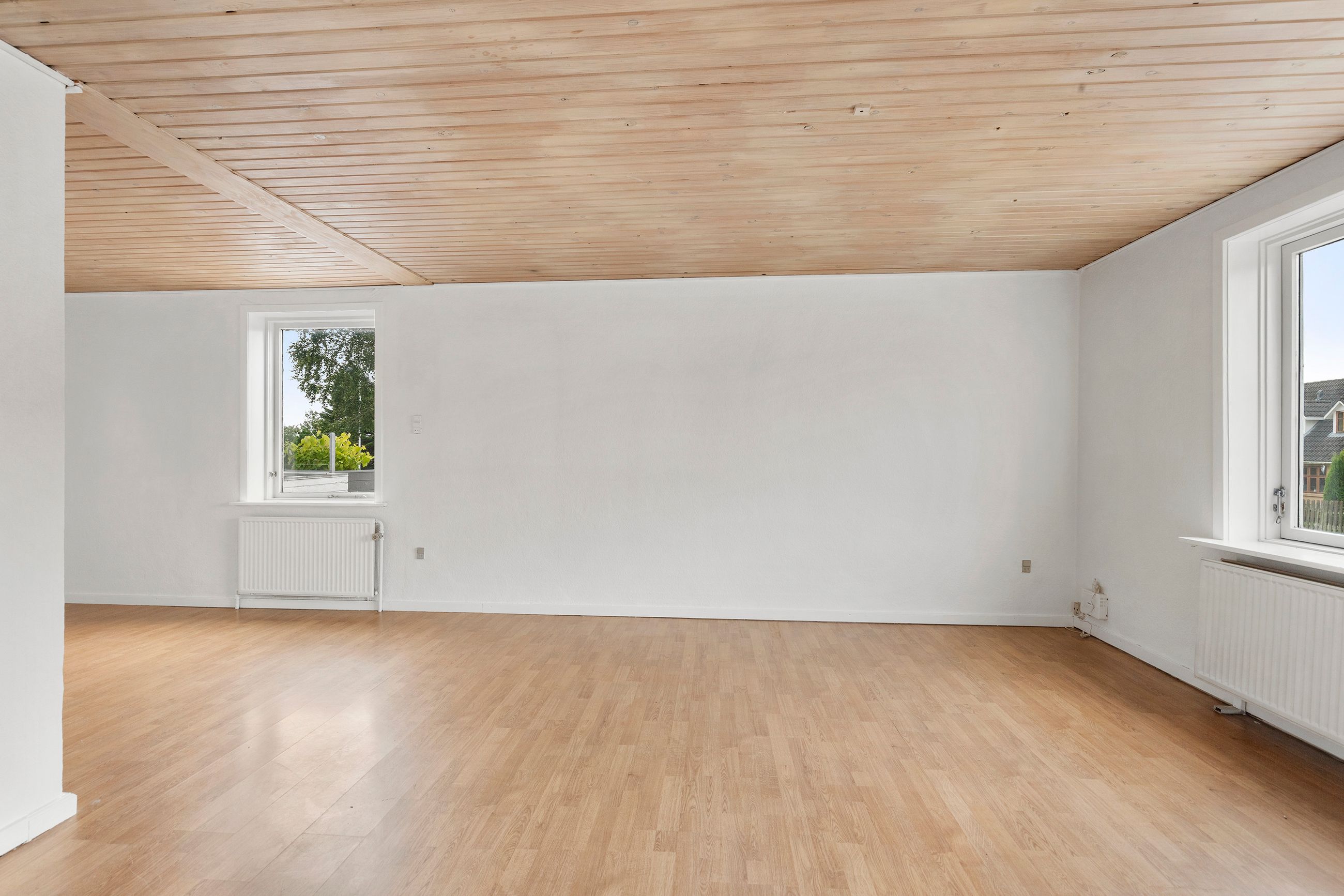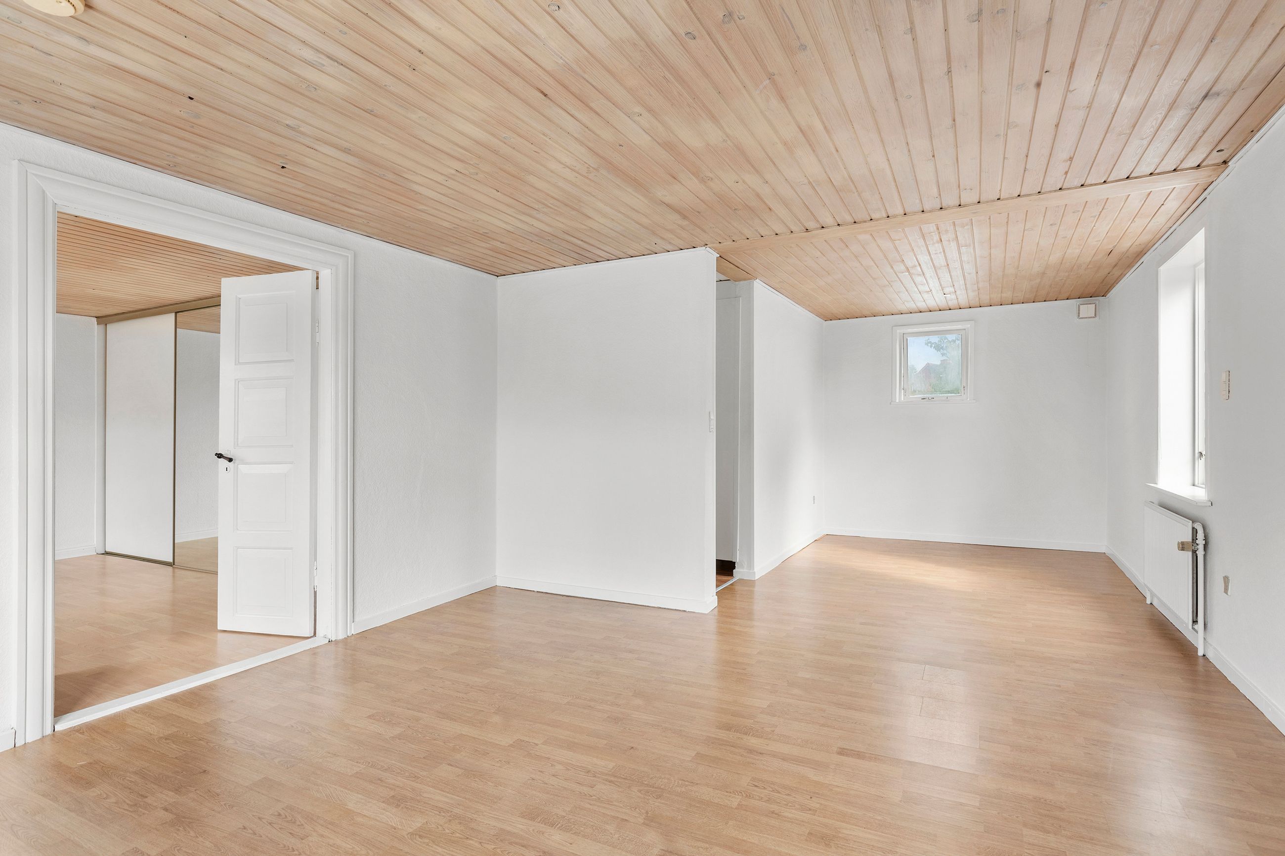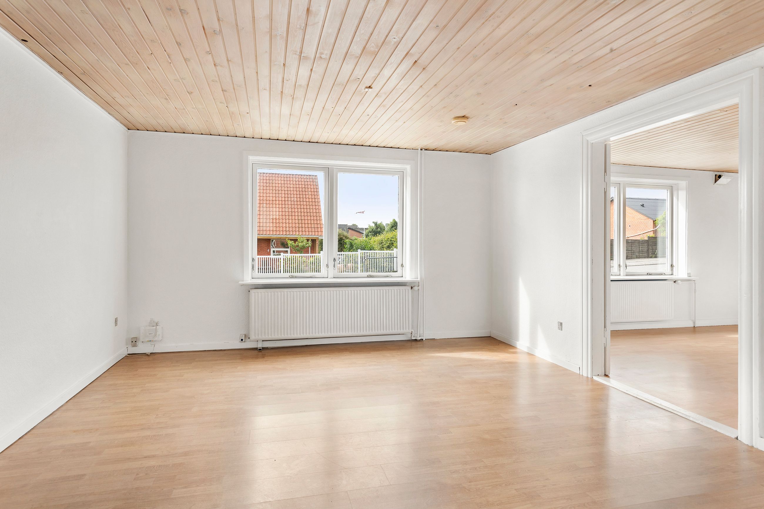 Når du træder indenfor, mødes du af en lys og rummelig stue med plads til både spiseafdeling og sofahjørne – et naturligt samlingspunkt for hele familien. Køkkenet er praktisk indrettet med god skabsplads og arbejdsflader, så madlavningen bliver en fornøjelse. På stueplan finder du desuden et værelse, der kan anvendes som kontor, gæsteværelse eller børneværelse, samt et badeværelse.