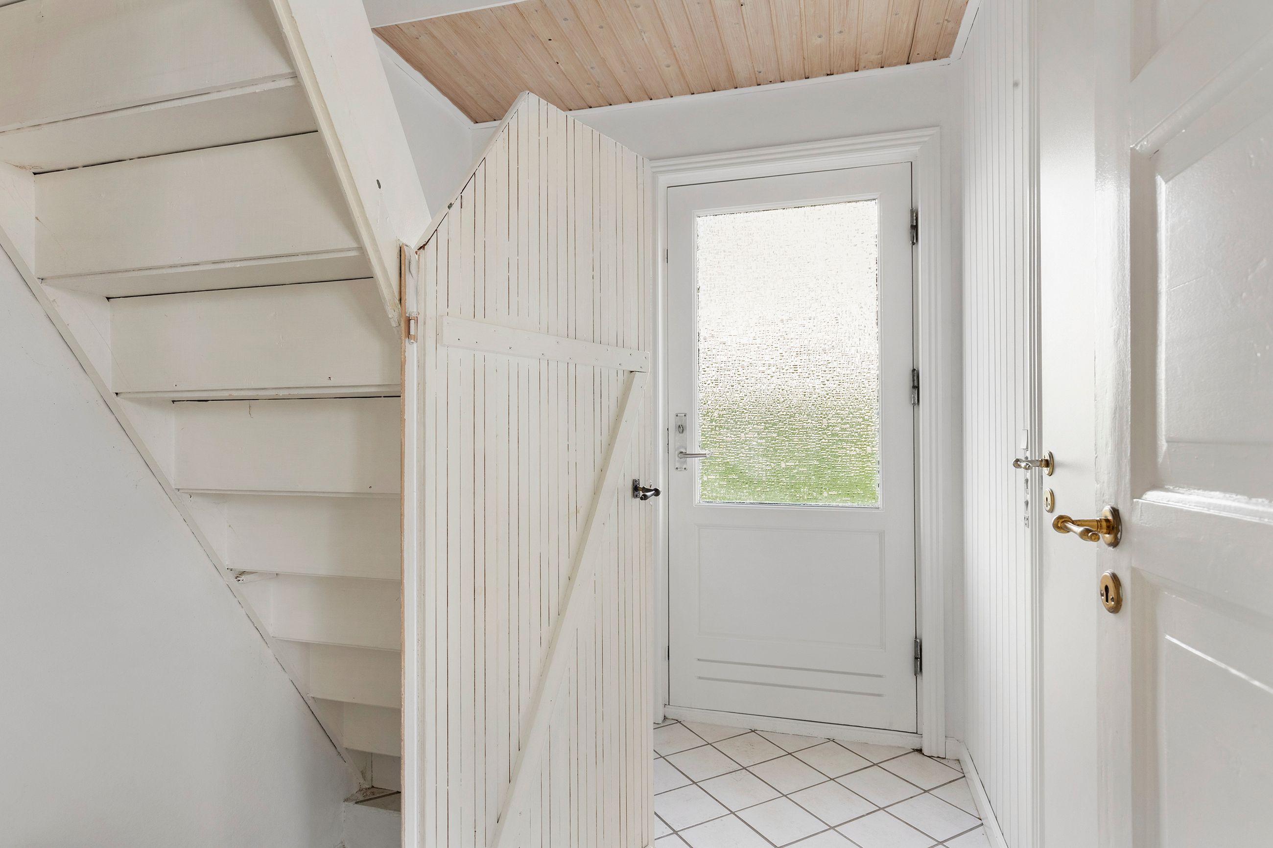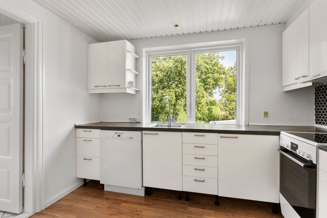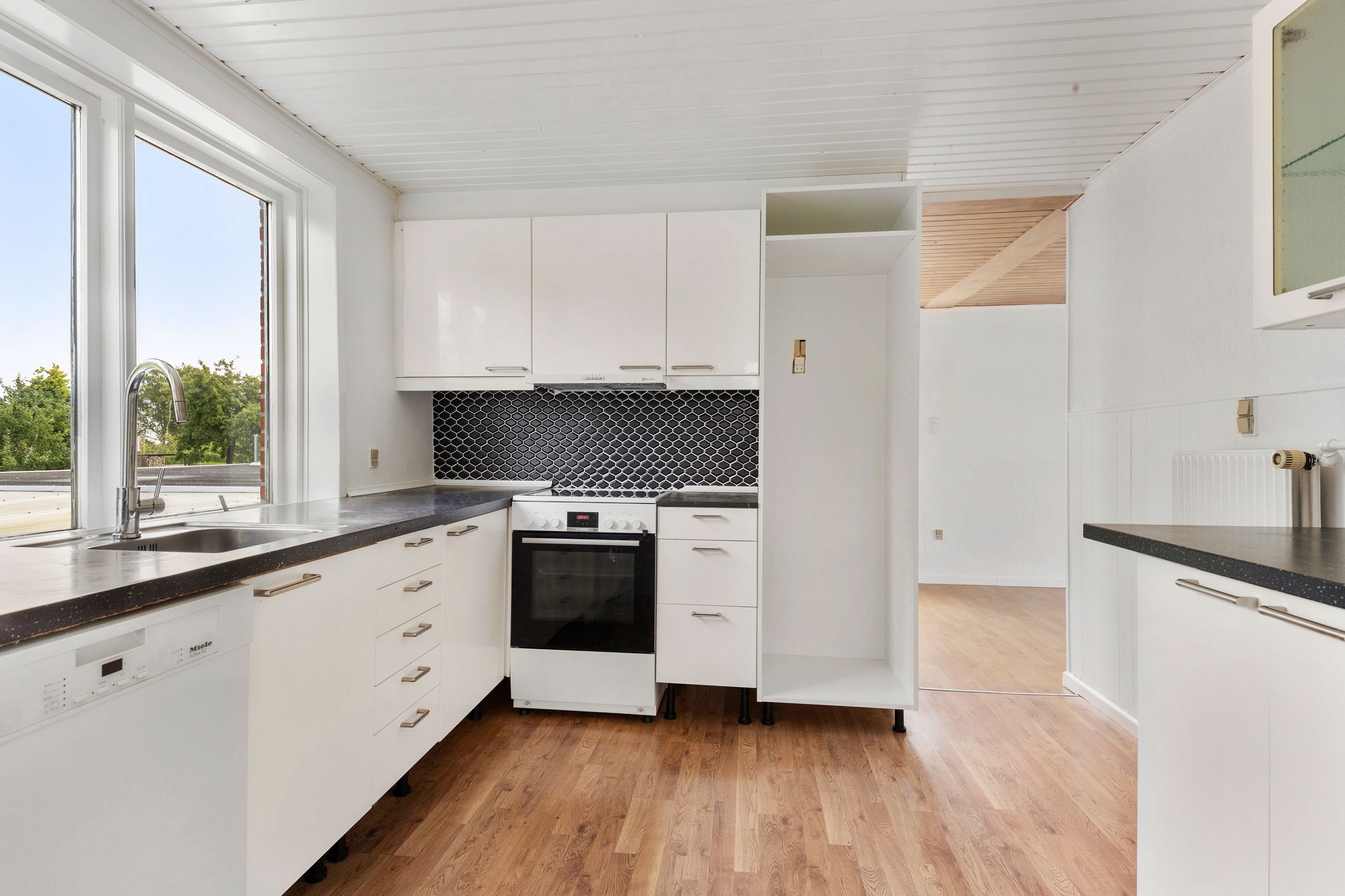 Når du træder indenfor, mødes du af en lys og rummelig stue med plads til både spiseafdeling og sofahjørne – et naturligt samlingspunkt for hele familien. Køkkenet er praktisk indrettet med god skabsplads og arbejdsflader, så madlavningen bliver en fornøjelse. På stueplan finder du desuden et værelse, der kan anvendes som kontor, gæsteværelse eller børneværelse, samt et badeværelse.