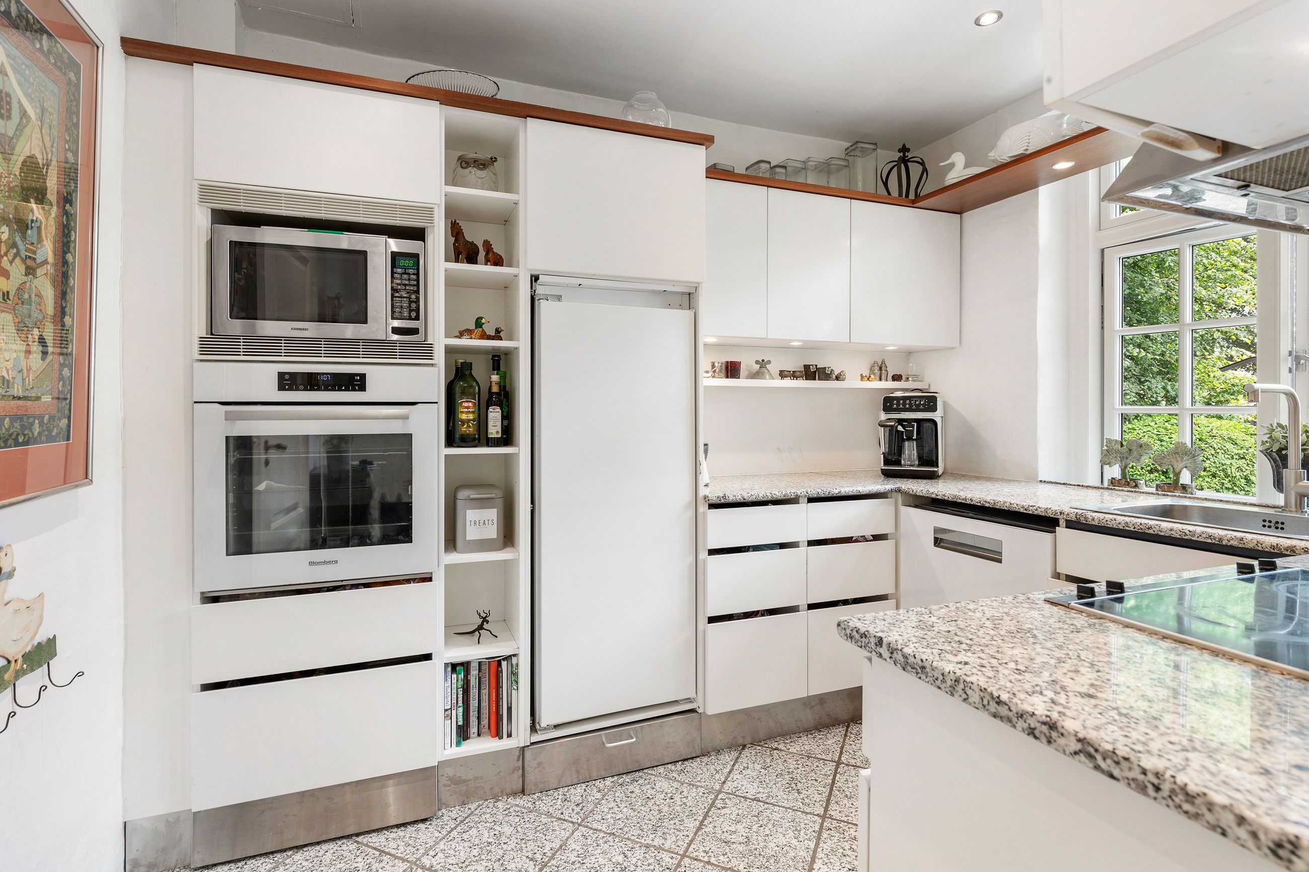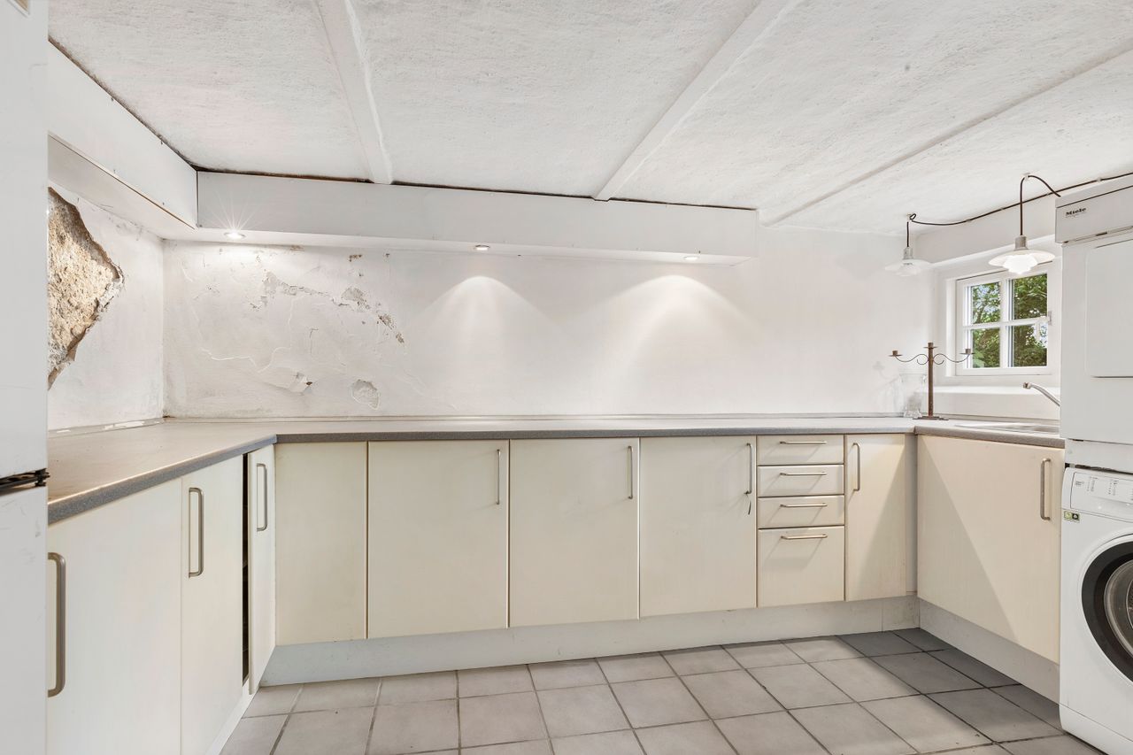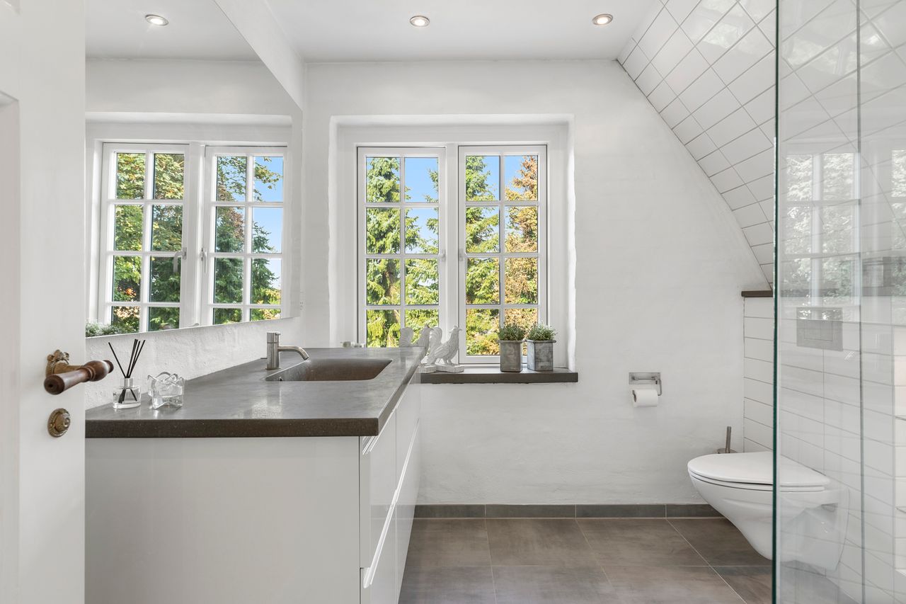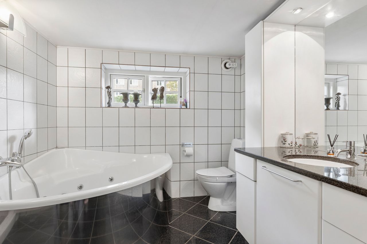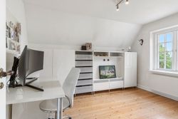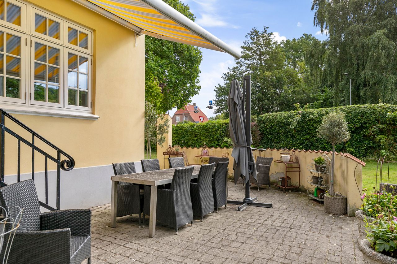 Komforten er i top med gulvvarme i badeværelser, køkken og gang. Fra huset er der udgang til en skøn terrasse, hvor du kan nyde sommerens måltider under åben himmel. Den store, frodige have med gamle træer giver både privatliv, læ og masser af plads til leg og udeliv.