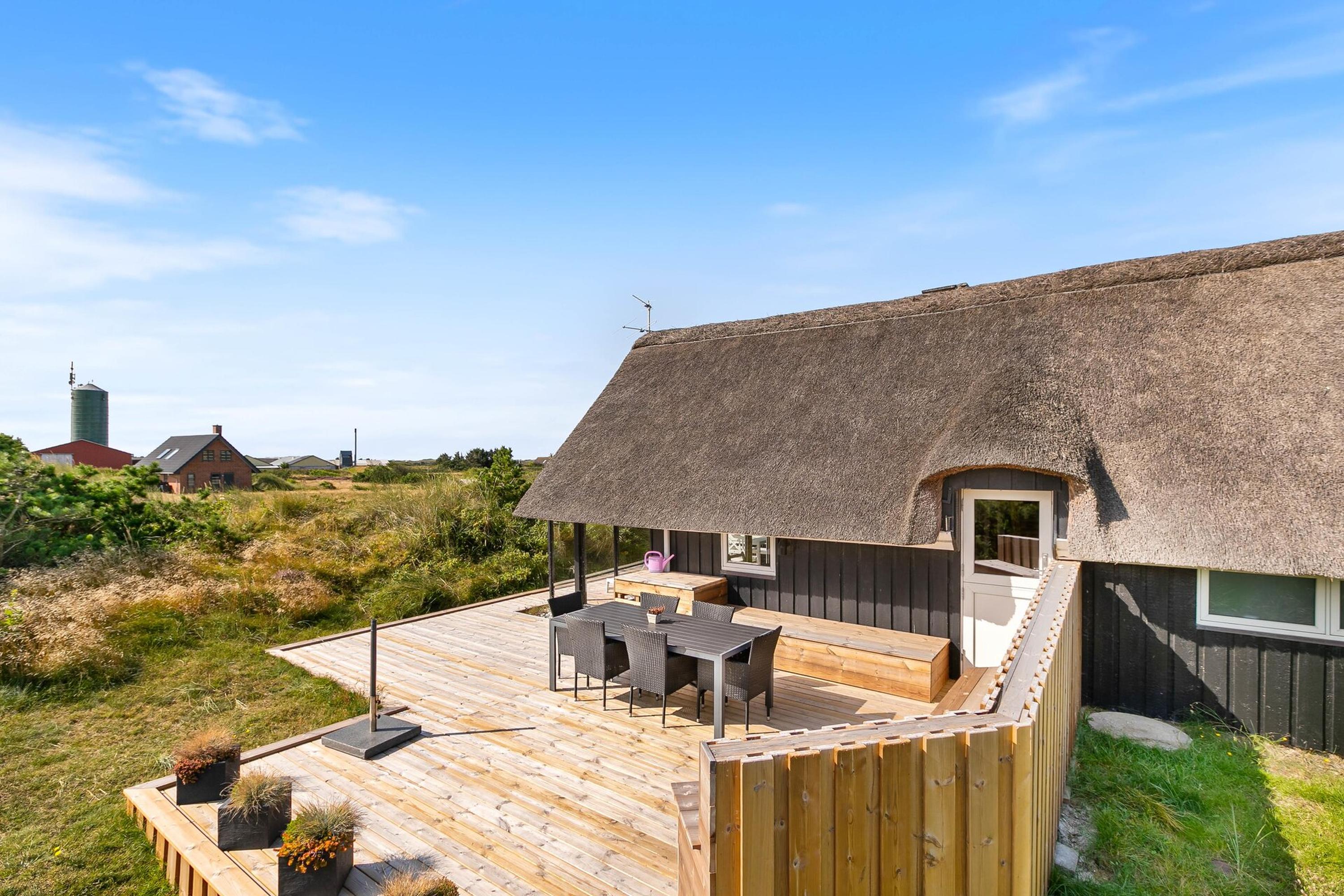 På en stor og marehalmsklædt naturgrund i det nordlige Bjerregård tilbydes det skønne, romantiske og meget fine sommerhus. Huset er opført i træ med stråtag med kvist og andre smukke detaljer, og indledningsvis bør man fremhæve den meget skønne øst- og sydvendte træterrasse, som fint binder hus,