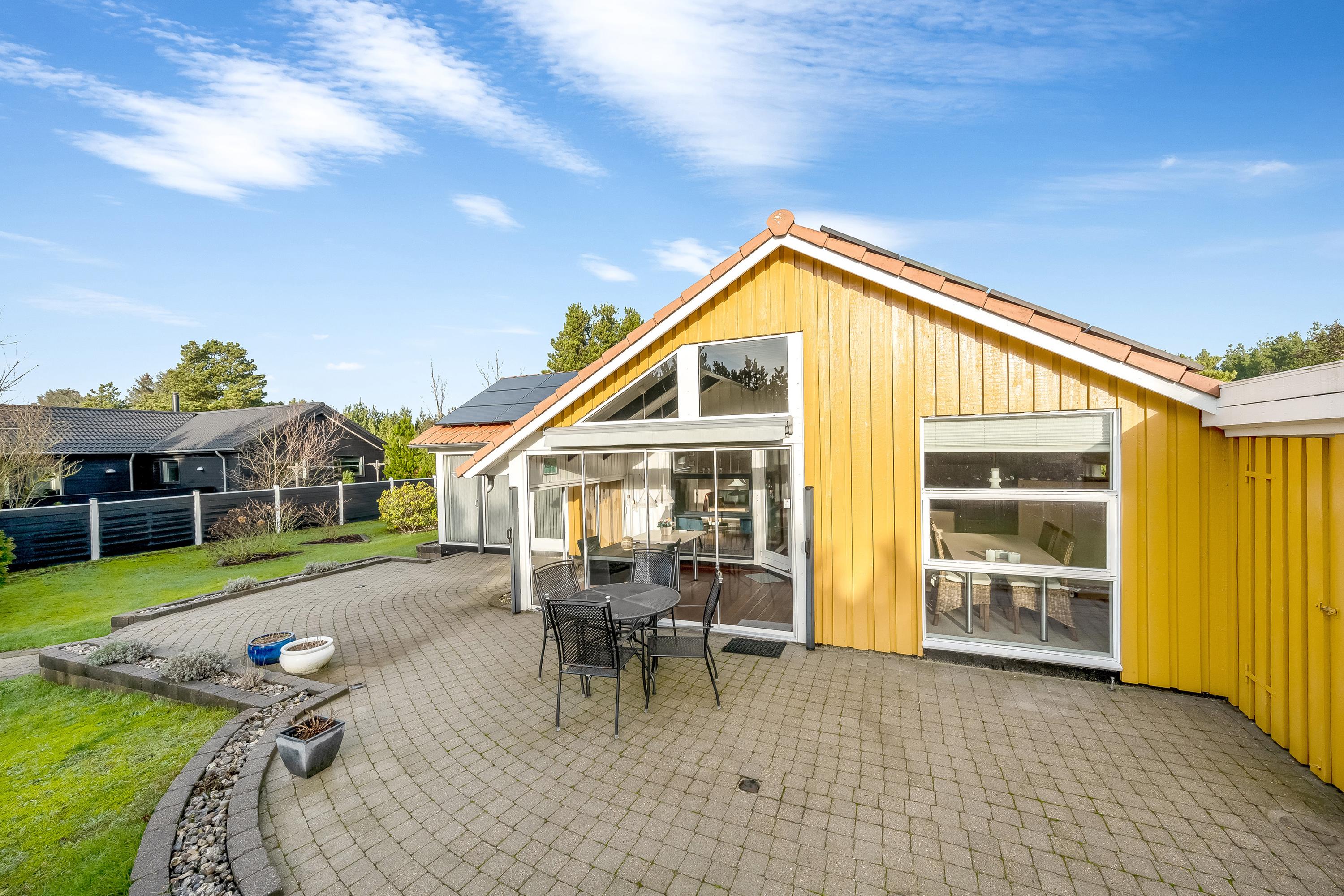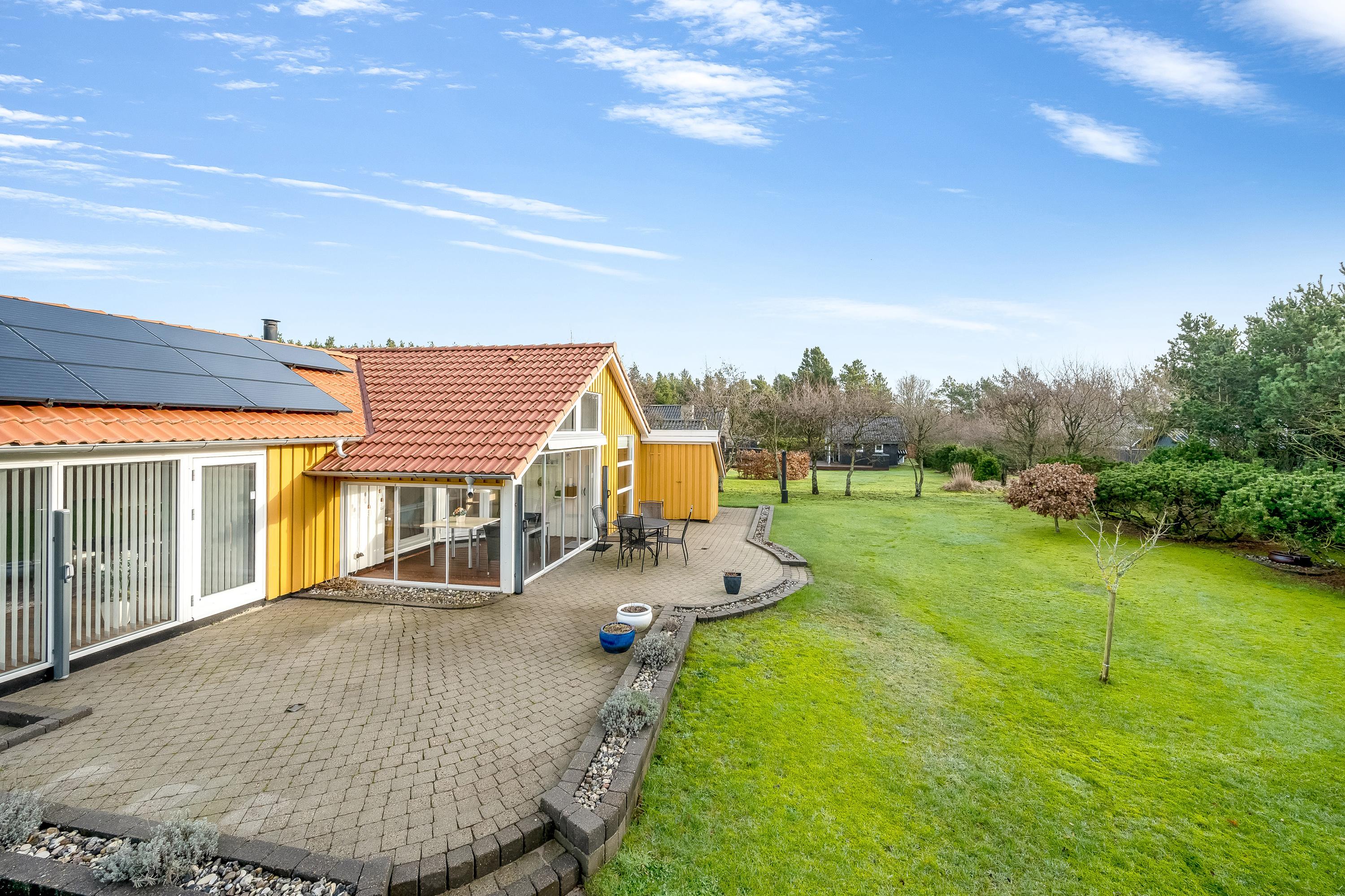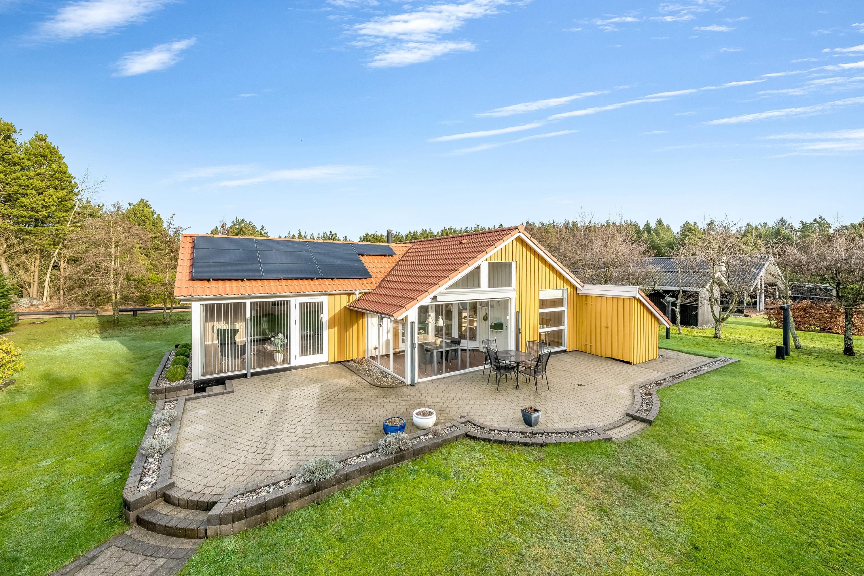 På dejlig randbeplantet grund på Skovvang i Hejbøl tæt på Blåbjerg Plantage og ikke langt fra Vesterhavet tilbydes dette rummelige og velholdte gulmalede træhus, der har røde tagsten. Der er solceller på den solvendte syde af taget. Selve huset har et boligareal på 121 m2, hvortil kommer et anneks