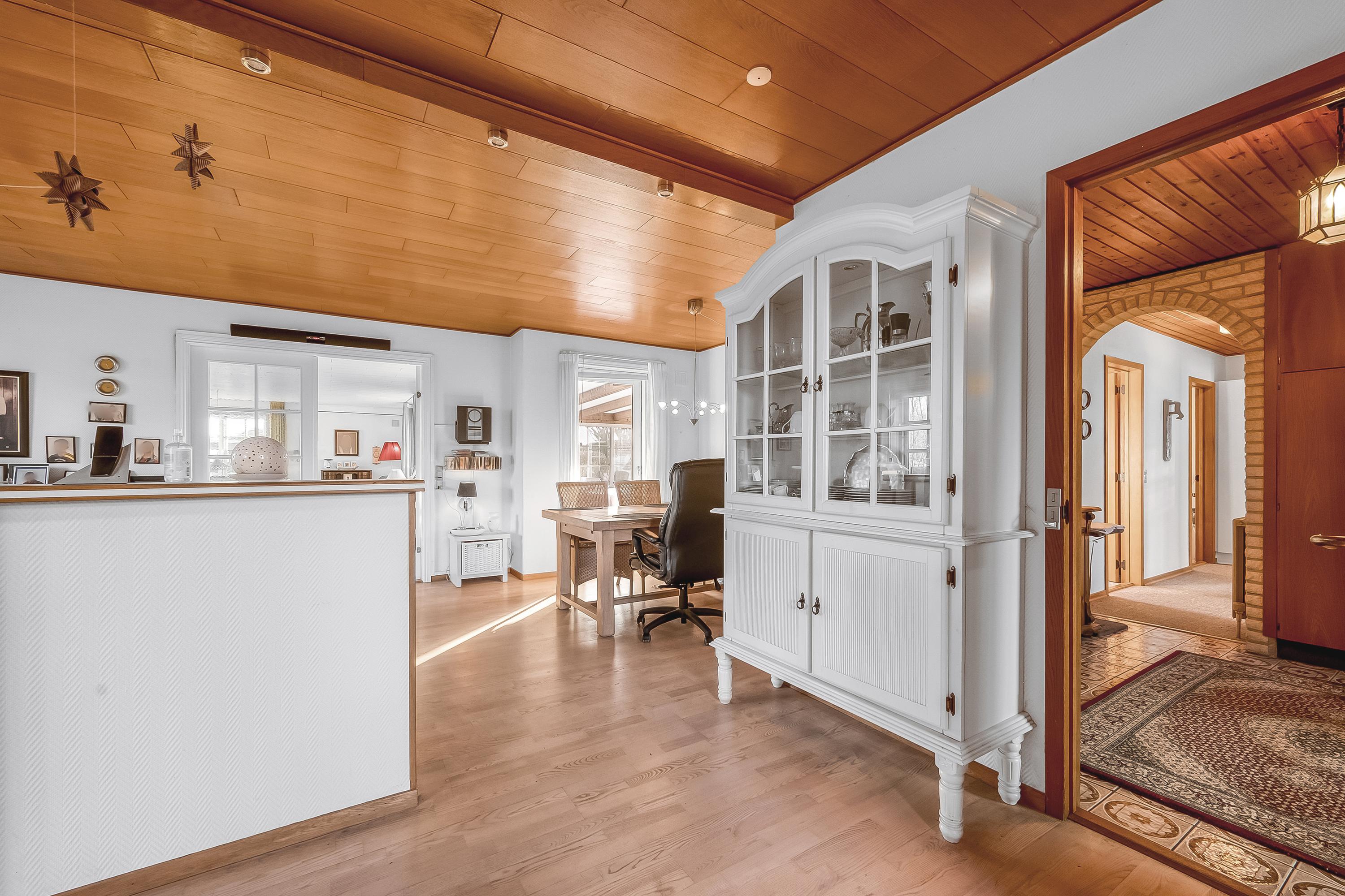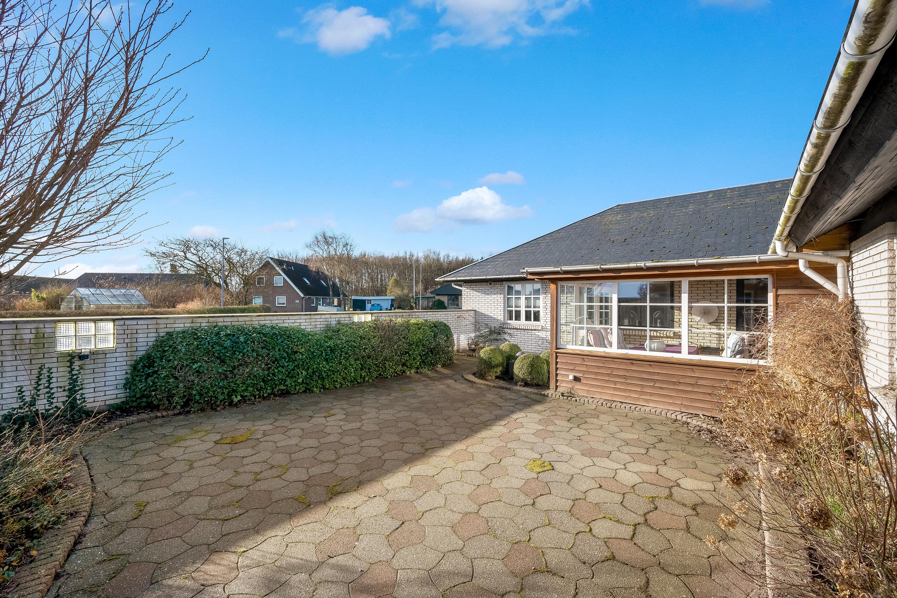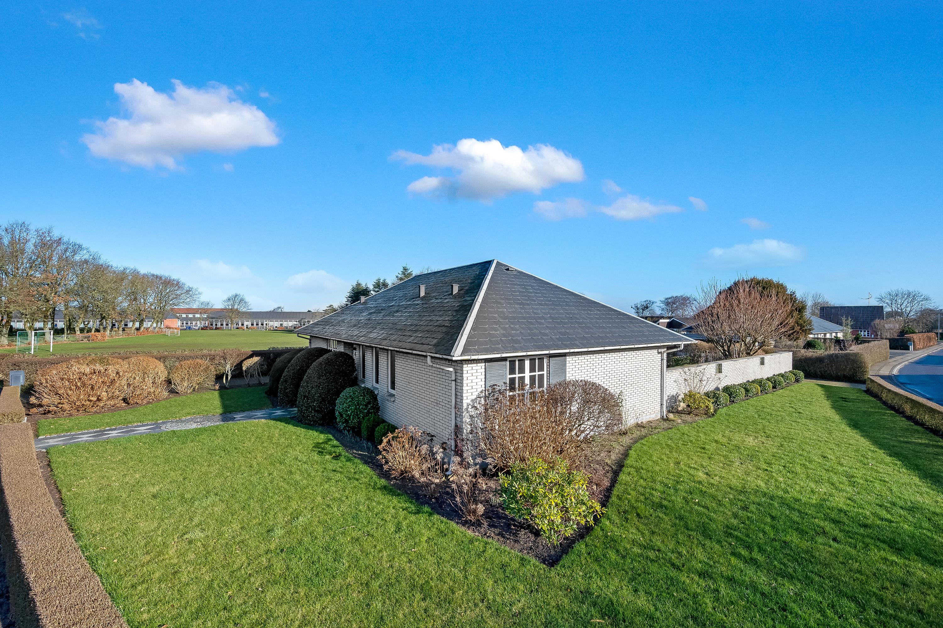 Flot vinkelbygget villa i hvide kalksandsten og med skifertag beliggende i en færdigudbygget udstykning fra 70´erne i Nr. Nebel by. Ejendommen ligger bag skolens grønne arealer tæt på stisystemer. Ejendommen er indrettet med: Baggang/grokøkken m. adgang til viktualierum, u-formet køkken med